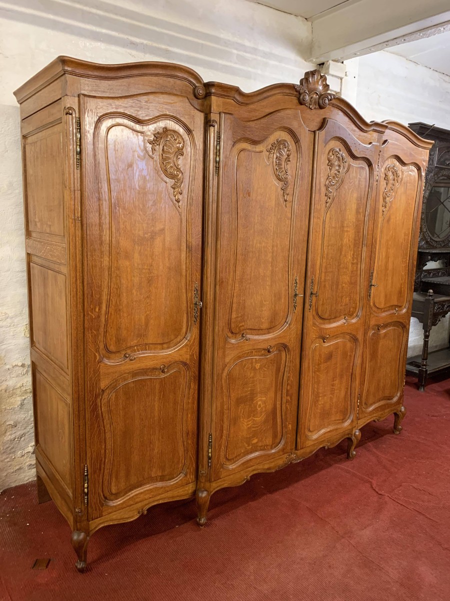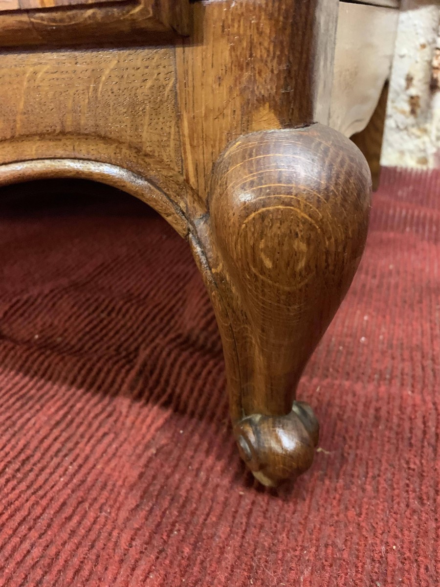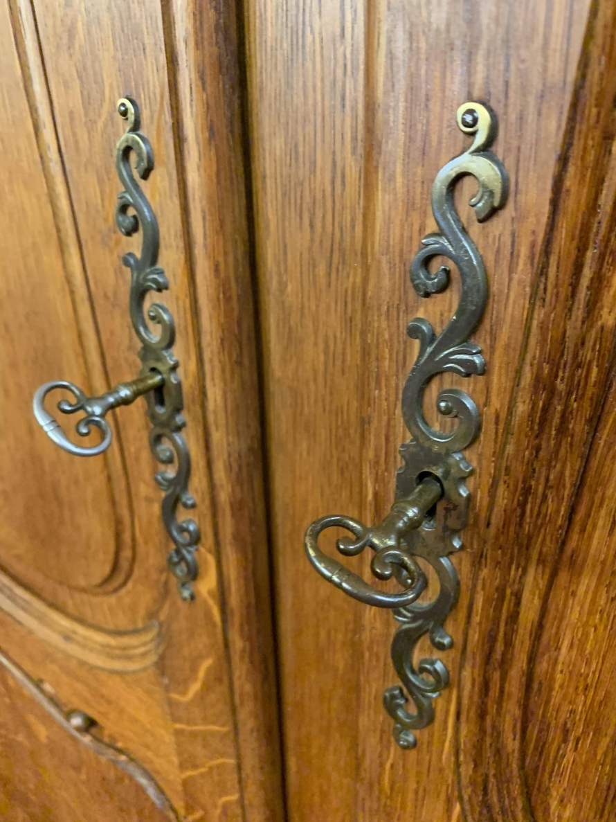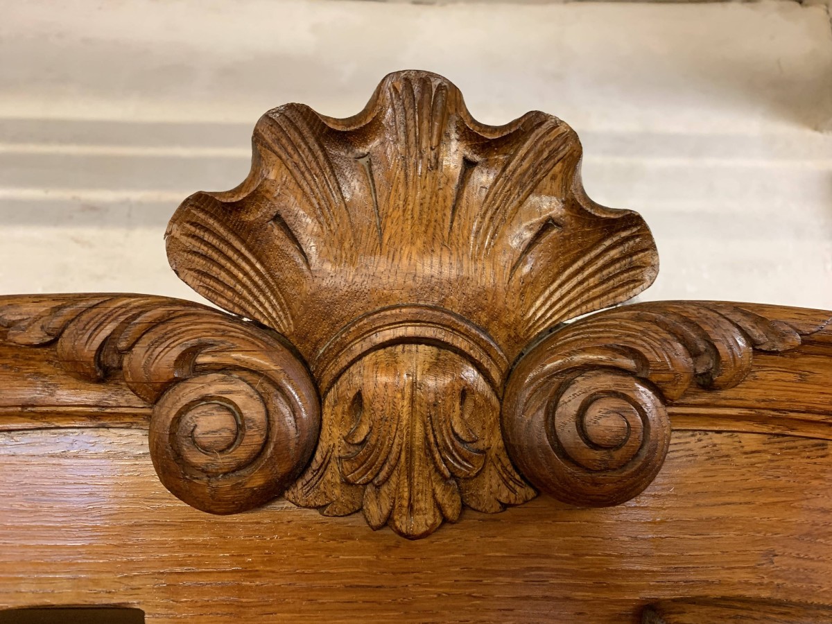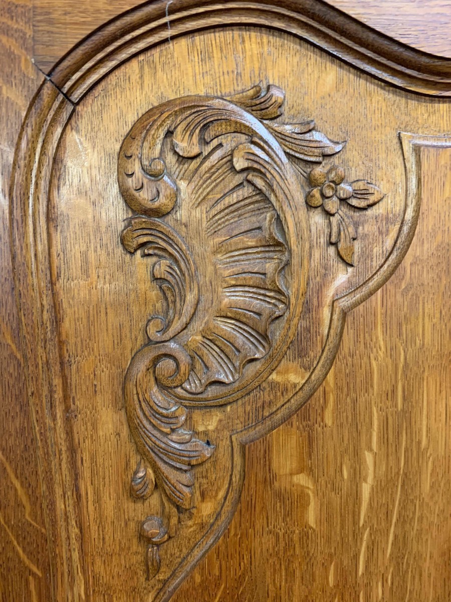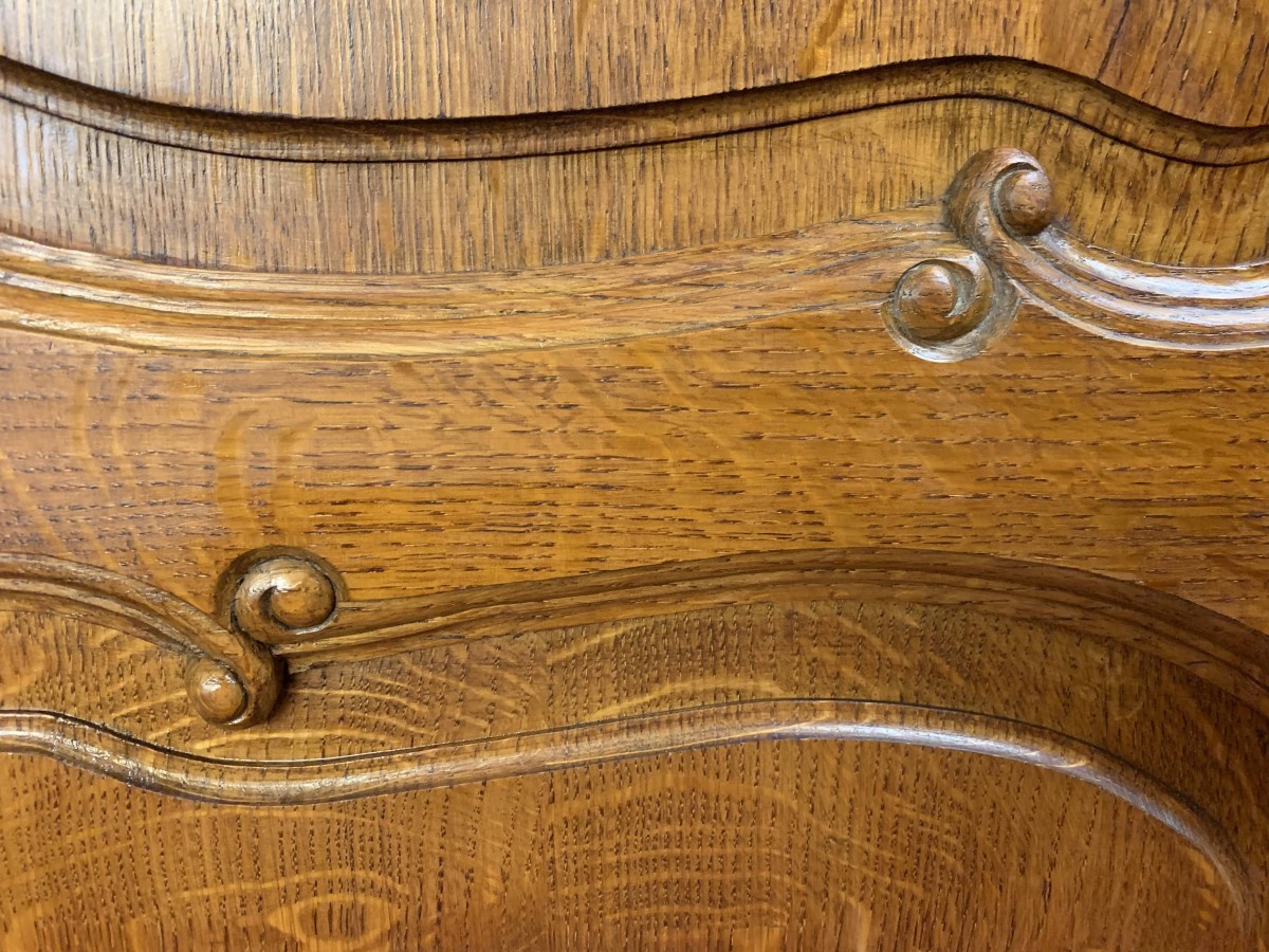 The stylish shaped top rises to ornate central carving. Below are four carved recessed panelled oak lockable doors,the pair of central doors being breakfront. Each door has brass hinges, escutcheon and key. The left hand door and pair of central brakefront doors open to reveal a wooden shelf above a brass hanging rail. The right-hand door opens to reveal three removable shelves, there is a drawer below the middle shelf. Recessed panelled sides, shaped skirt with central ornate carving. This fantastic wardrobe sits on four carved cabriole legs to the front. Please note the wardrobe splits down for easy transportation and delivery.