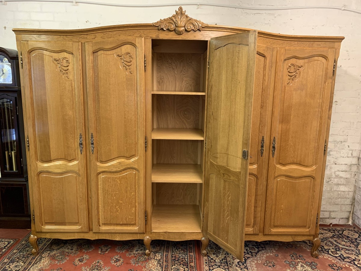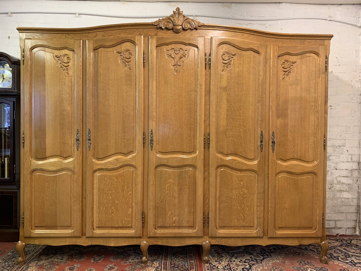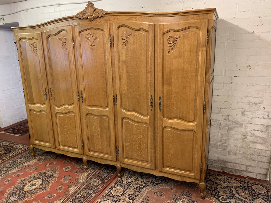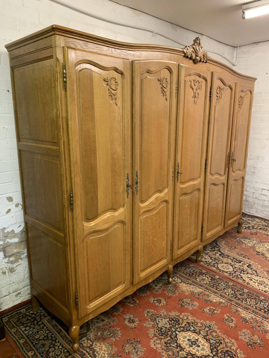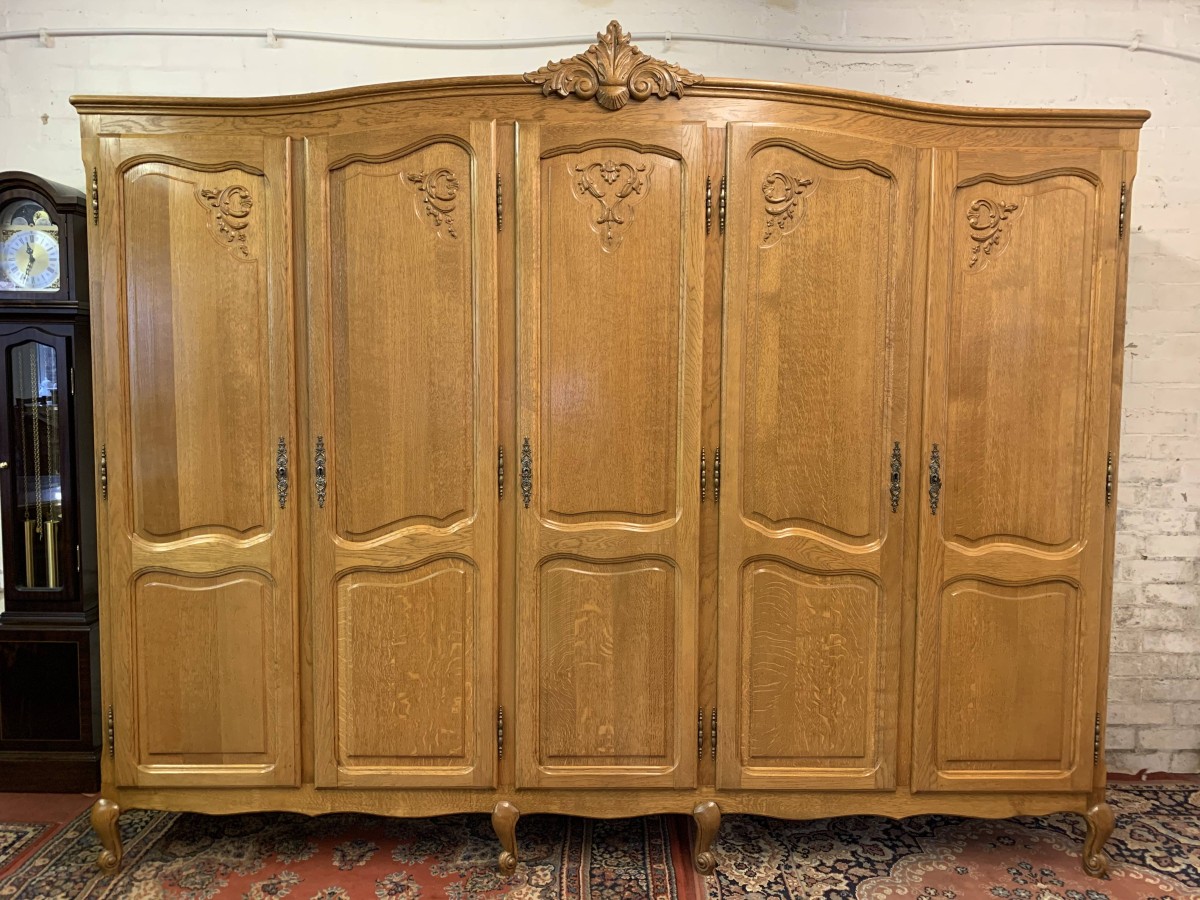 The shaped over sailing top rises to an ornate central carving. Below are five lockable carved recessed panelled doors. Each door has brass hinges and decorative brass escutcheon. The two left-hand doors and two right-hand doors open to reveal a brass hanging rail. The central door opens to reveal three removable shelves,the armoire offers ample storage. Recessed panelled sides, shaped skirt, this exceptional French armoire stands on four carved shaped cabriole legs to the front.