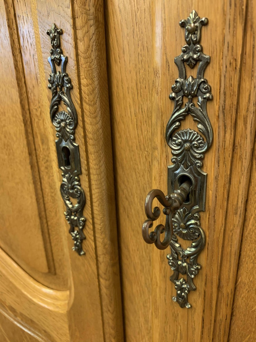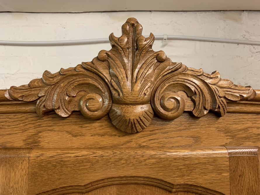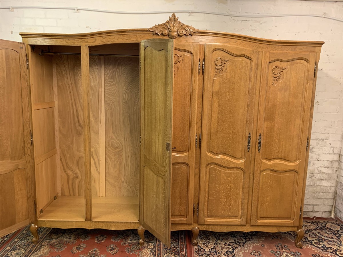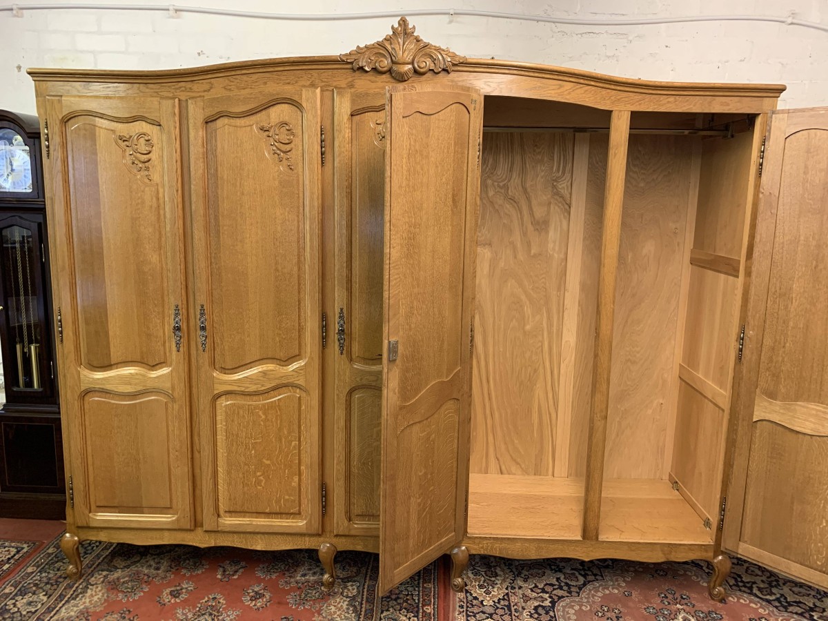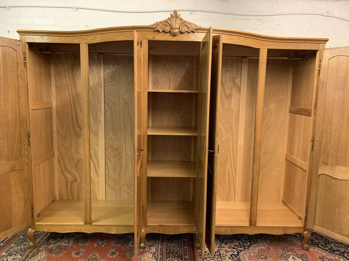 The shaped over sailing top rises to an ornate central carving. Below are five lockable carved recessed panelled doors. Each door has brass hinges and decorative brass escutcheon. The two left-hand doors and two right-hand doors open to reveal a brass hanging rail. The central door opens to reveal three removable shelves,the armoire offers ample storage. Recessed panelled sides, shaped skirt, this exceptional French armoire stands on four carved shaped cabriole legs to the front.