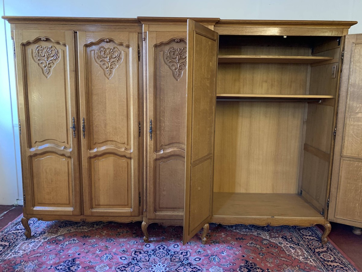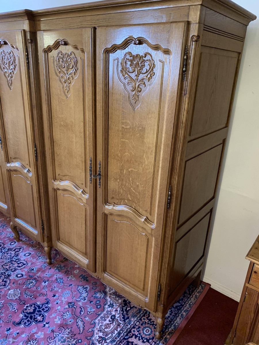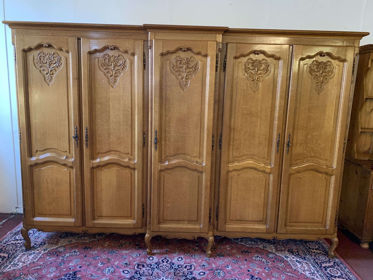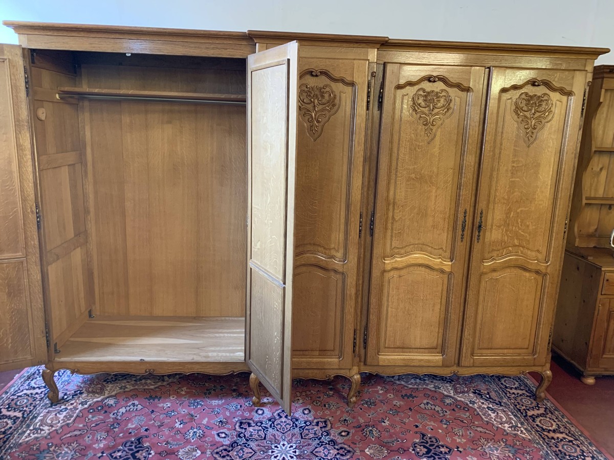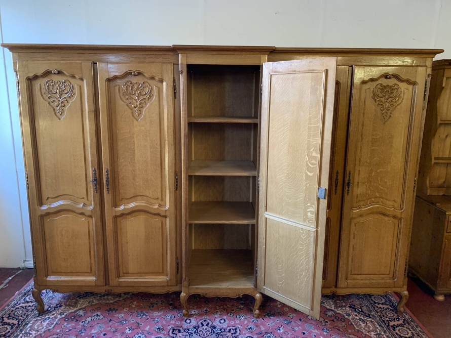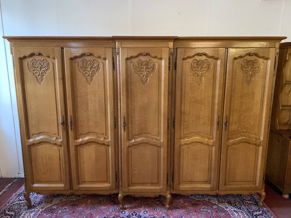 The over sailing top sits above five carved shaped recessed panelled lockable doors, the central door bening brakefront. Each door has brass hinges and decorative escutcheon. The left-hand pair of doors open to reveal a shelf above a brass hanging rail. The central brake front door opens to reveal three good sized removable shelves. The right-hand pair of doors open to reveal two removable shelves and a brass hanging rail. Recessed panelled sides, shaped carved skirt this stunning armoire stands on four carved shaped cabriole legs to the front. The armoire is in excellent condition. Please note this armoire splits down for easy transportation and delivery into any home.