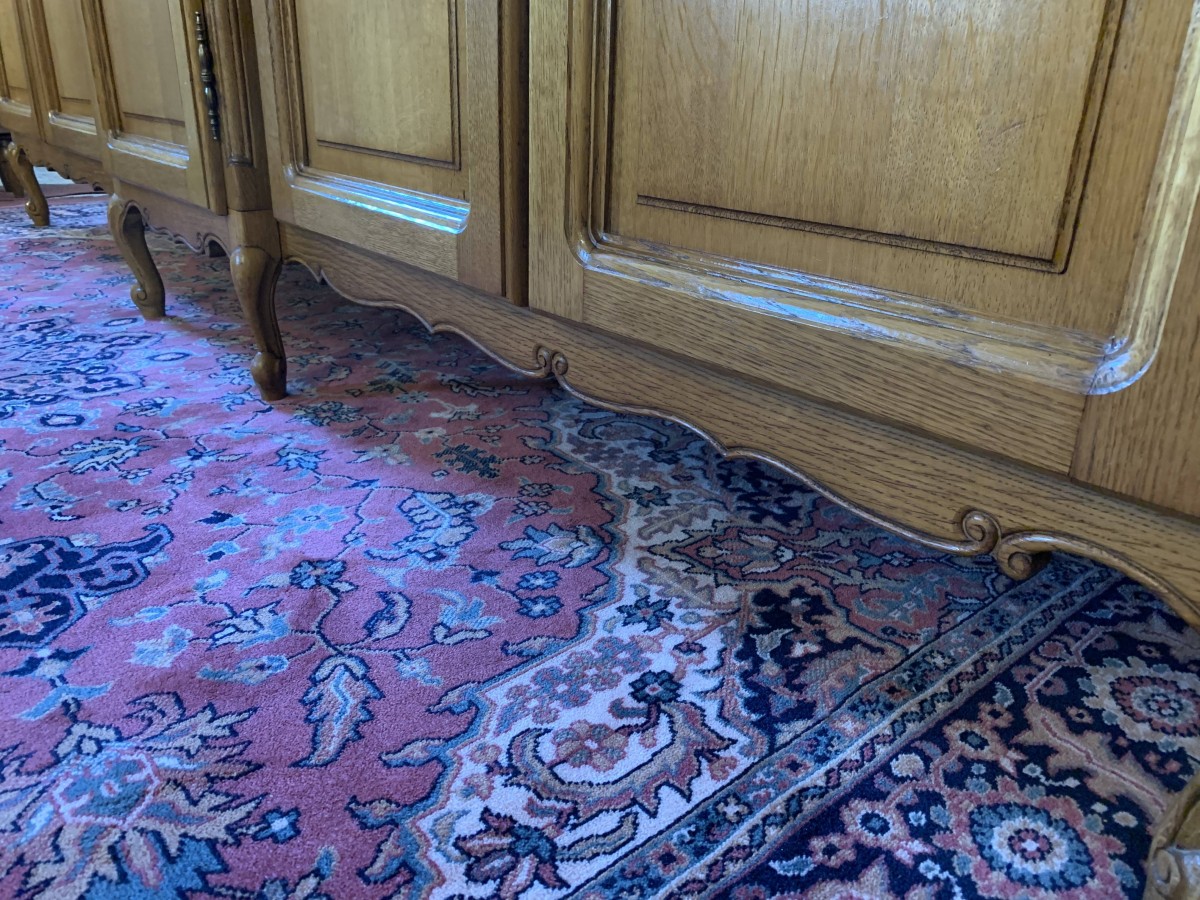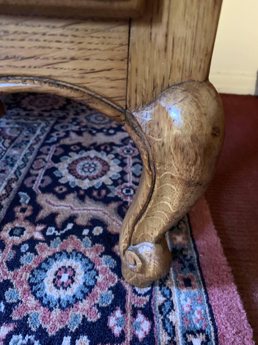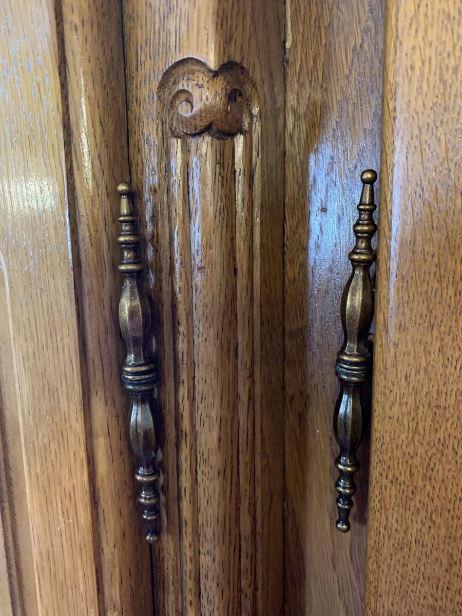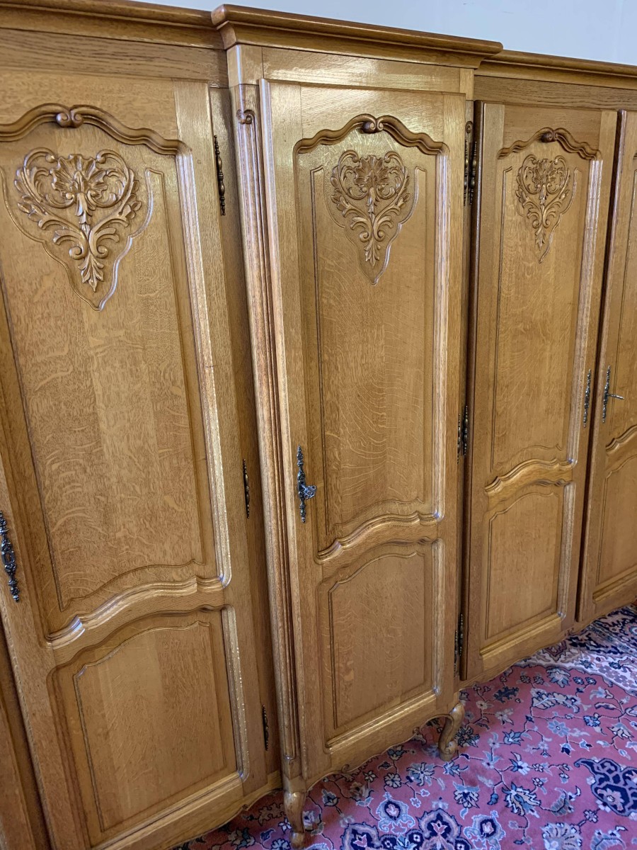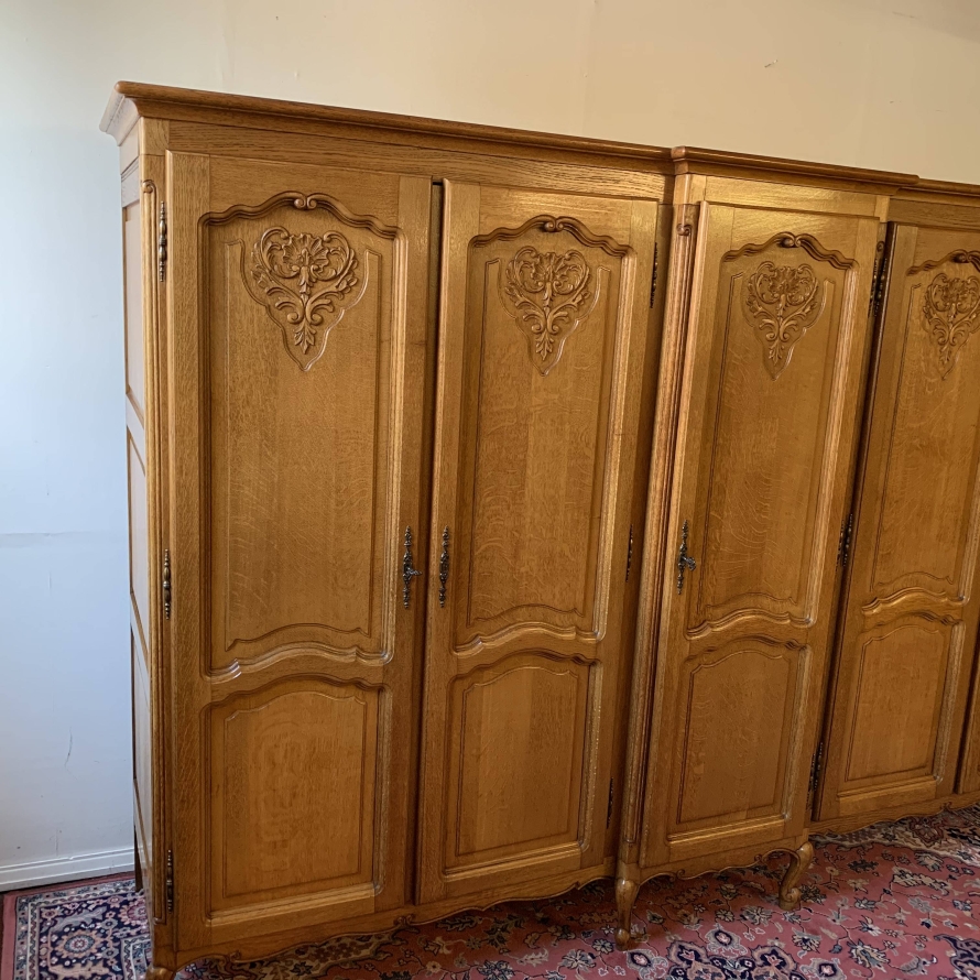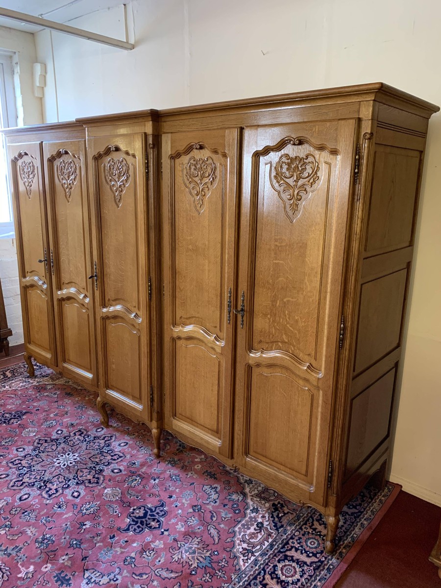 The over sailing top sits above five carved shaped recessed panelled lockable doors, the central door bening brakefront. Each door has brass hinges and decorative escutcheon. The left-hand pair of doors open to reveal a shelf above a brass hanging rail. The central brake front door opens to reveal three good sized removable shelves. The right-hand pair of doors open to reveal two removable shelves and a brass hanging rail. Recessed panelled sides, shaped carved skirt this stunning armoire stands on four carved shaped cabriole legs to the front. The armoire is in excellent condition. Please note this armoire splits down for easy transportation and delivery into any home.