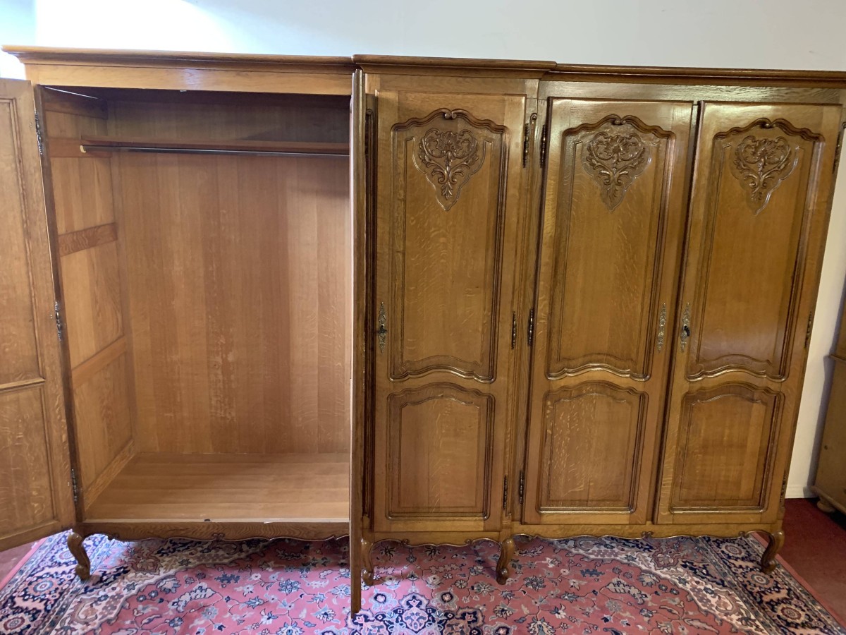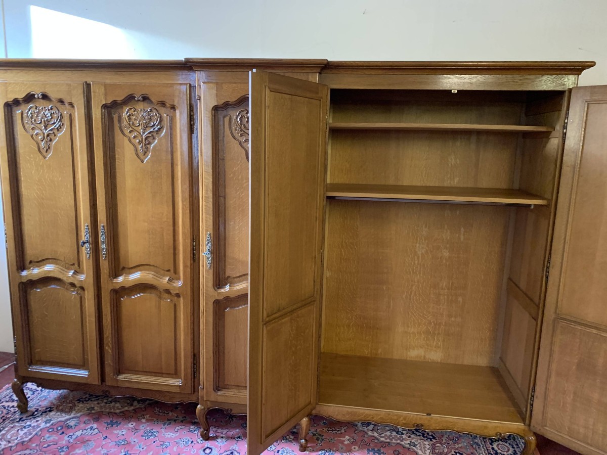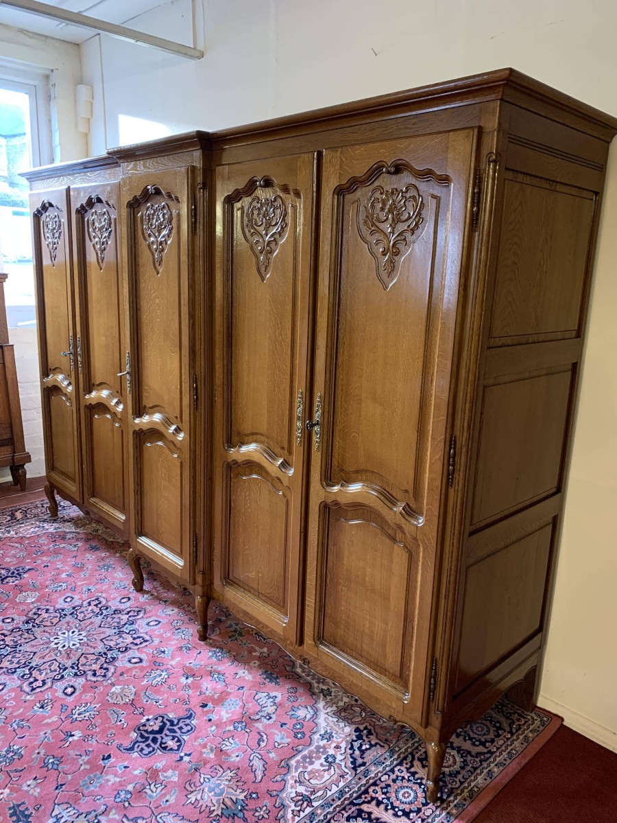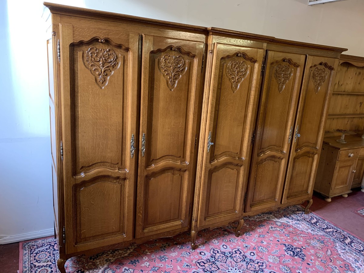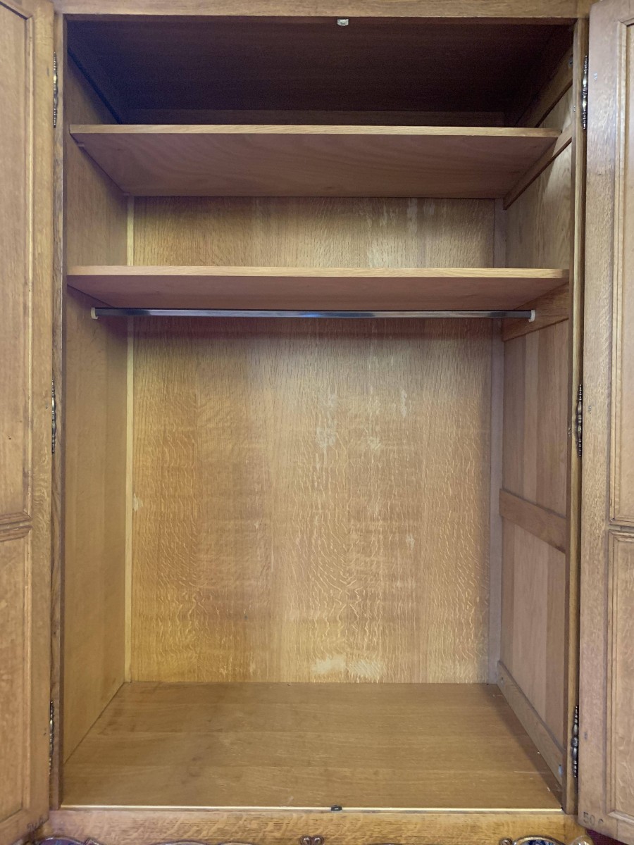 The oversailing top sits above five carved recessed panelled lockable doors, the central door being brakefront. Each door has brass hinges and decorative escutcheon. The two left-hand doors is open to reveal a hanging rail with a shelf above, the central brakefront door opens to reveal three removable shelves. The right-hand pair of doors open to reveal two removable shelves with hanging rail below. The armoire offers fantastic storage space. Recessed panelled sides shaped skirt, this stunning armoire stands on four elegant carved cabriole legs to the front.