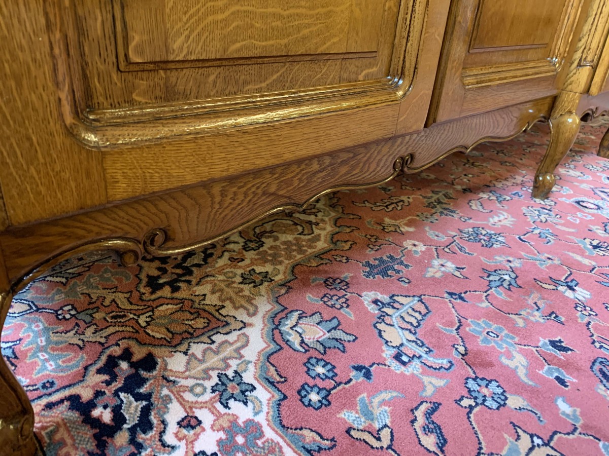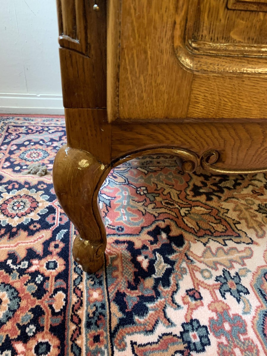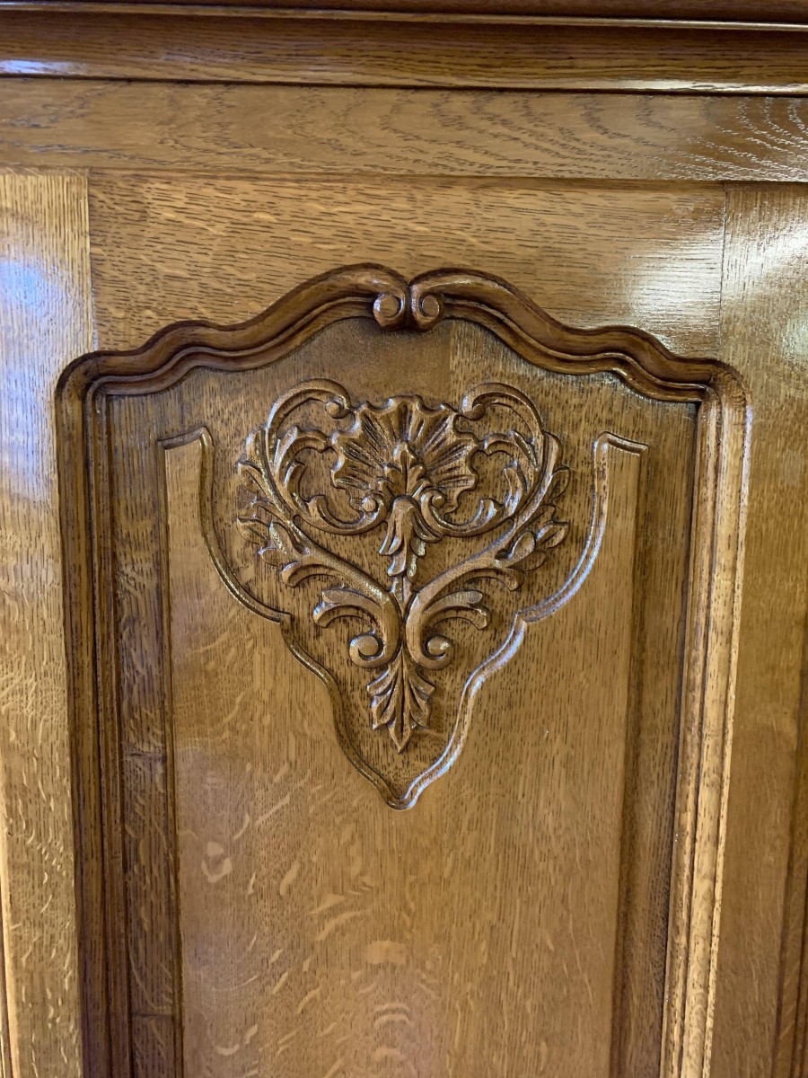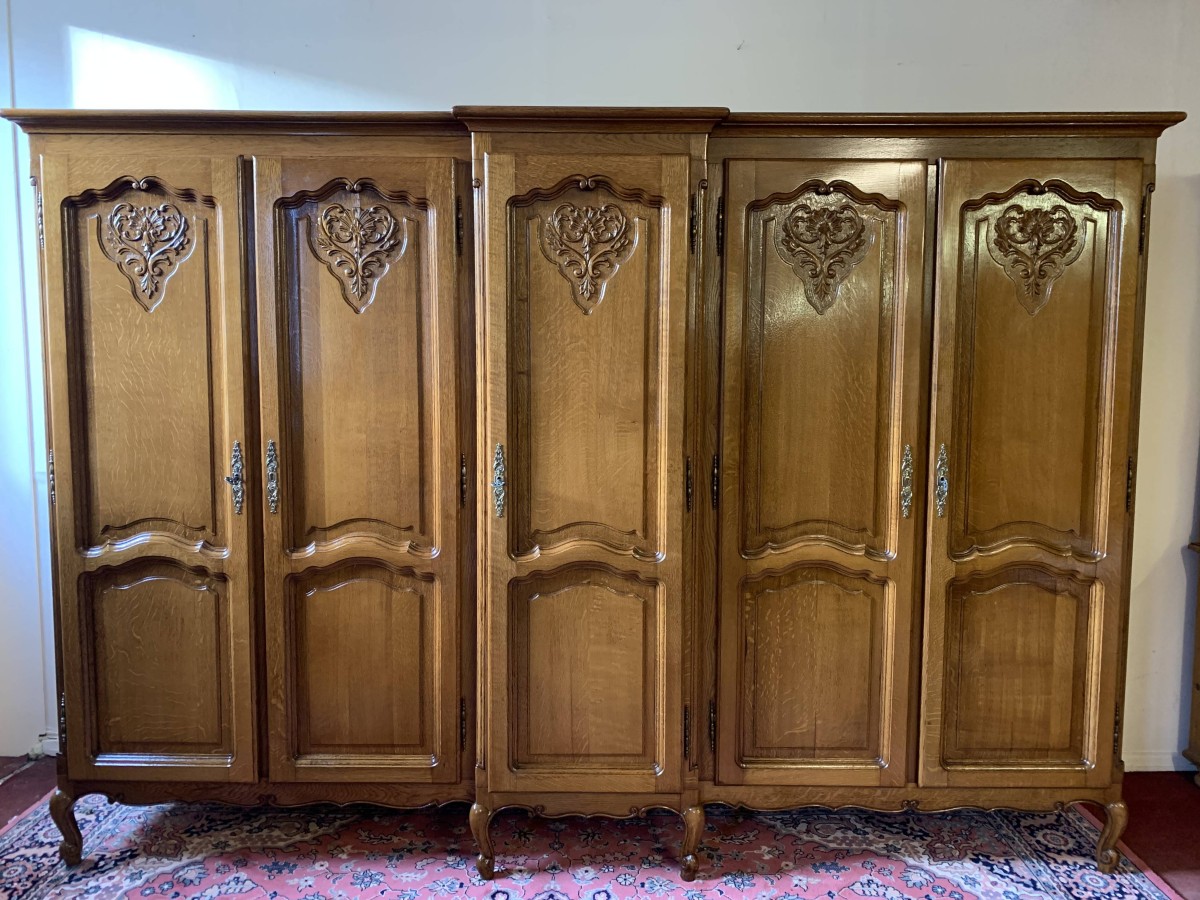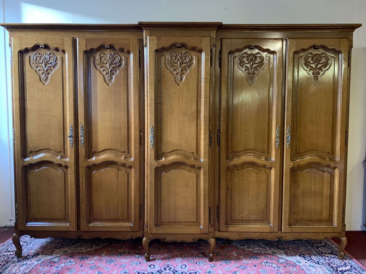 The oversailing top sits above five carved recessed panelled lockable doors, the central door being brakefront. Each door has brass hinges and decorative escutcheon. The two left-hand doors is open to reveal a hanging rail with a shelf above, the central brakefront door opens to reveal three removable shelves. The right-hand pair of doors open to reveal two removable shelves with hanging rail below. The armoire offers fantastic storage space. Recessed panelled sides shaped skirt, this stunning armoire stands on four elegant carved cabriole legs to the front.