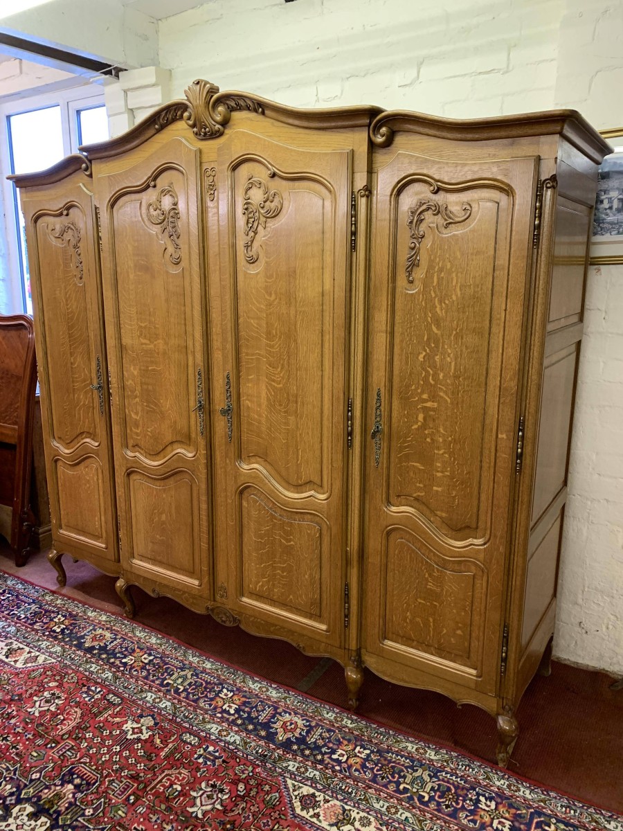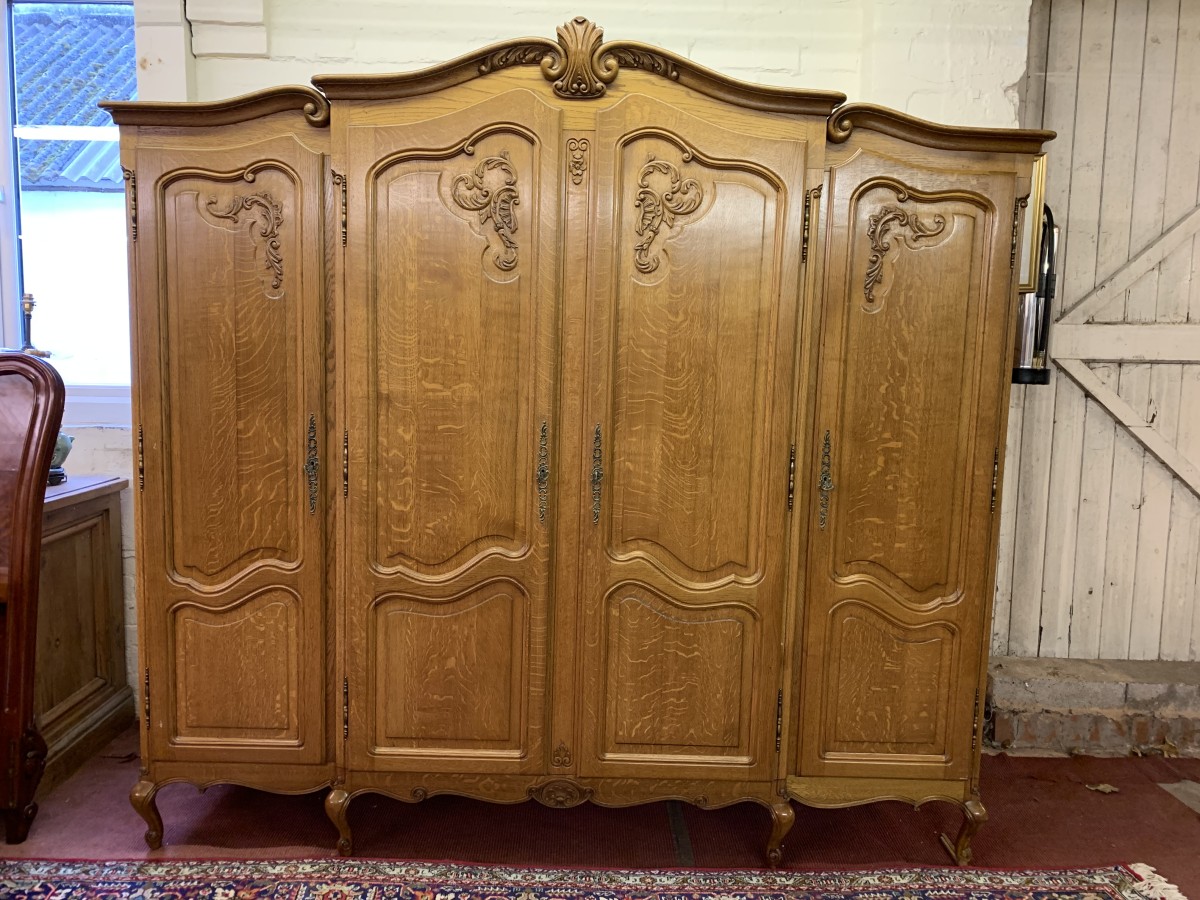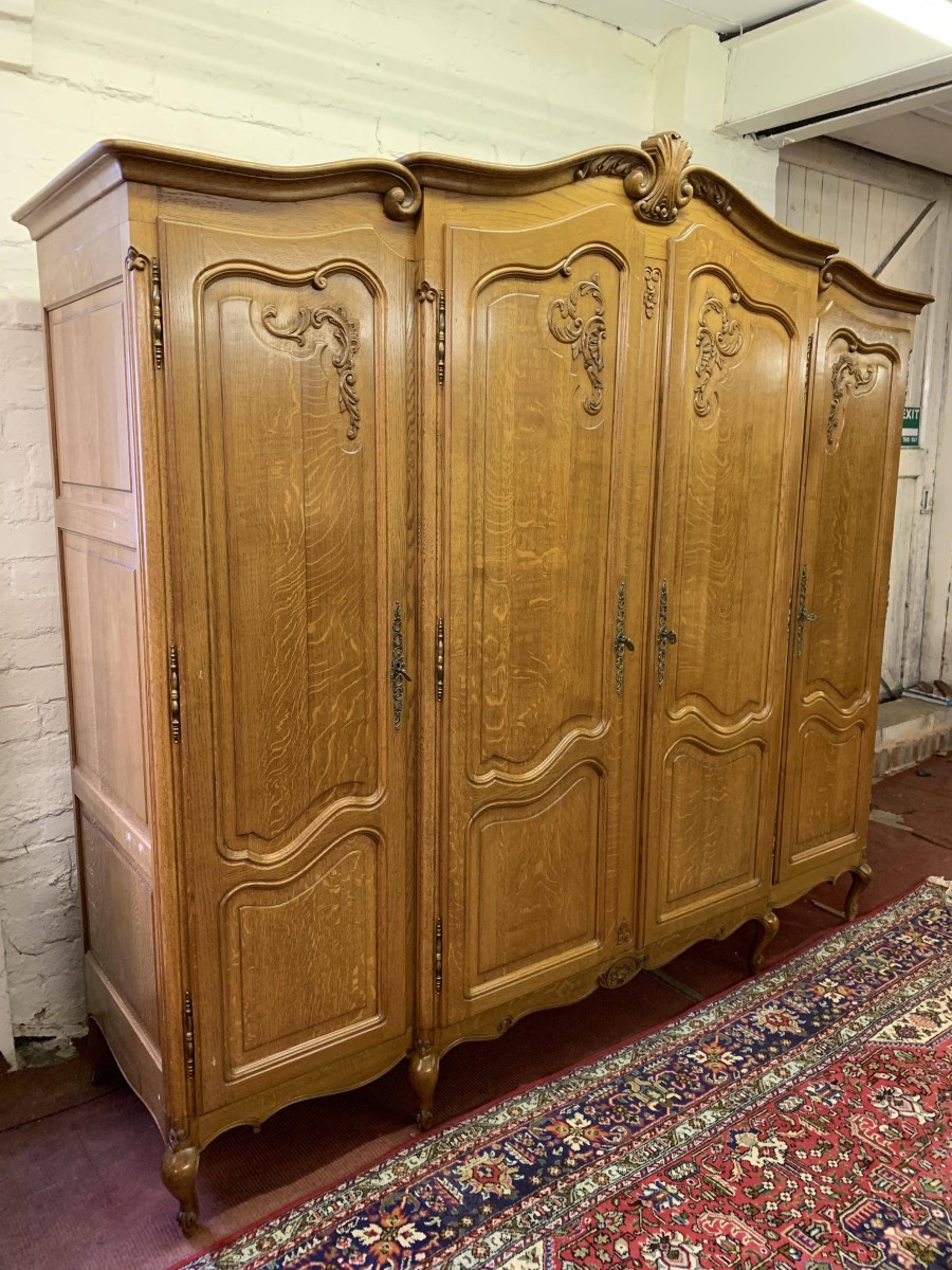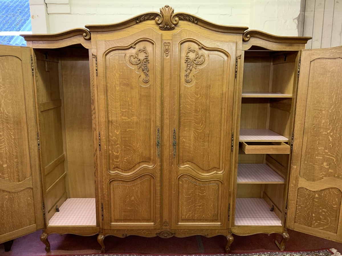 The beautifully shaped breakfront oversailing top rises to a central carved crest. Below are four lockable carved recessed panelled doors, each door having brass hinges, decorative brass escutcheons and key. The left hand door opens to reveal a hanging rail. The two central breakfront doors open to reveal a hanging rail with shelf above. The right hand door opens to reveal three removable and adjustable shelves, one having a drawer below. Recessed panelled sides, shaped carved skirt, this exceptional French armoire stands proud on four elegant carved shaped cabriole legs to the front. An added advantage with this armoire is it splits down for easy transportation and delivery into any home.