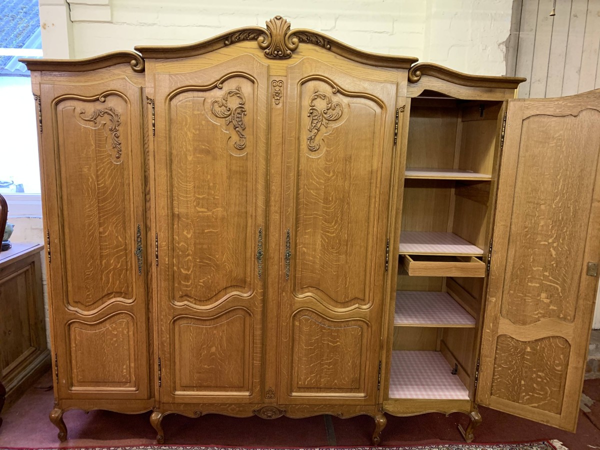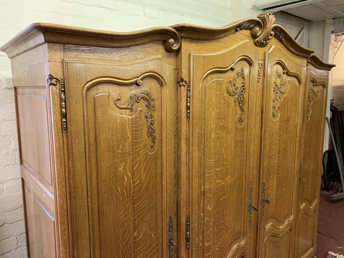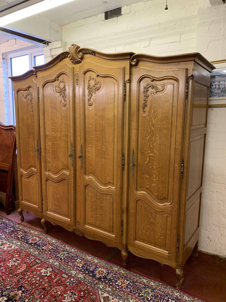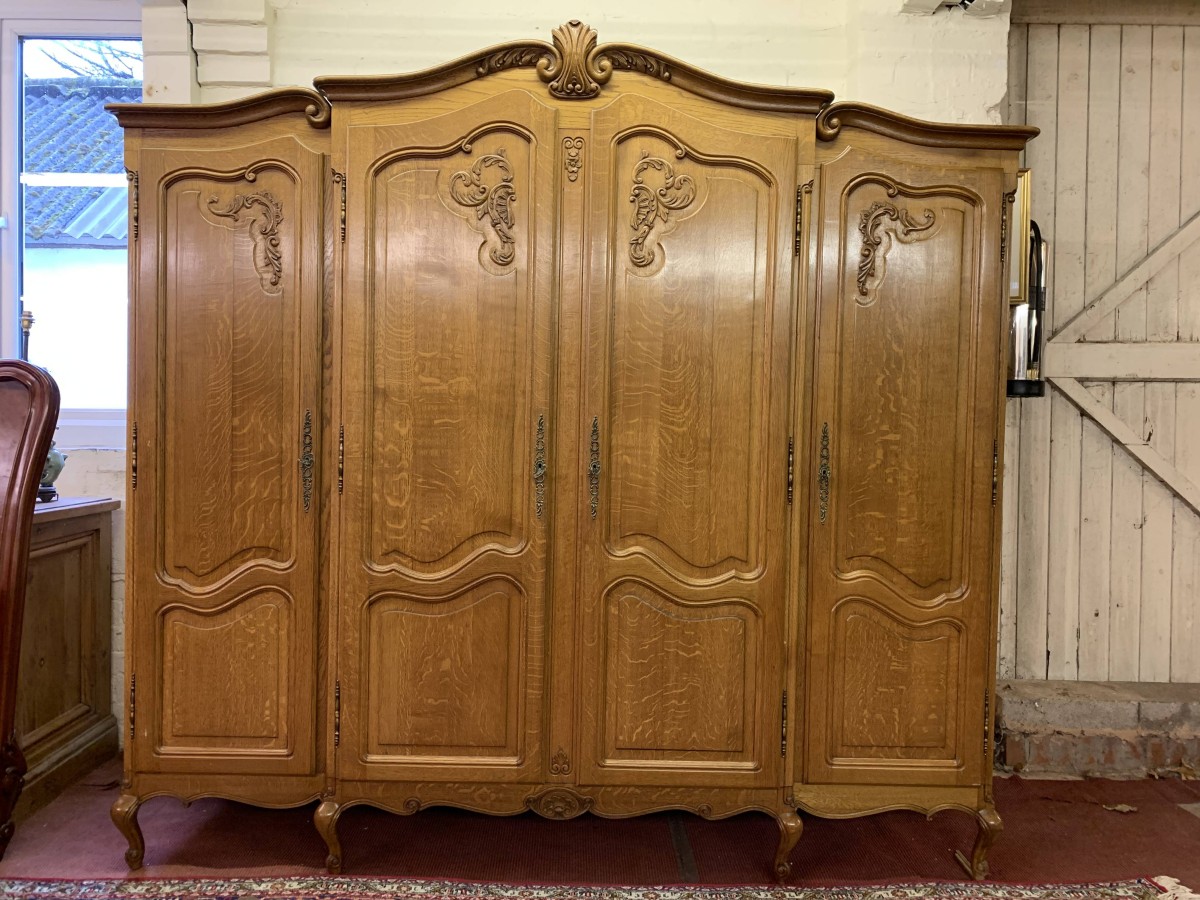The beautifully shaped breakfront oversailing top rises to a central carved crest. Below are four lockable carved recessed panelled doors, each door having brass hinges, decorative brass escutcheons and key. The left hand door opens to reveal a hanging rail. The two central breakfront doors open to reveal a hanging rail with shelf above. The right hand door opens to reveal three removable and adjustable shelves, one having a drawer below. Recessed panelled sides, shaped carved skirt, this exceptional French armoire stands proud on four elegant carved shaped cabriole legs to the front. An added advantage with this armoire is it splits down for easy transportation and delivery into any home.