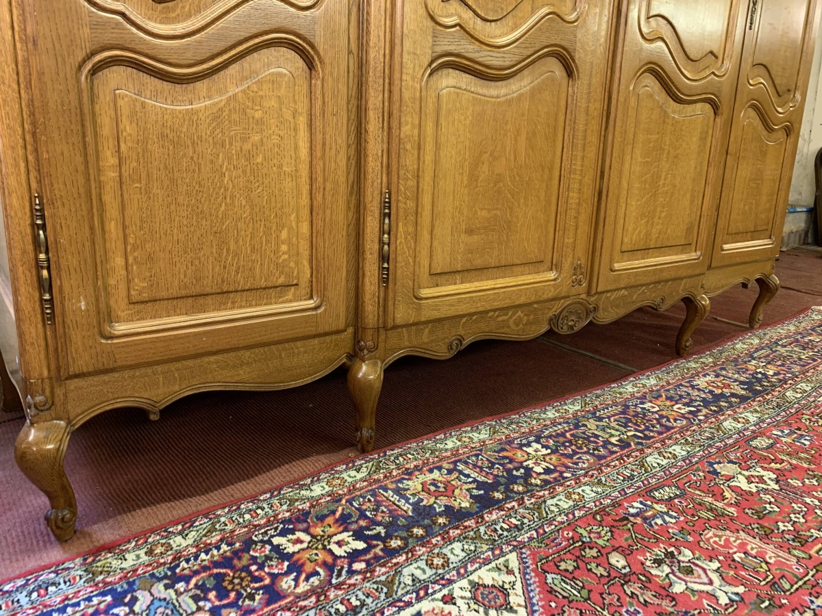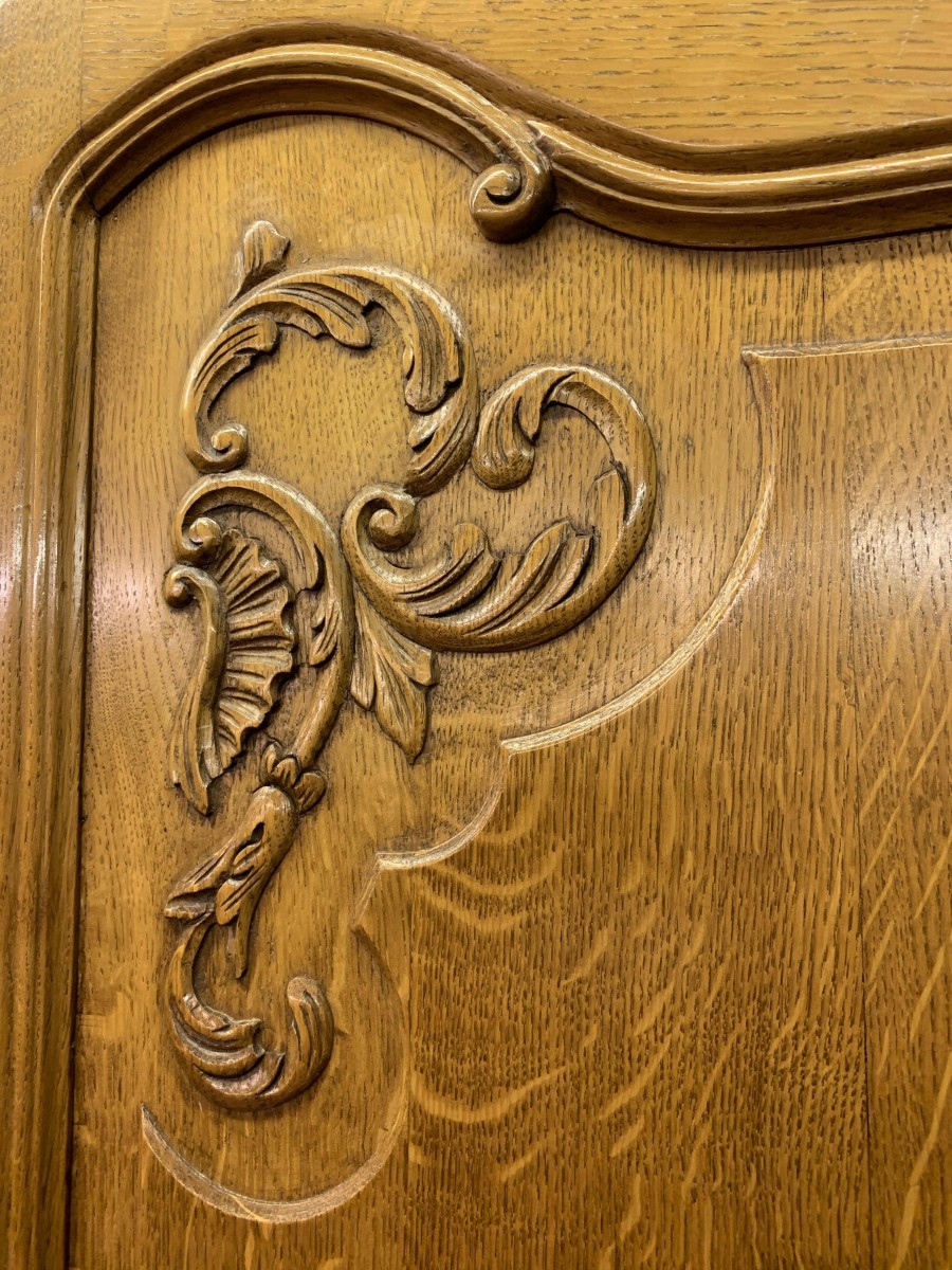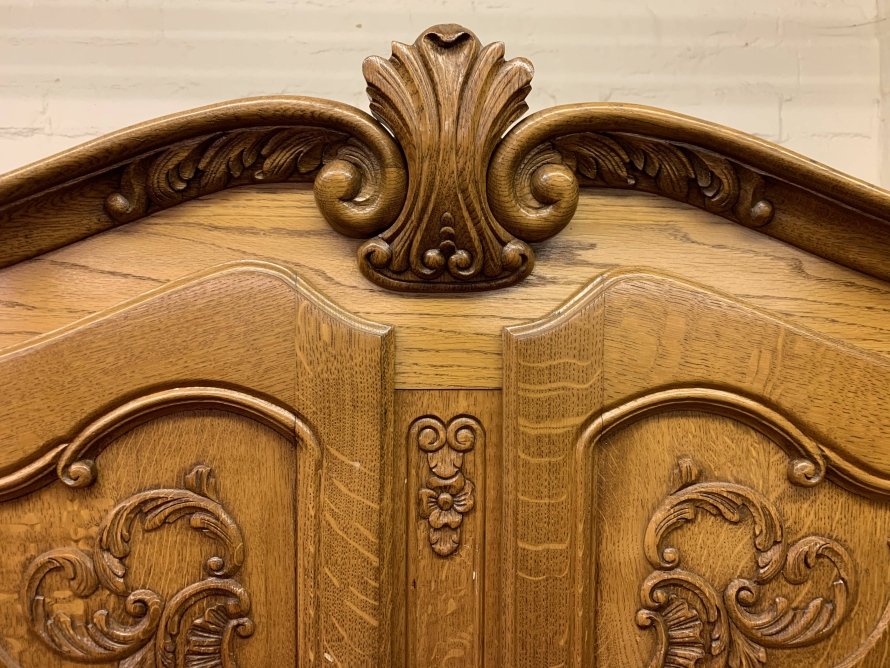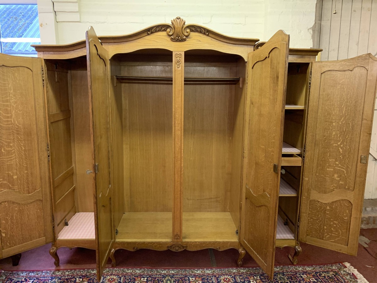 The beautifully shaped breakfront oversailing top rises to a central carved crest. Below are four lockable carved recessed panelled doors, each door having brass hinges, decorative brass escutcheons and key. The left hand door opens to reveal a hanging rail. The two central breakfront doors open to reveal a hanging rail with shelf above. The right hand door opens to reveal three removable and adjustable shelves, one having a drawer below. Recessed panelled sides, shaped carved skirt, this exceptional French armoire stands proud on four elegant carved shaped cabriole legs to the front. An added advantage with this armoire is it splits down for easy transportation and delivery into any home.