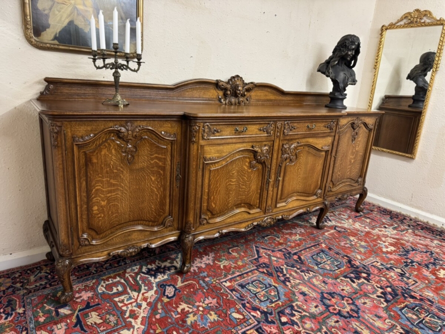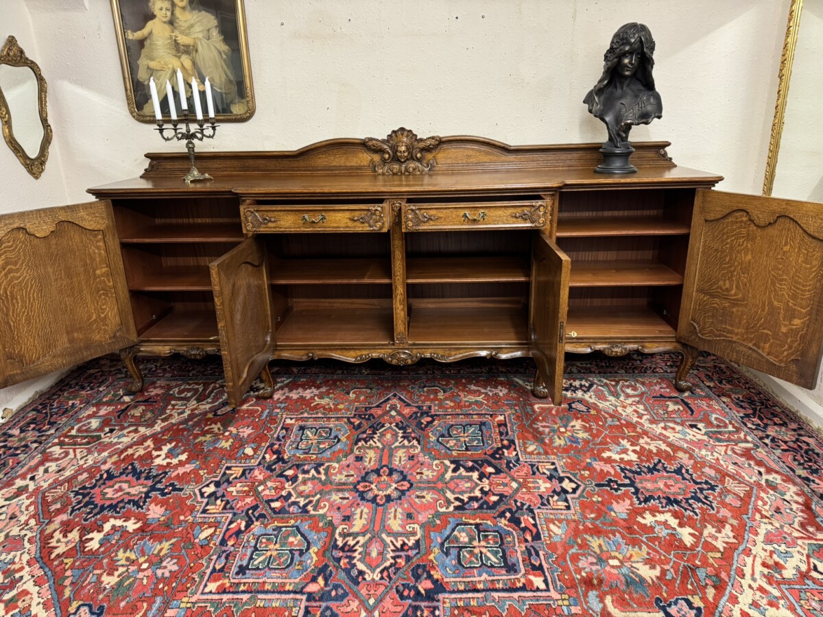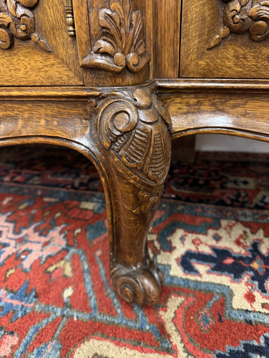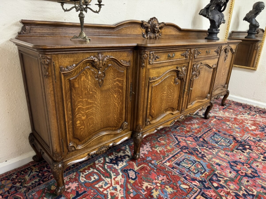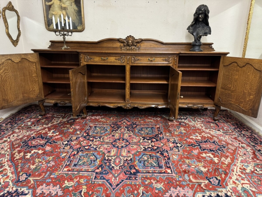 The shaped back rail has a fabulous central figurine carving, below are two carved drawers and four lockable carved recessed panelled cupboard doors, the pair of central breakfront drawers open to reveal a removable shelf. The two outer doors open to reveal two removable shelves. Recessed panelled sides, shaped carved skirt and standing on six carved cabriole shaped legs to the front.