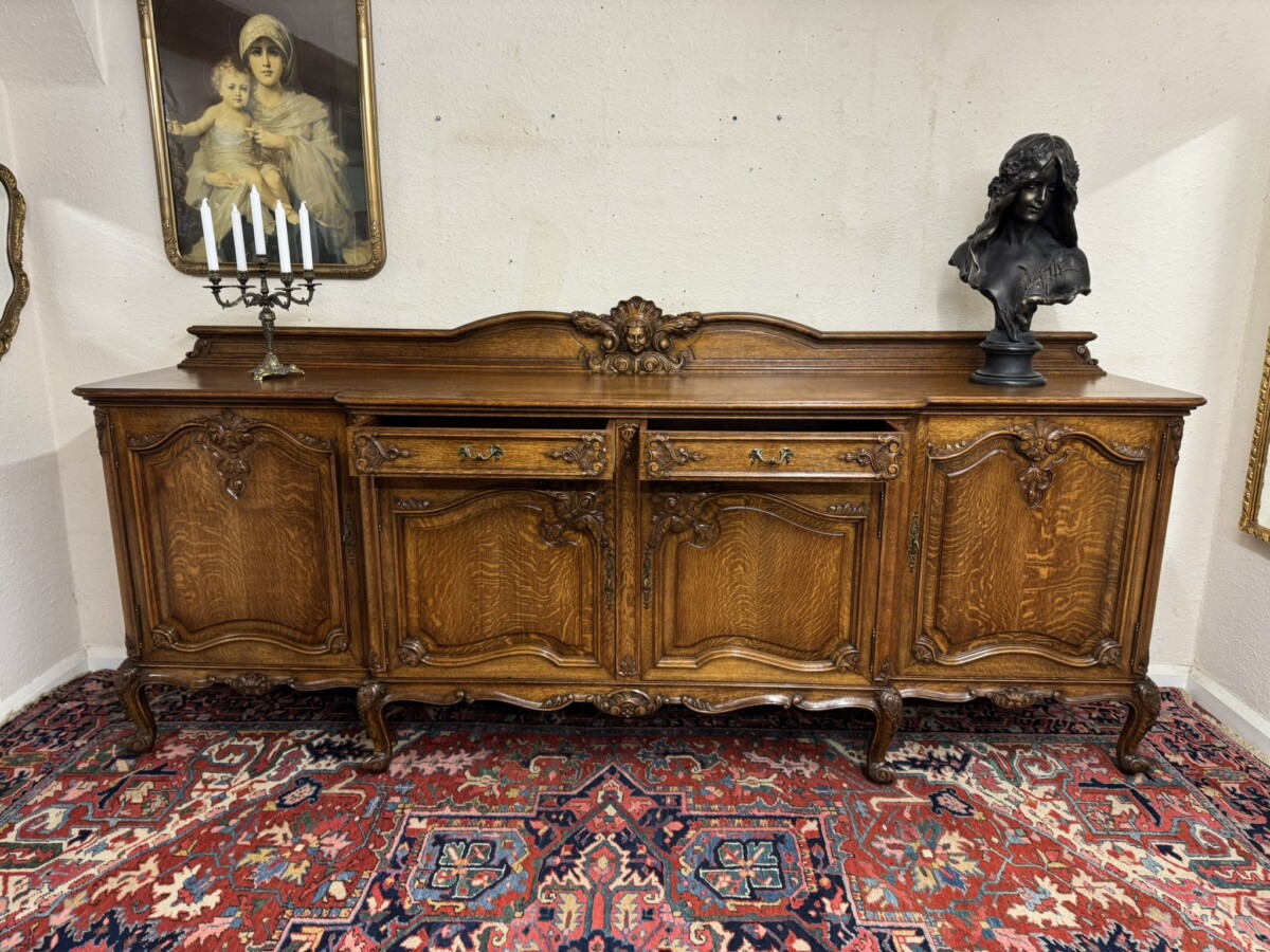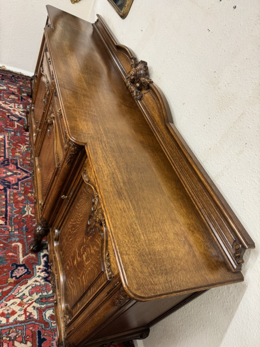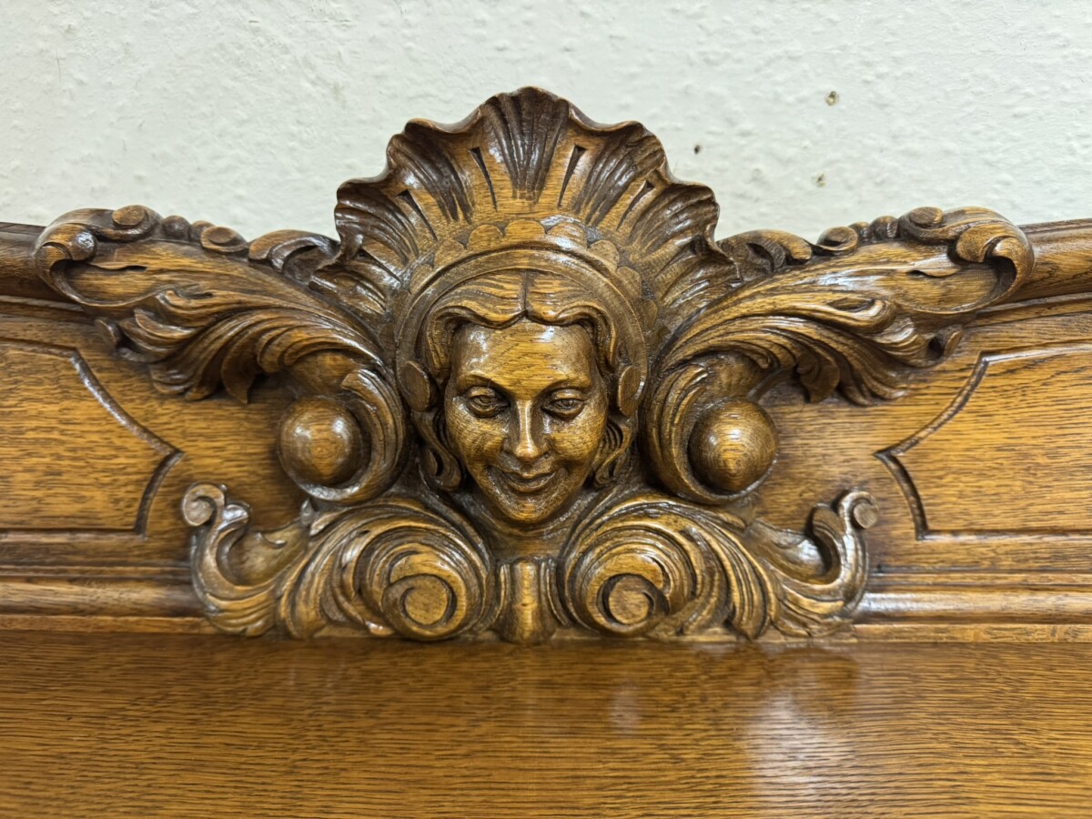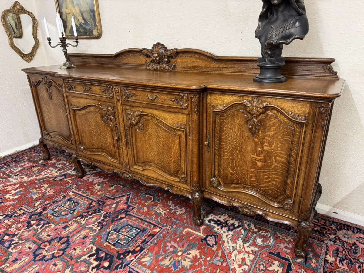 The shaped back rail has a fabulous central figurine carving, below are two carved drawers and four lockable carved recessed panelled cupboard doors, the pair of central breakfront drawers open to reveal a removable shelf. The two outer doors open to reveal two removable shelves. Recessed panelled sides, shaped carved skirt and standing on six carved cabriole shaped legs to the front.