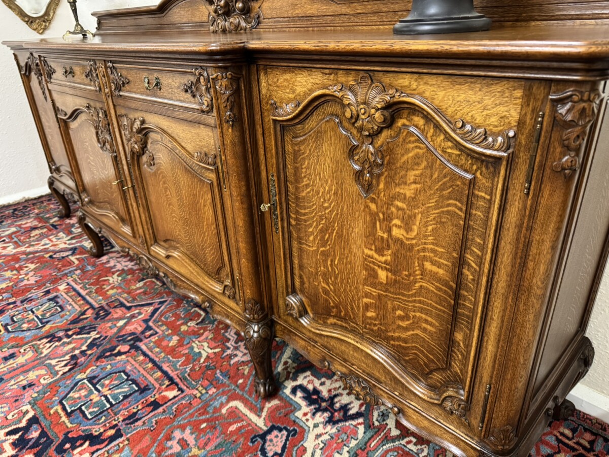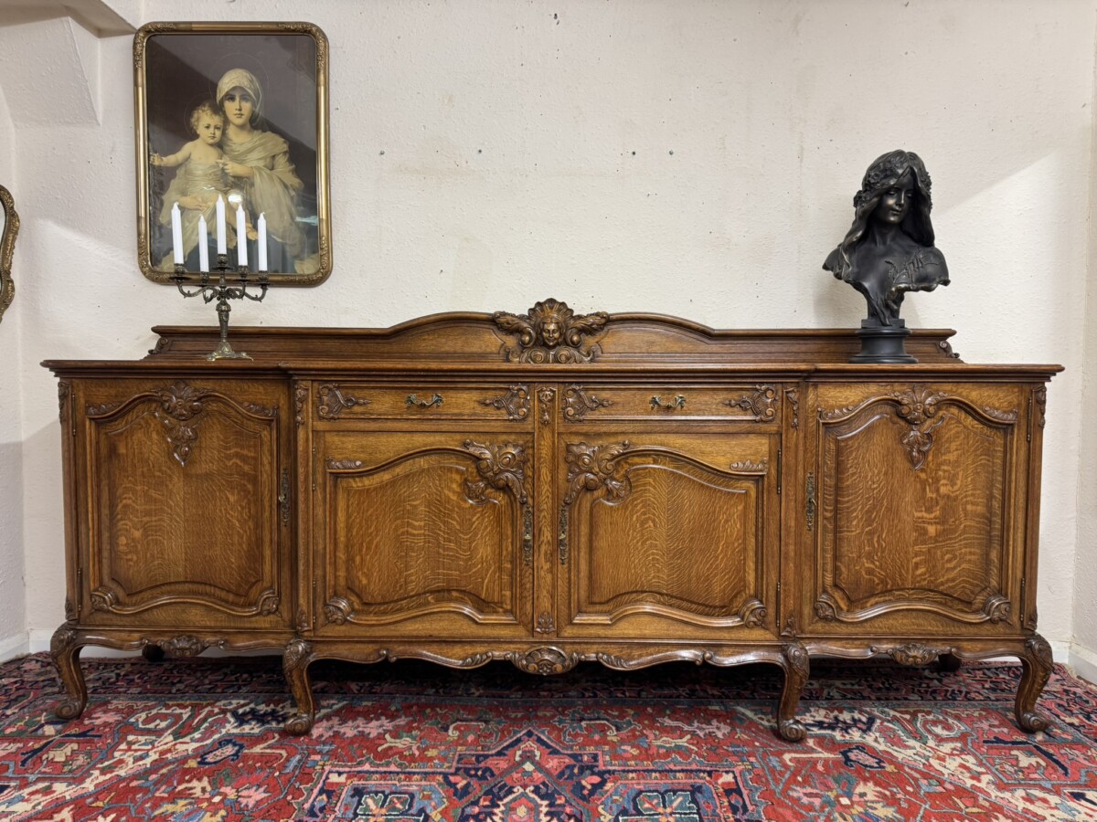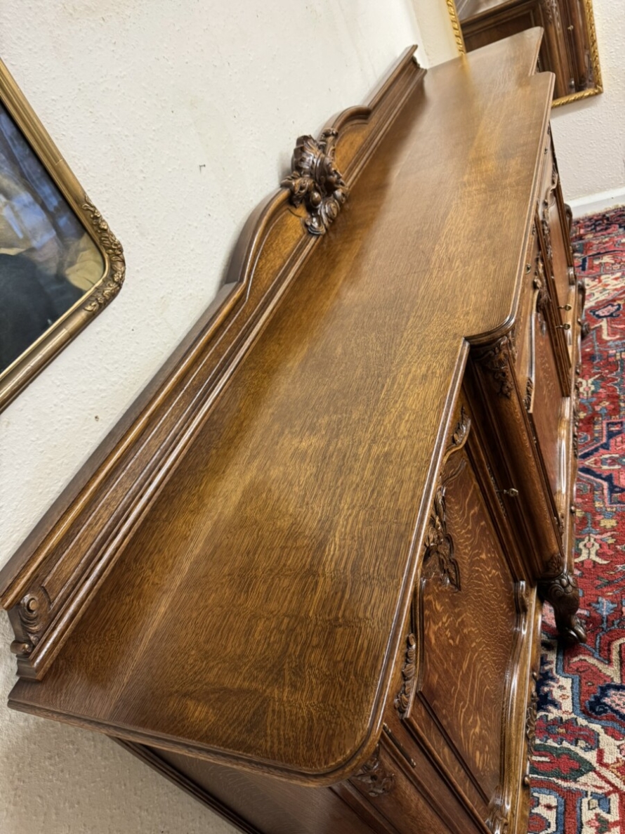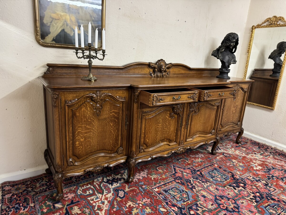 The shaped back rail has a fabulous central figurine carving, below are two carved drawers and four lockable carved recessed panelled cupboard doors, the pair of central breakfront drawers open to reveal a removable shelf. The two outer doors open to reveal two removable shelves. Recessed panelled sides, shaped carved skirt and standing on six carved cabriole shaped legs to the front.