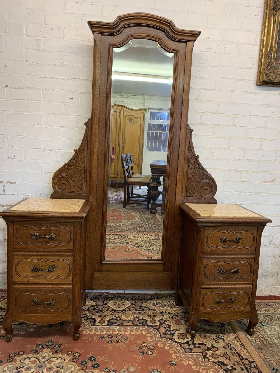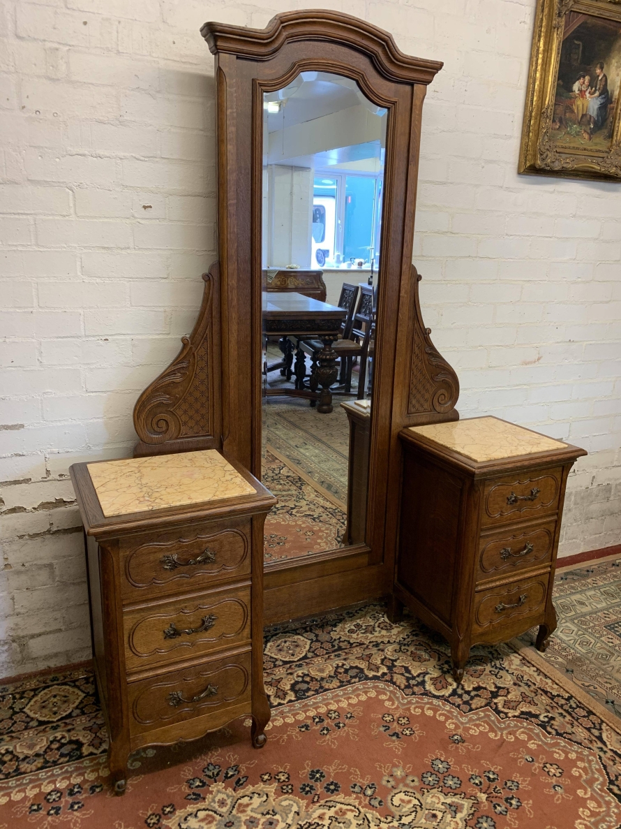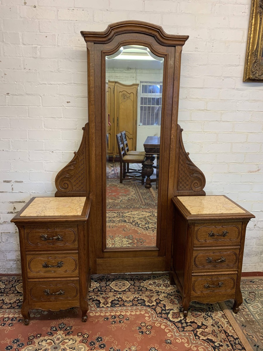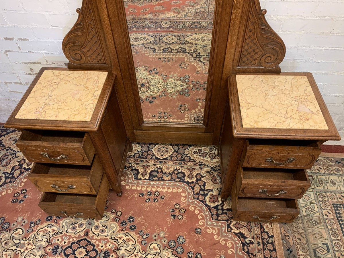 A rare French dressing table which is in fantastic condition. The dressing table has two marble topped chests, each chest having carved drawer fronts with ornate brass handle. Having a full length bevel edged shaped dressing mirror with shaped carved sides this elegant item of French furniture stands on four carved shaped cabriole legs to the front.