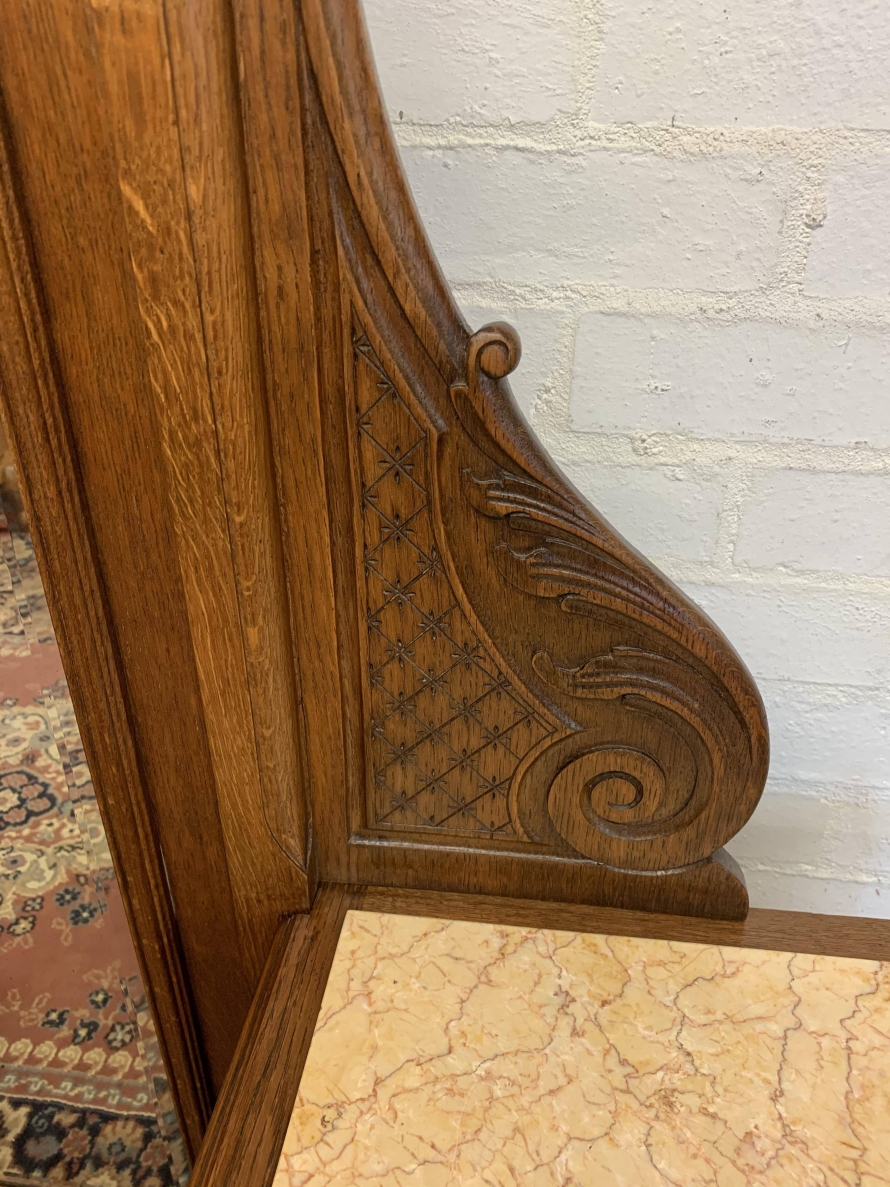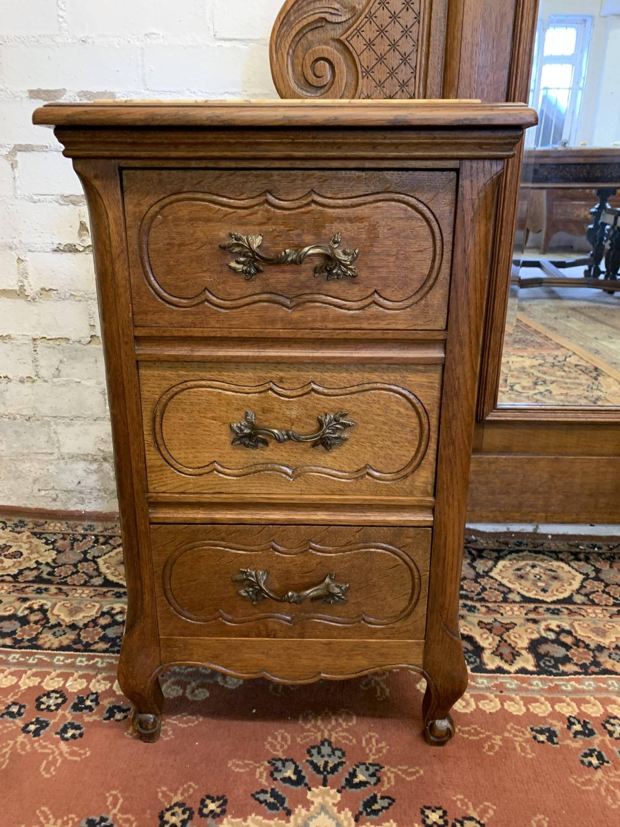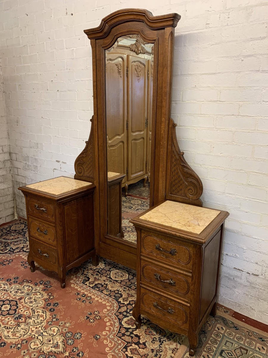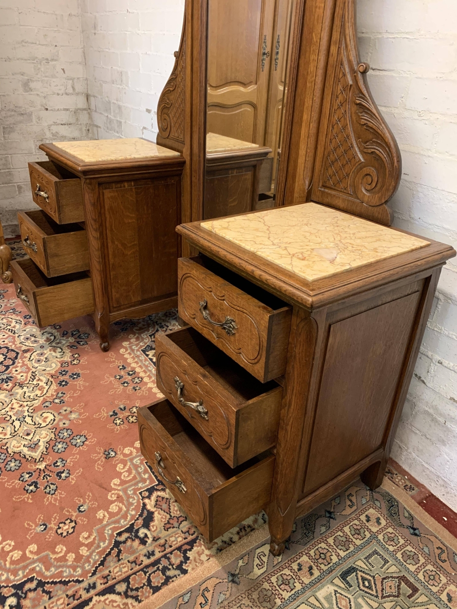 A rare French dressing table which is in fantastic condition. The dressing table has two marble topped chests, each chest having carved drawer fronts with ornate brass handle. Having a full length bevel edged shaped dressing mirror with shaped carved sides this elegant item of French furniture stands on four carved shaped cabriole legs to the front.