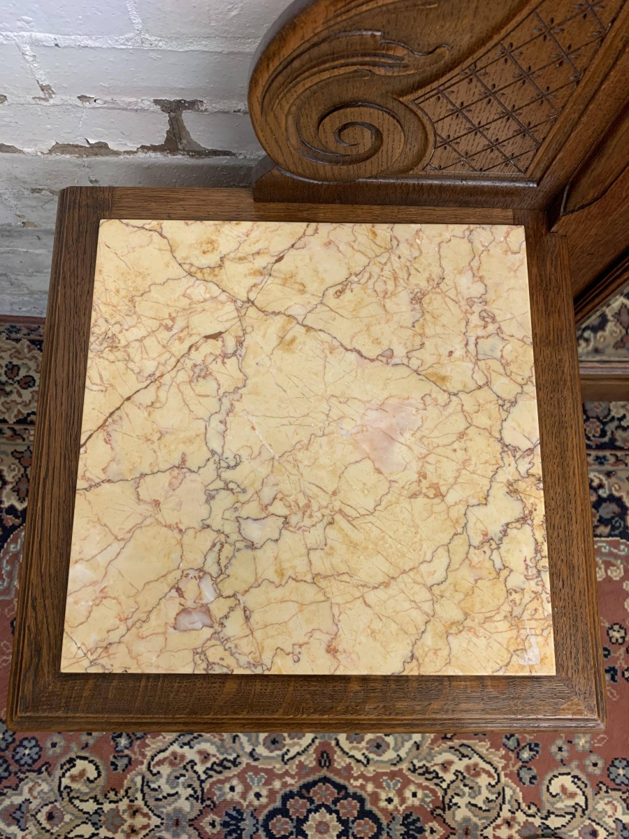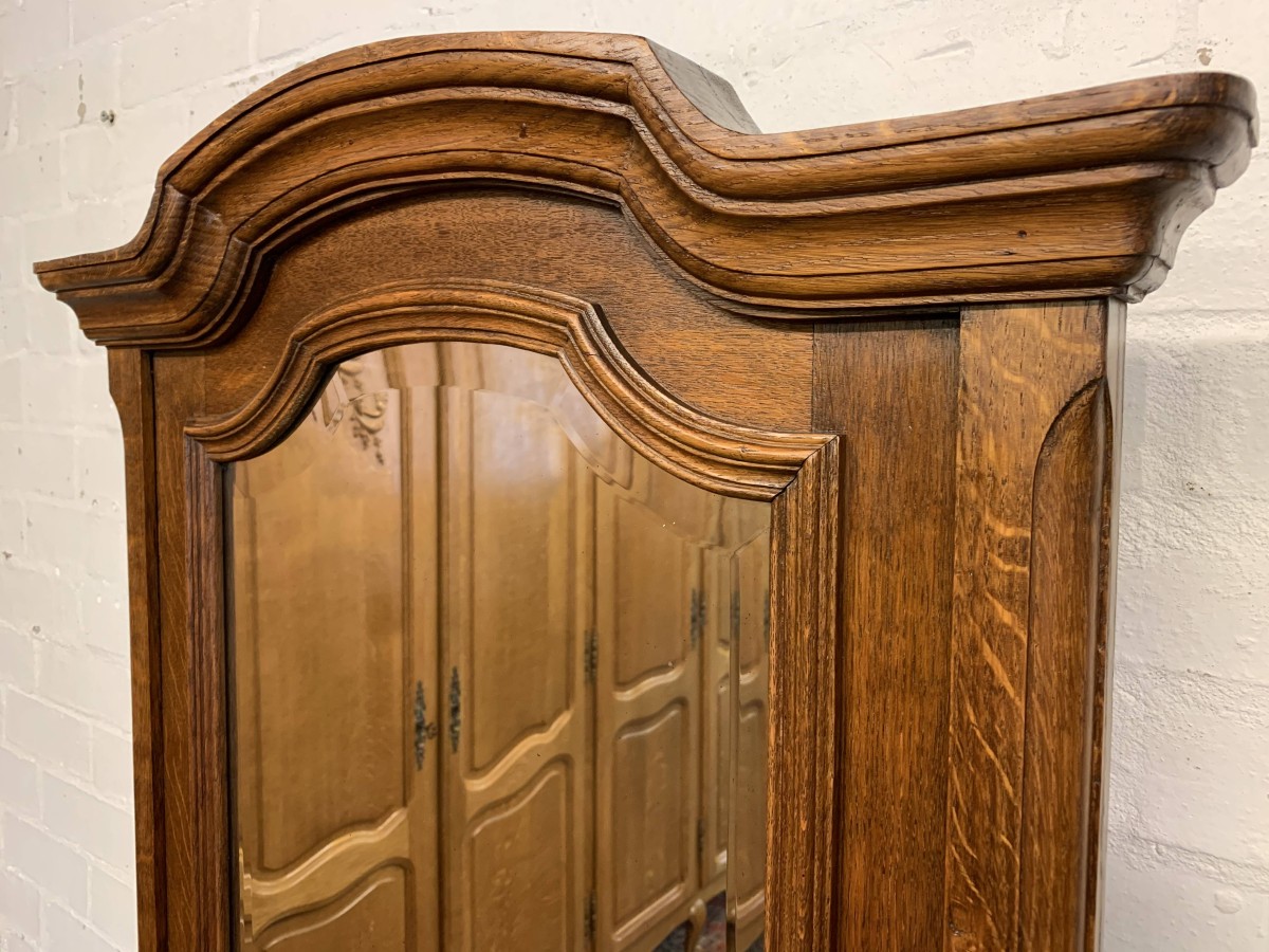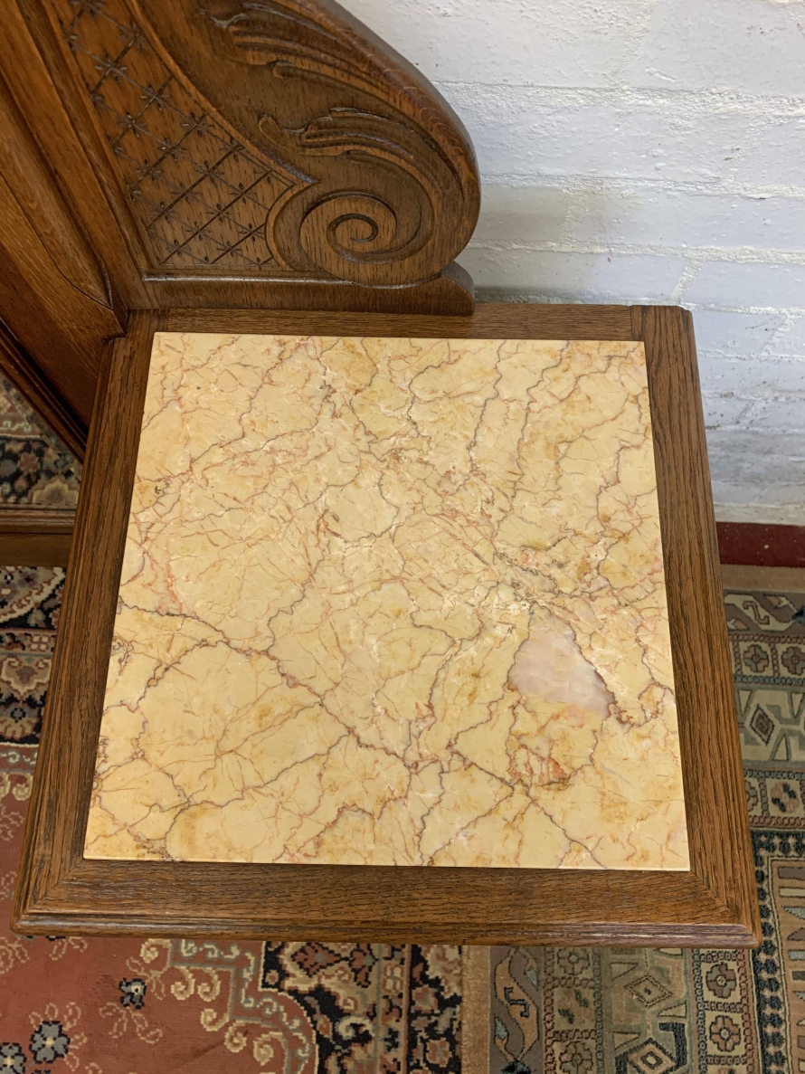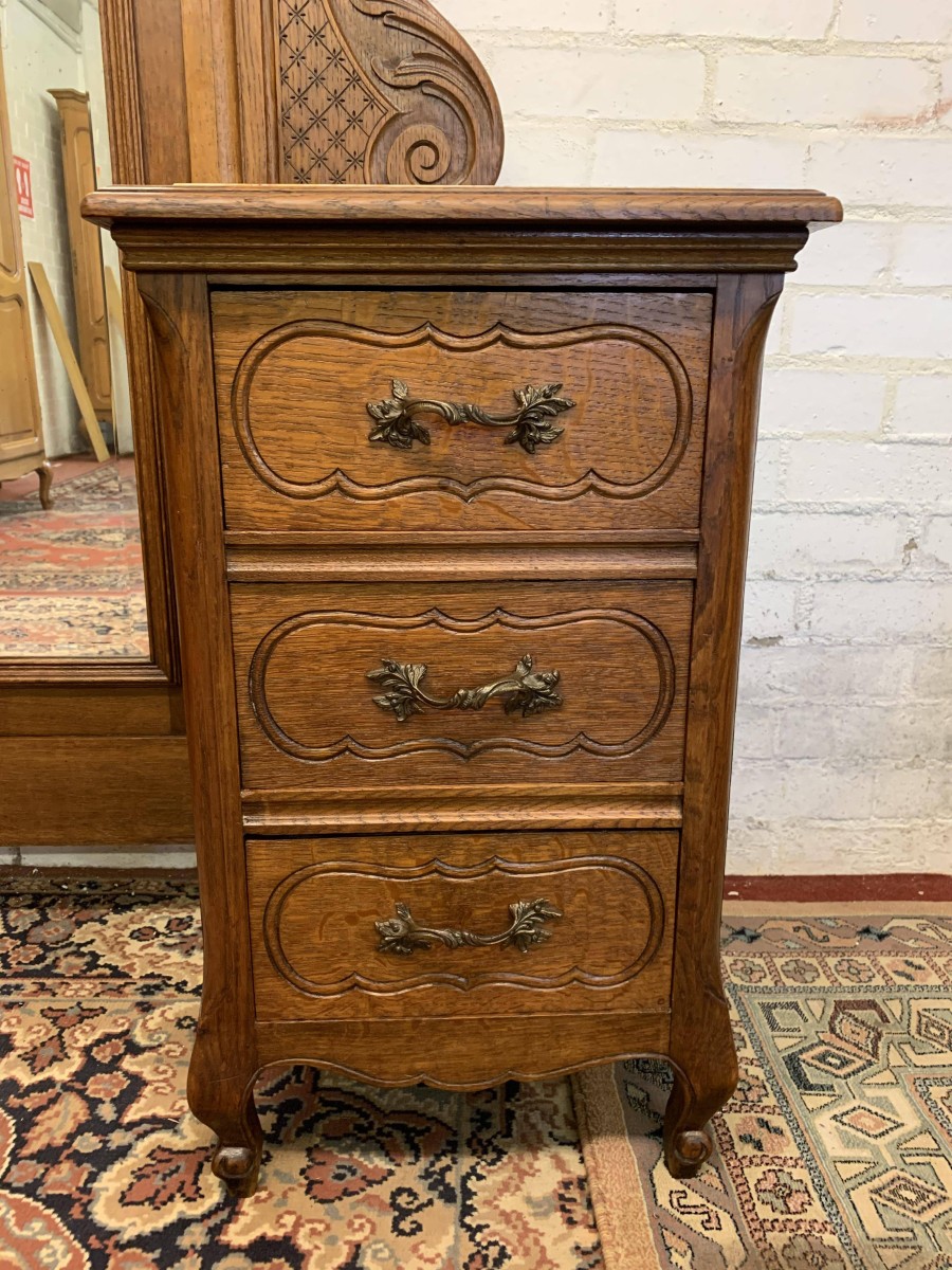 A rare French dressing table which is in fantastic condition. The dressing table has two marble topped chests, each chest having carved drawer fronts with ornate brass handle. Having a full length bevel edged shaped dressing mirror with shaped carved sides this elegant item of French furniture stands on four carved shaped cabriole legs to the front.