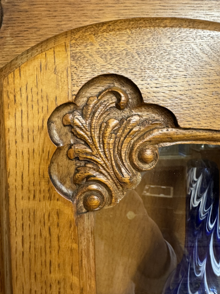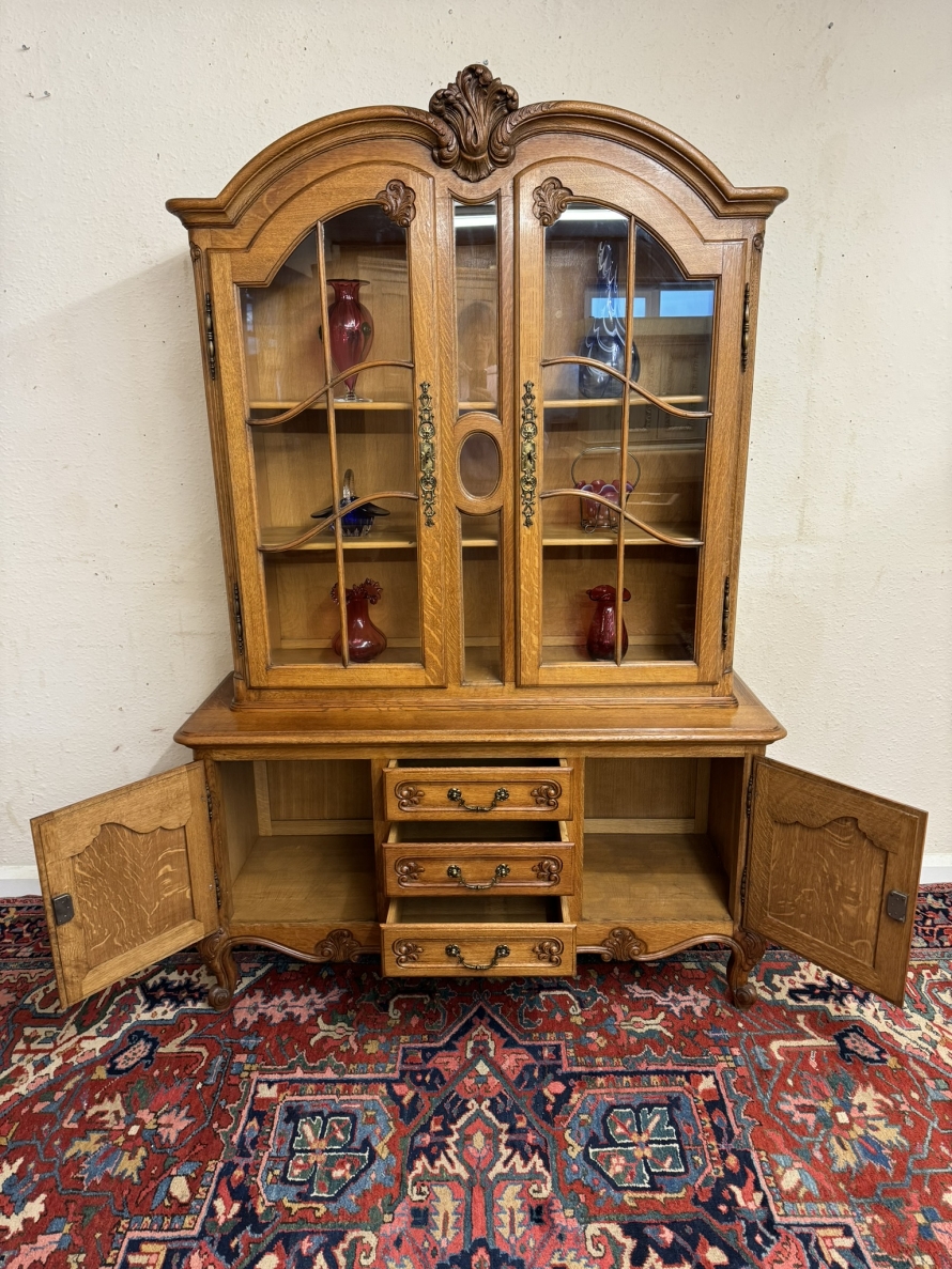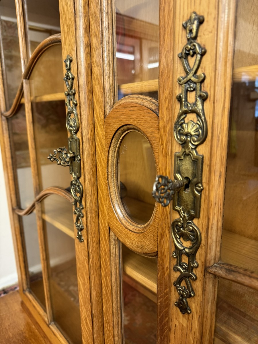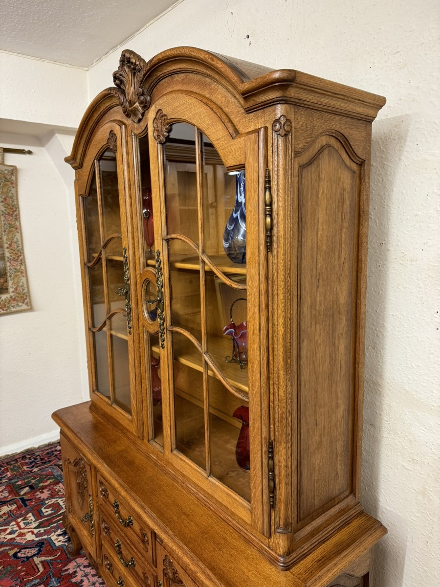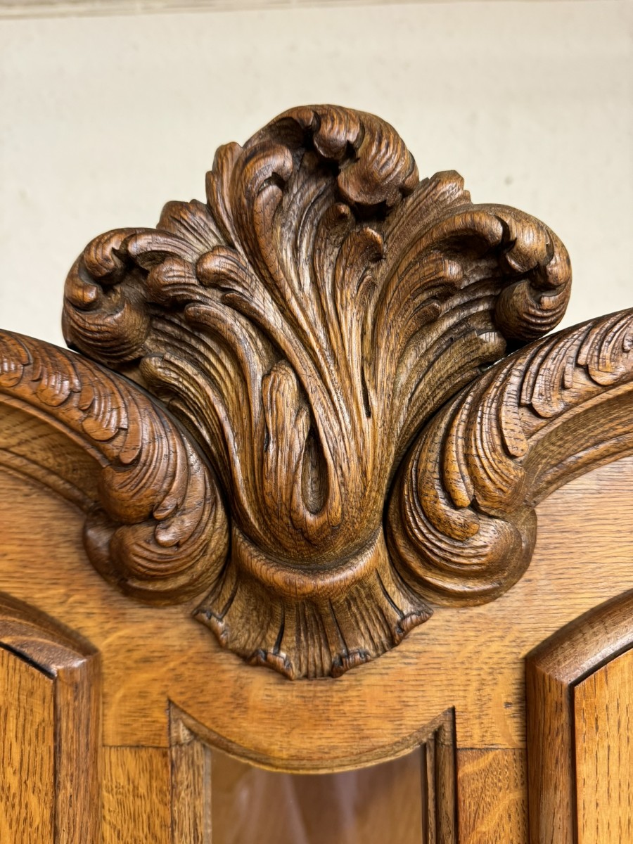 This fabulous cabinet is in excellent condition. The arch top rises to a carved fearther crest, below are a pair of lockable glazed doors, there is a glazed panel between these doors. Each door has brass hinges, ornate brass escutcheon and key. The doors open to reveal two removable shelves. The base section has a central bank of three carved drawers flanked by a pair of carved recessed panelled doors, each drawer having a brass handle, each door having brass hinges, ornate brass escutcheon and key. The doors open to reveal a good storage space. Recessed panelled sides, shaped skirt with fabulous carved decoration this fabulous cabinet stands on carved cabriole shaped legs.