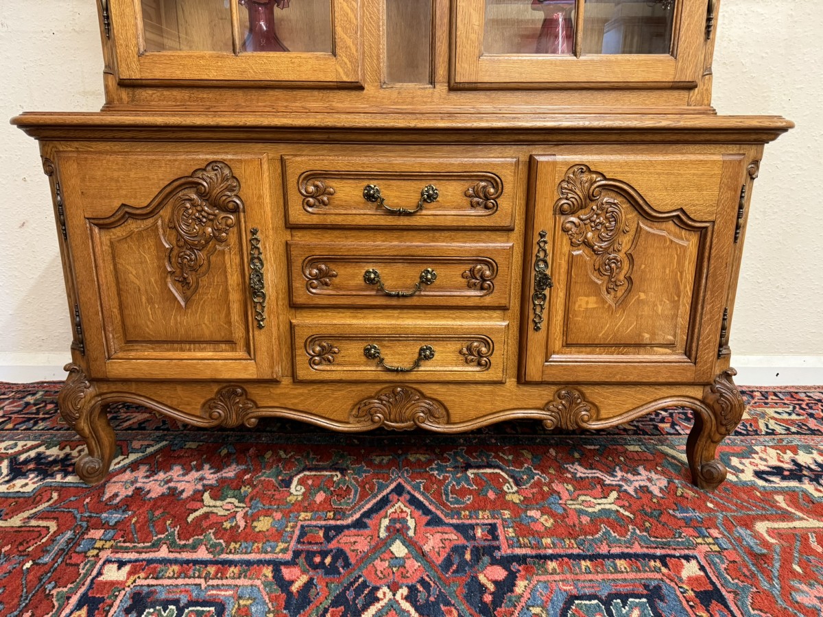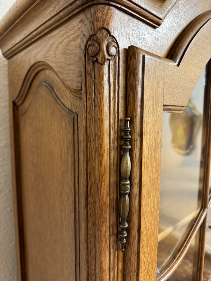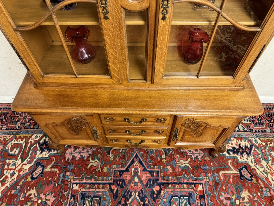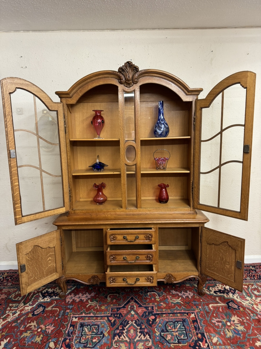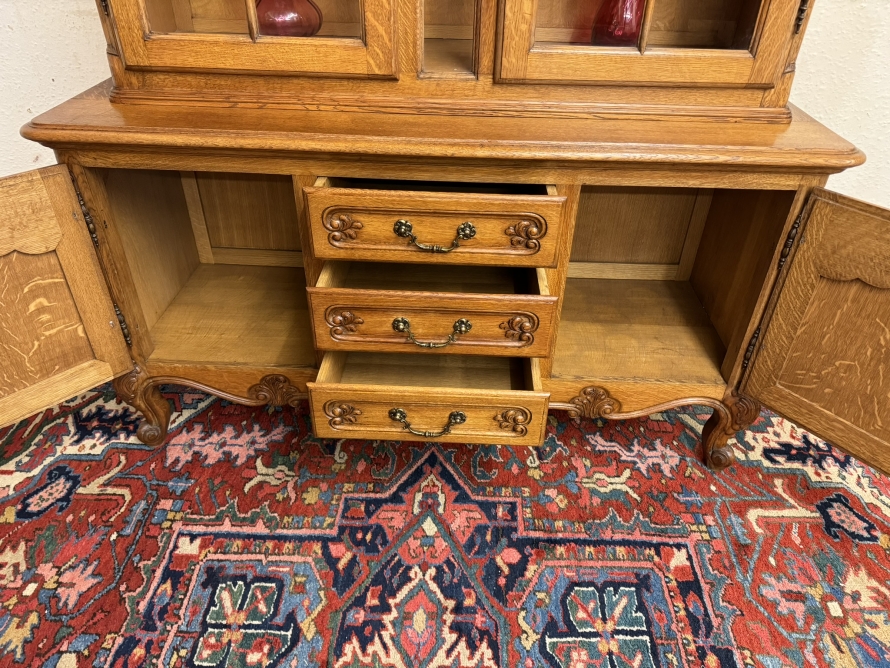 This fabulous cabinet is in excellent condition. The arch top rises to a carved fearther crest, below are a pair of lockable glazed doors, there is a glazed panel between these doors. Each door has brass hinges, ornate brass escutcheon and key. The doors open to reveal two removable shelves. The base section has a central bank of three carved drawers flanked by a pair of carved recessed panelled doors, each drawer having a brass handle, each door having brass hinges, ornate brass escutcheon and key. The doors open to reveal a good storage space. Recessed panelled sides, shaped skirt with fabulous carved decoration this fabulous cabinet stands on carved cabriole shaped legs.