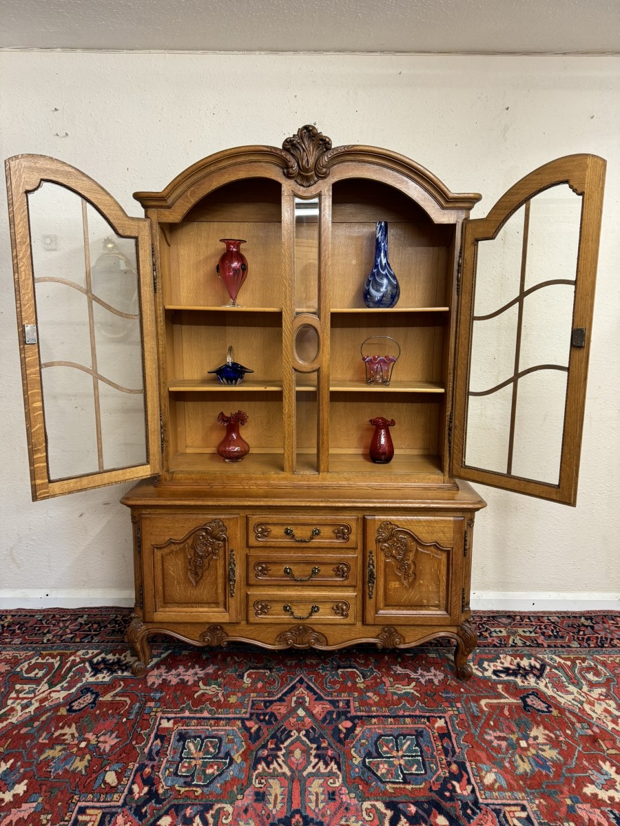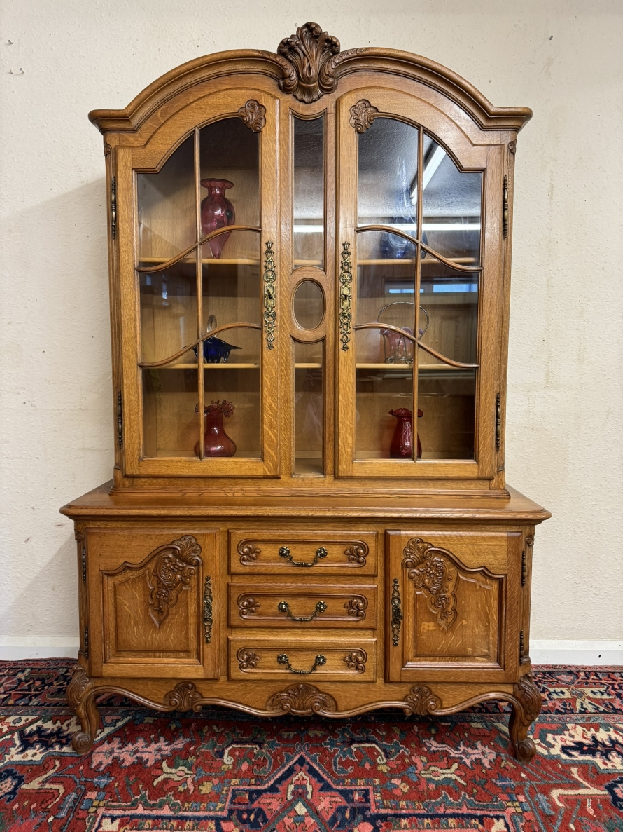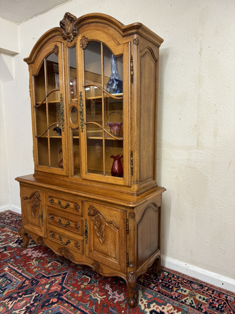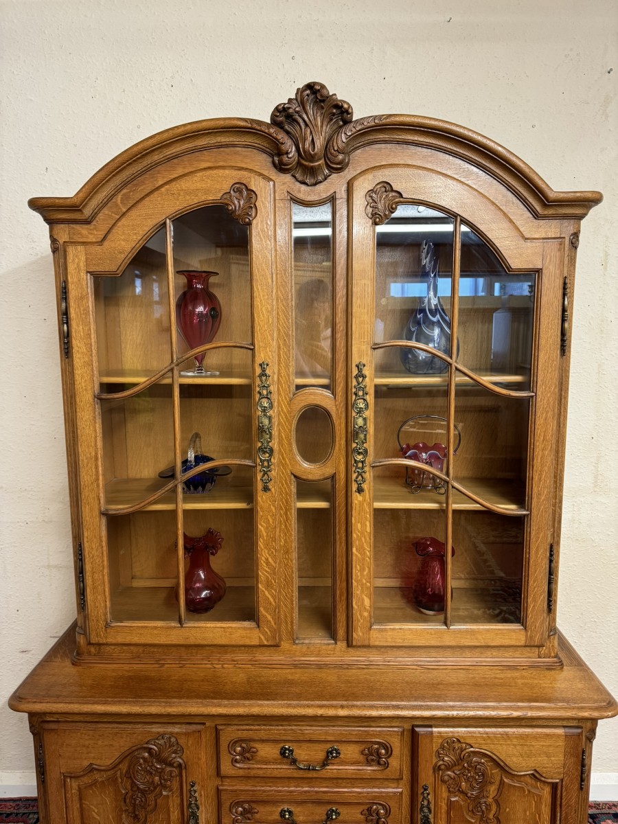 This fabulous cabinet is in excellent condition. The arch top rises to a carved fearther crest, below are a pair of lockable glazed doors, there is a glazed panel between these doors. Each door has brass hinges, ornate brass escutcheon and key. The doors open to reveal two removable shelves. The base section has a central bank of three carved drawers flanked by a pair of carved recessed panelled doors, each drawer having a brass handle, each door having brass hinges, ornate brass escutcheon and key. The doors open to reveal a good storage space. Recessed panelled sides, shaped skirt with fabulous carved decoration this fabulous cabinet stands on carved cabriole shaped legs.