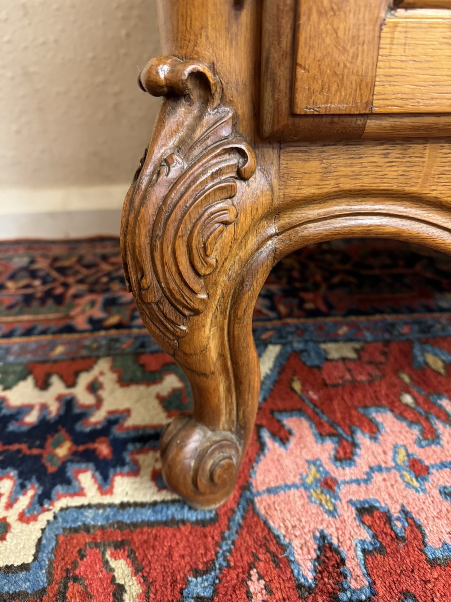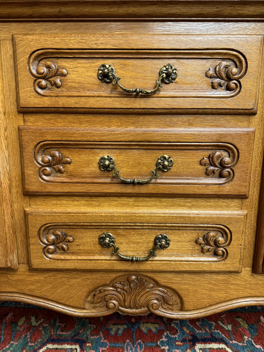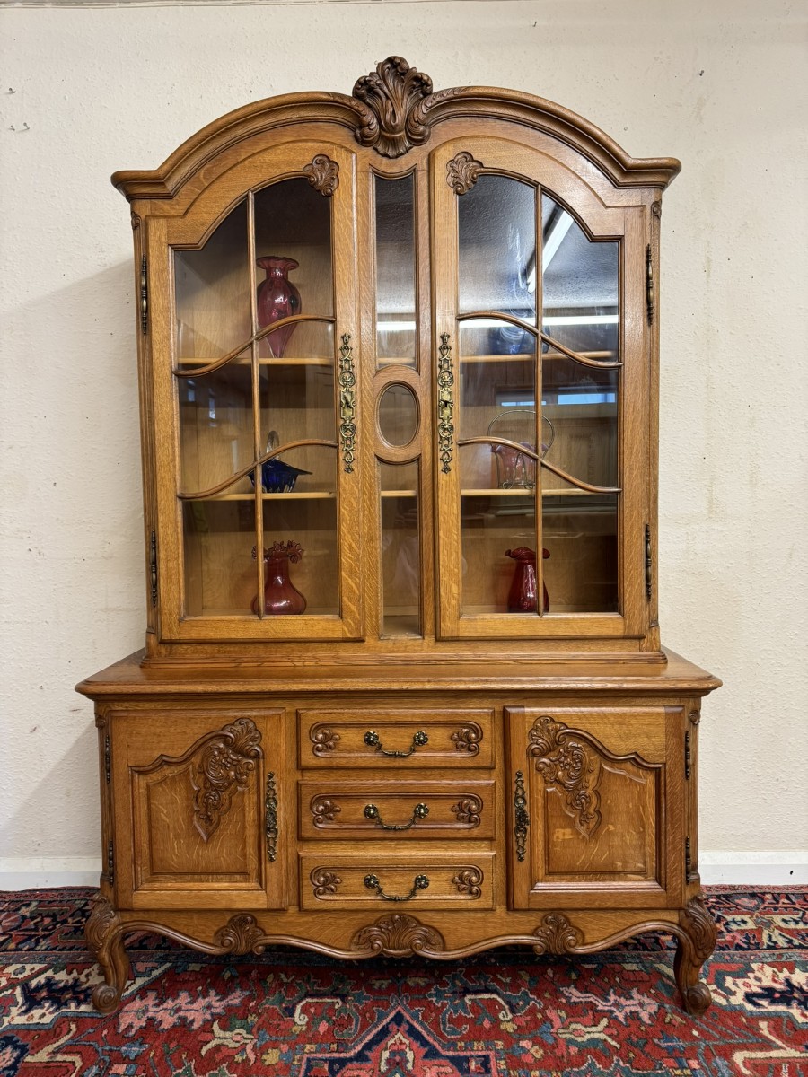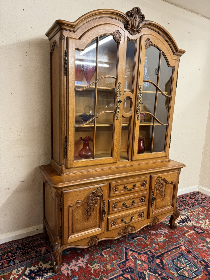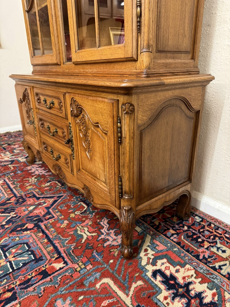 This fabulous cabinet is in excellent condition. The arch top rises to a carved fearther crest, below are a pair of lockable glazed doors, there is a glazed panel between these doors. Each door has brass hinges, ornate brass escutcheon and key. The doors open to reveal two removable shelves. The base section has a central bank of three carved drawers flanked by a pair of carved recessed panelled doors, each drawer having a brass handle, each door having brass hinges, ornate brass escutcheon and key. The doors open to reveal a good storage space. Recessed panelled sides, shaped skirt with fabulous carved decoration this fabulous cabinet stands on carved cabriole shaped legs.