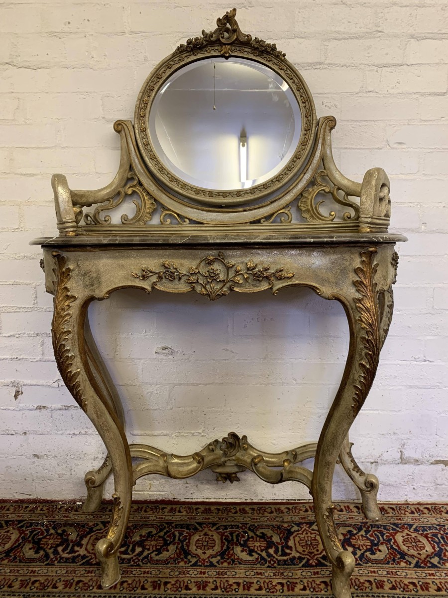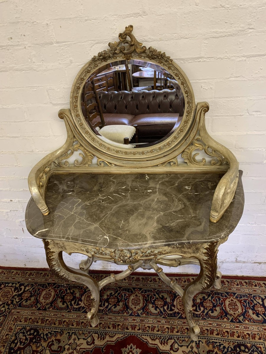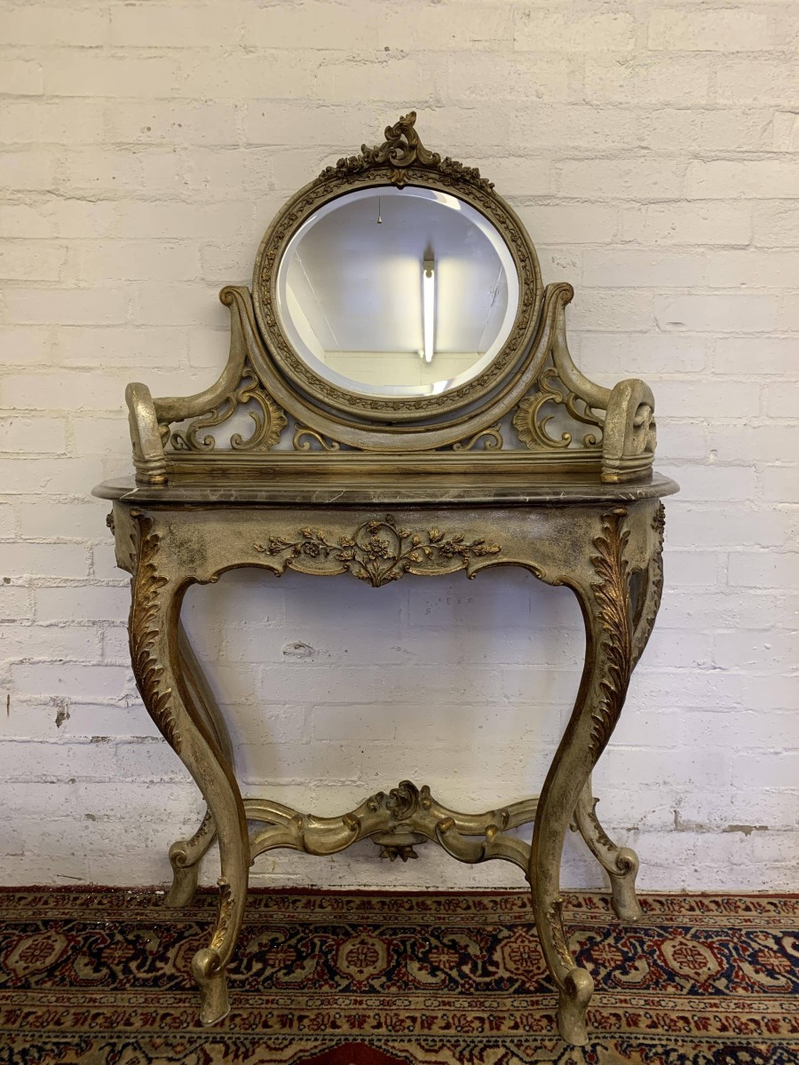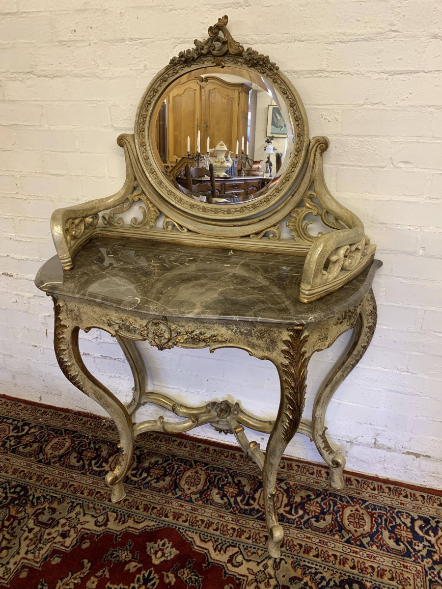 This pretty French dressing table is in excellent condition. Having an oval bevel edged mirror which has fabulous carvings. The mirror sits on a shaped carved stand which in turn sits on a shaped marble. Four shaped guilt carved legs, shaped carved skirt and having four fabulous shaped stretcher supports.