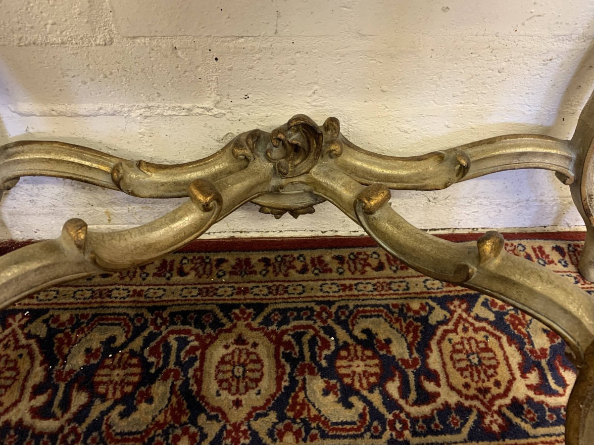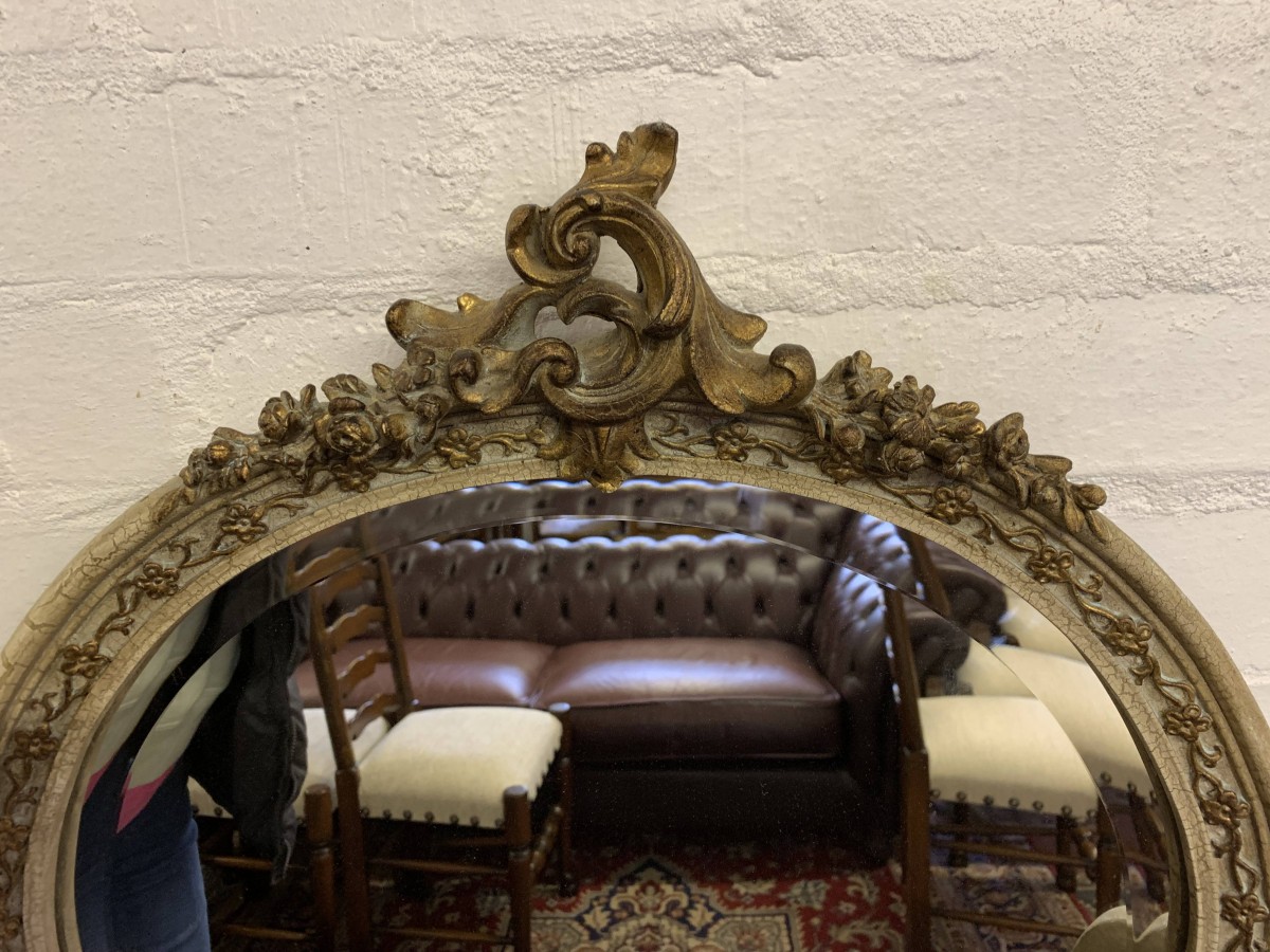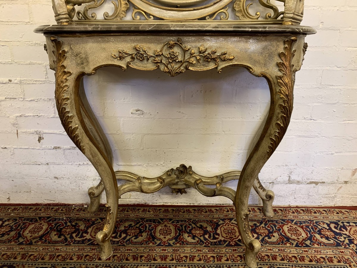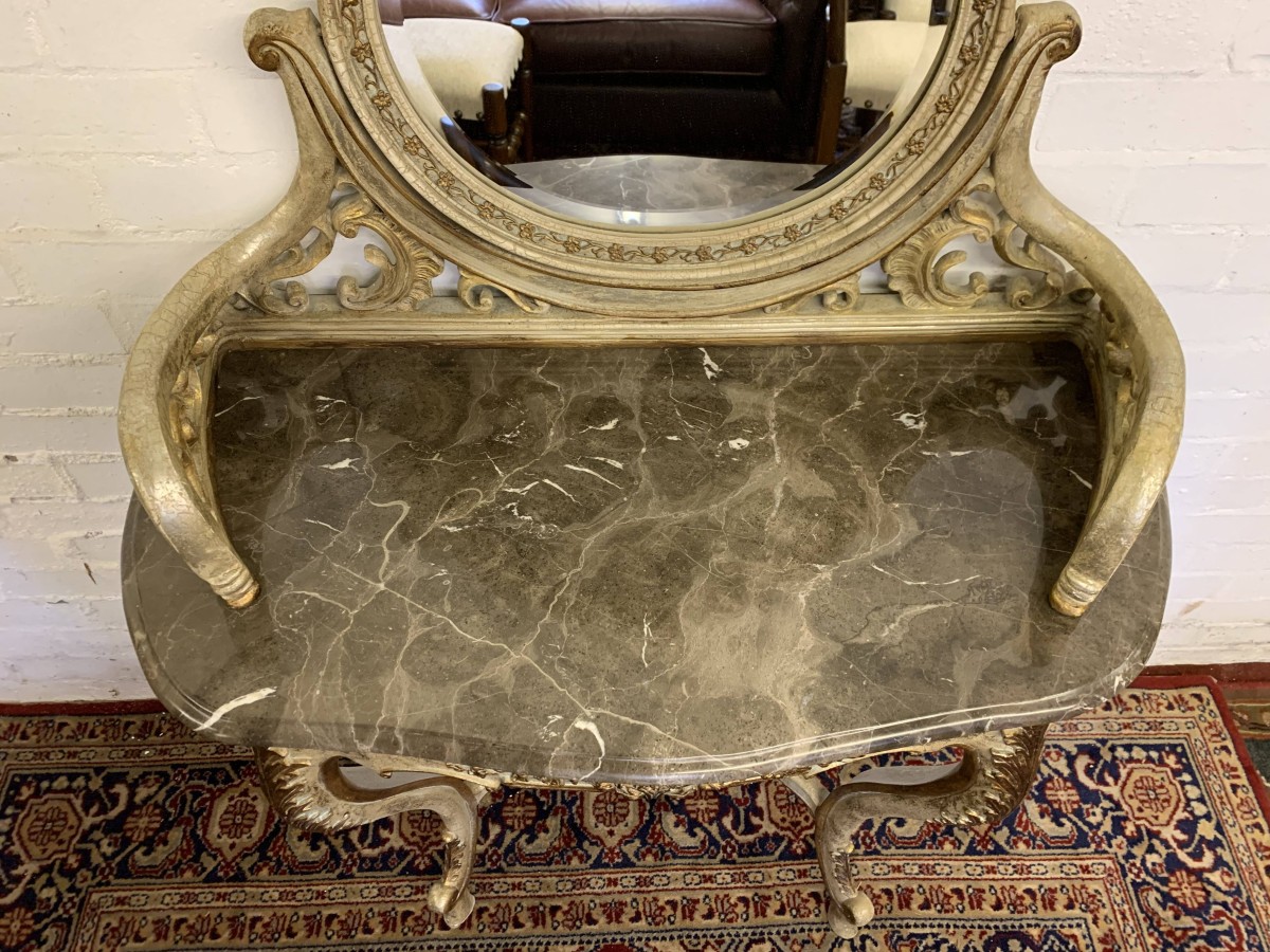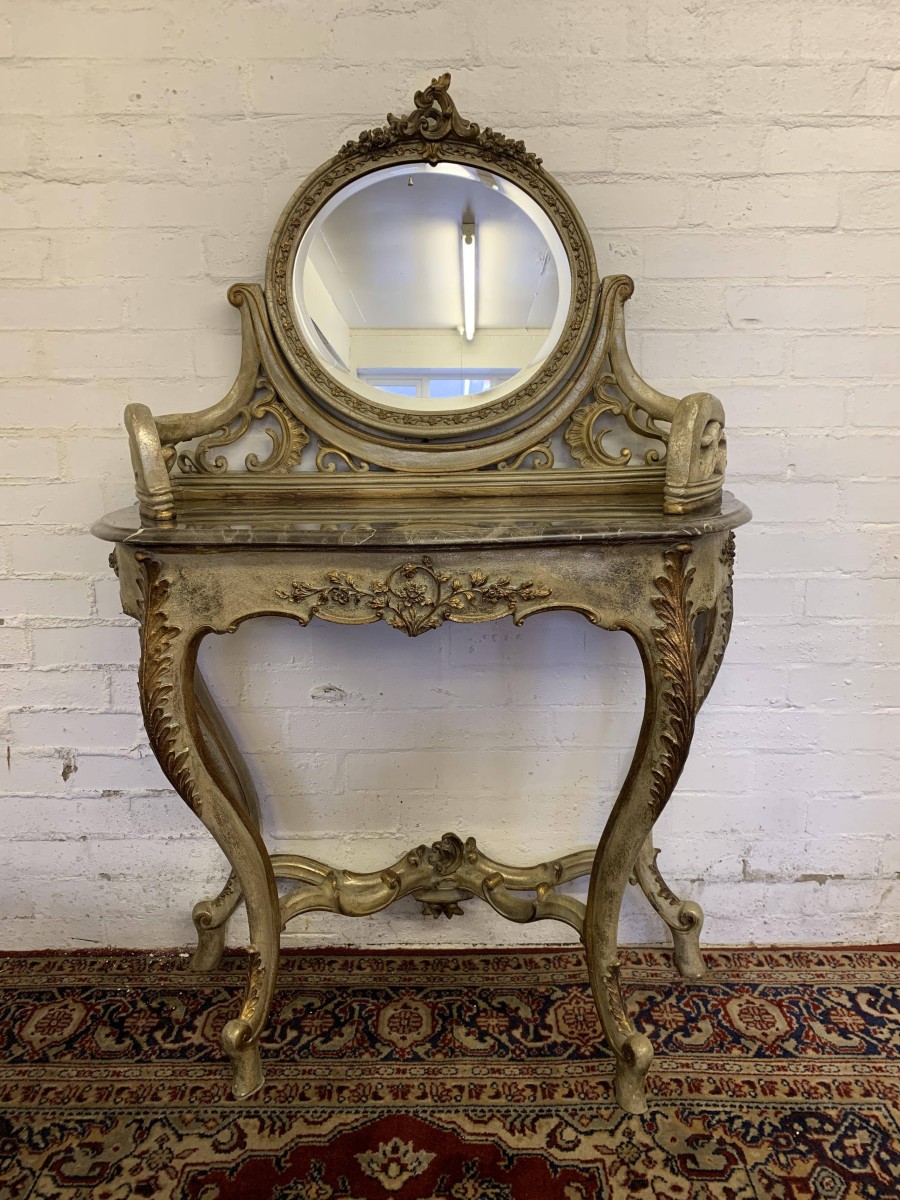 This pretty French dressing table is in excellent condition. Having an oval bevel edged mirror which has fabulous carvings. The mirror sits on a shaped carved stand which in turn sits on a shaped marble. Four shaped guilt carved legs, shaped carved skirt and having four fabulous shaped stretcher supports.