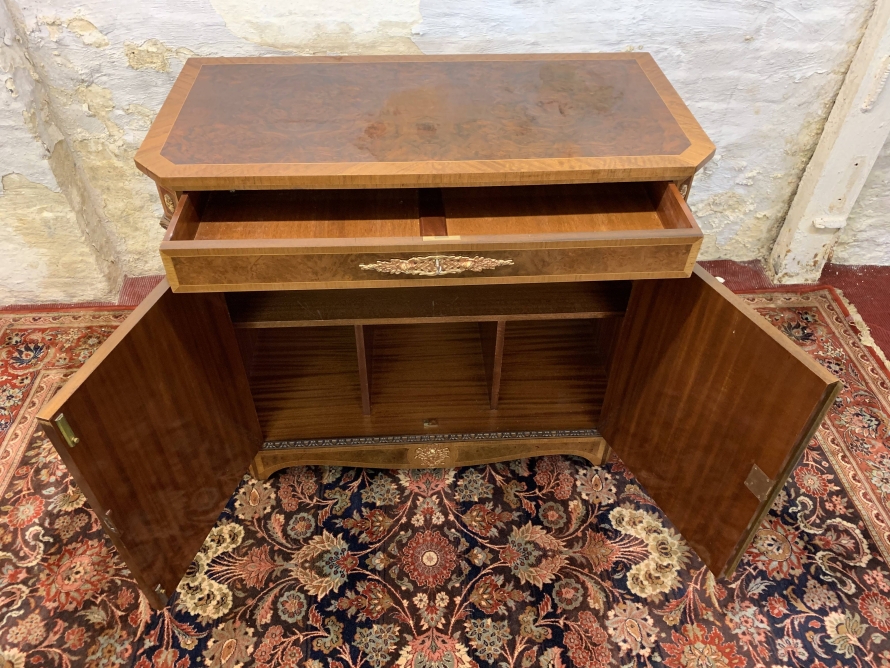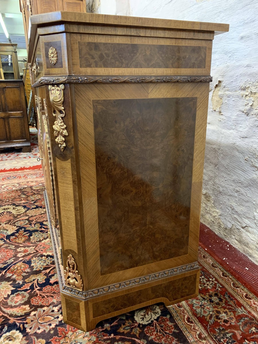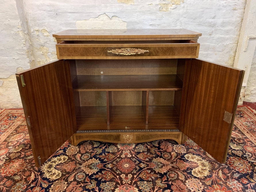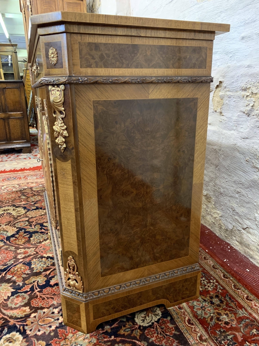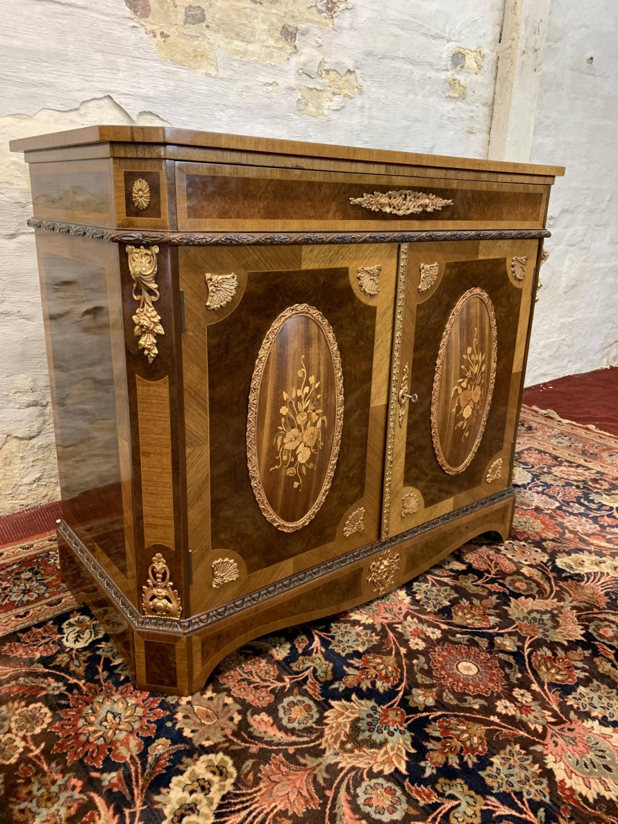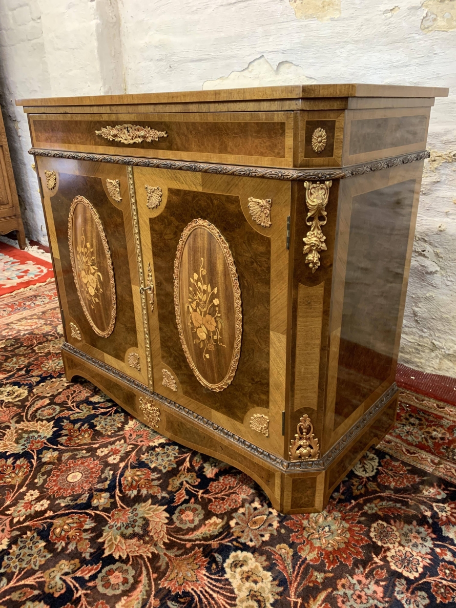 Made in striking walnut. The crossbanded inlaid top has canted corners to the front. Below is a inlaid crossbanded drawer with central decorative ormolu mount. Below are a pair of lockable doors, each door having a fabulous raised inlaid oval panel, ormolu mounts and inlay. There are ormolu mounts to the canted front. Crossbanded and inlaid sides, shaped crossbanded and inlaid skirt base with central ormolu mounts.