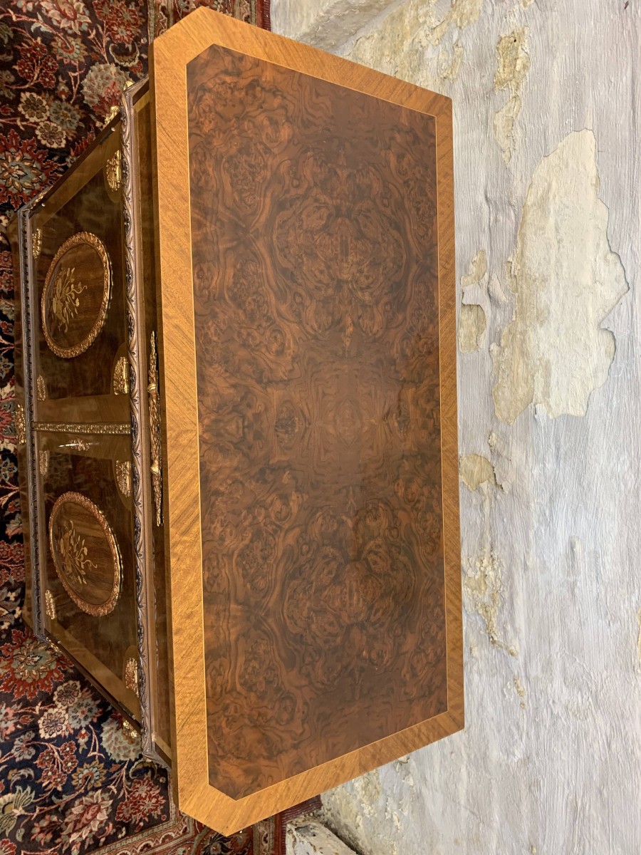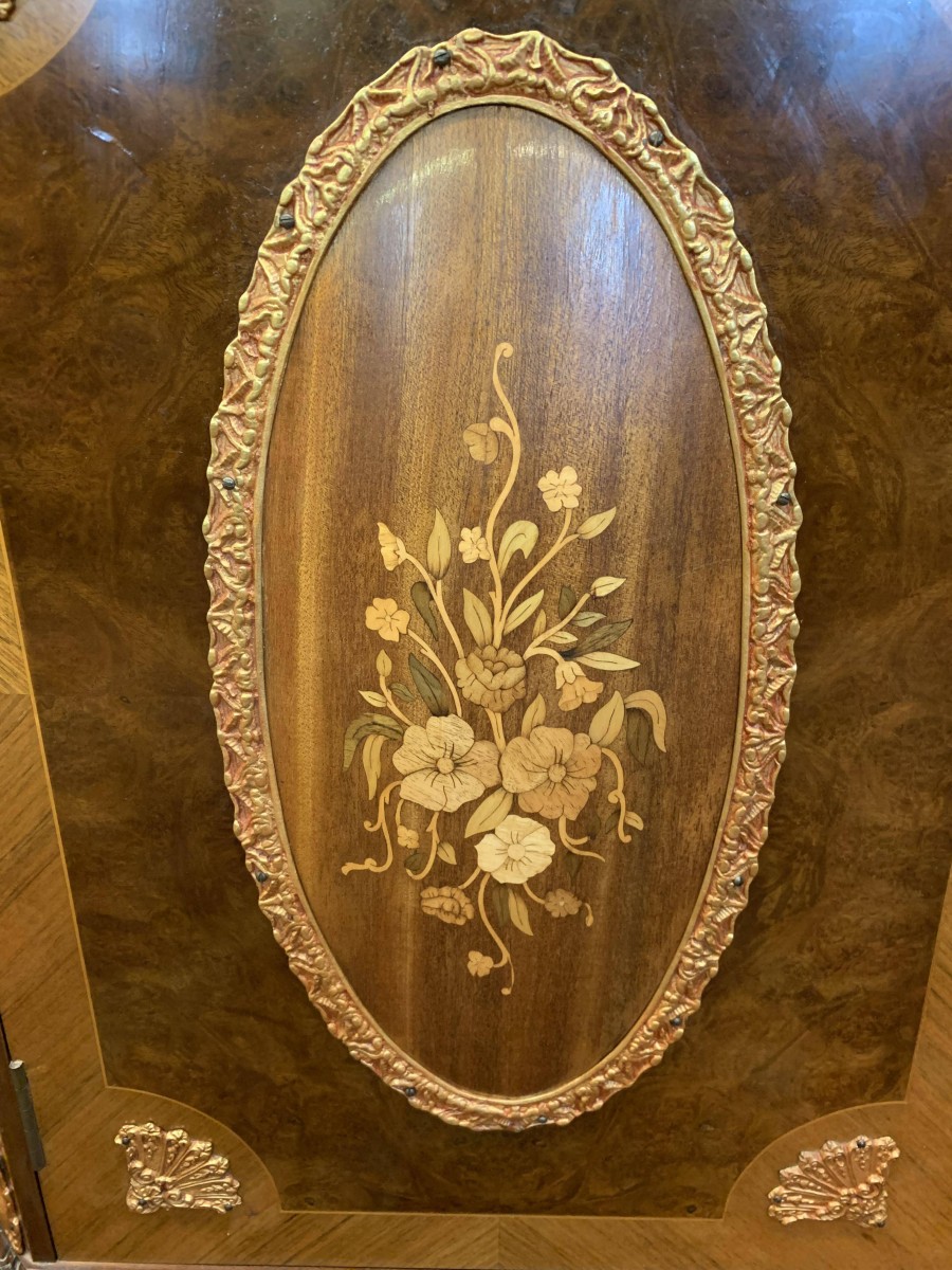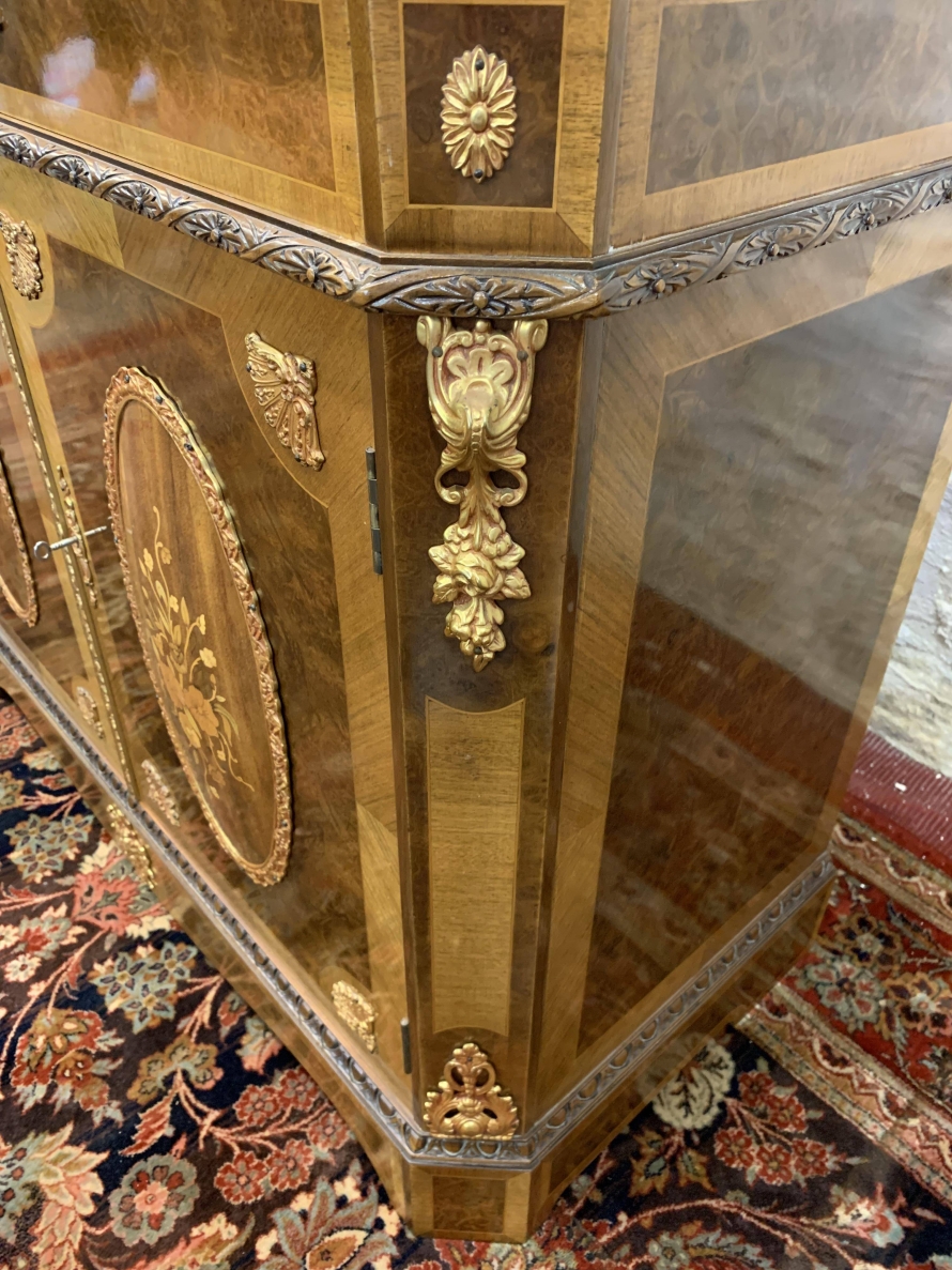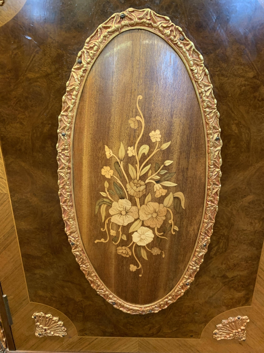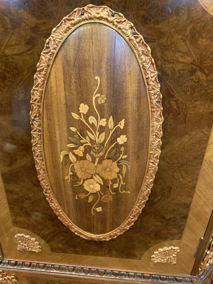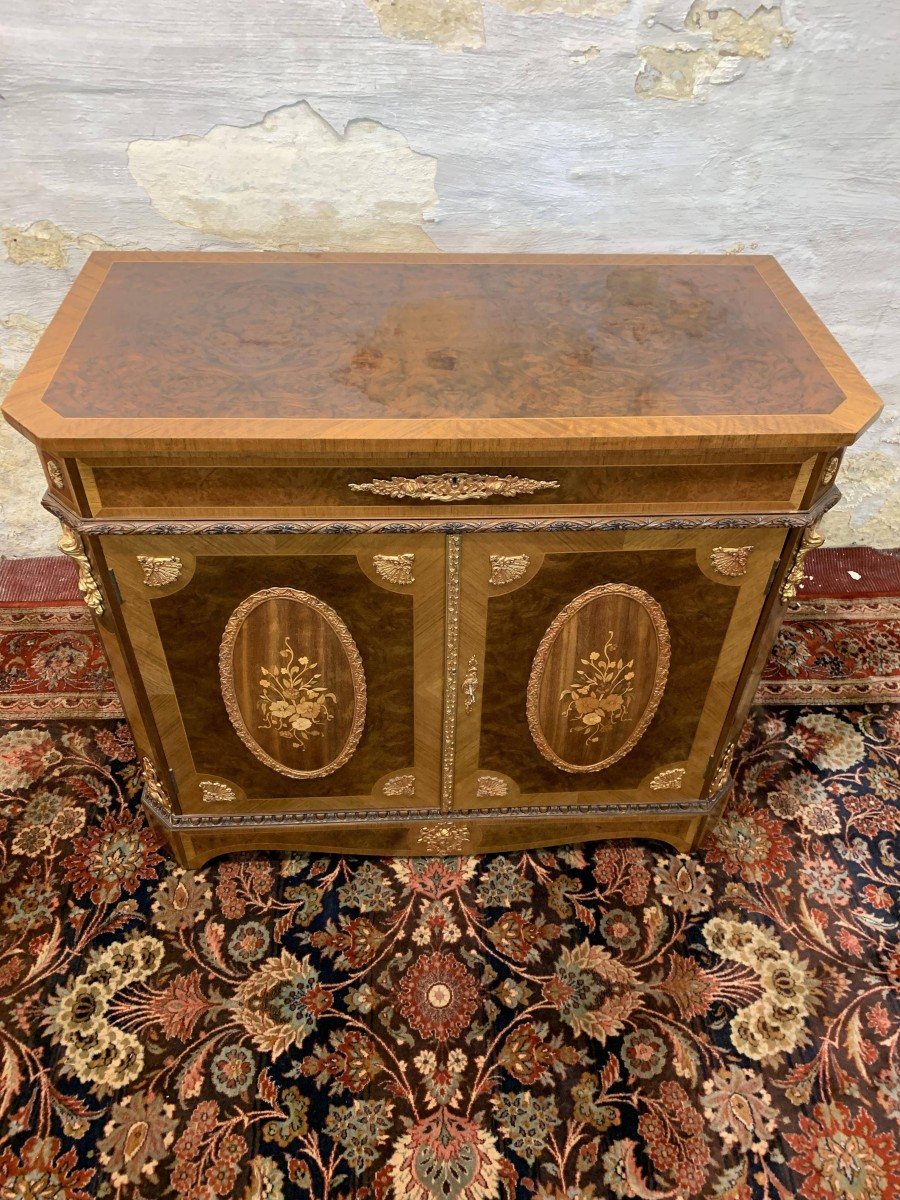 Made in striking walnut. The crossbanded inlaid top has canted corners to the front. Below is a inlaid crossbanded drawer with central decorative ormolu mount. Below are a pair of lockable doors, each door having a fabulous raised inlaid oval panel, ormolu mounts and inlay. There are ormolu mounts to the canted front. Crossbanded and inlaid sides, shaped crossbanded and inlaid skirt base with central ormolu mounts.