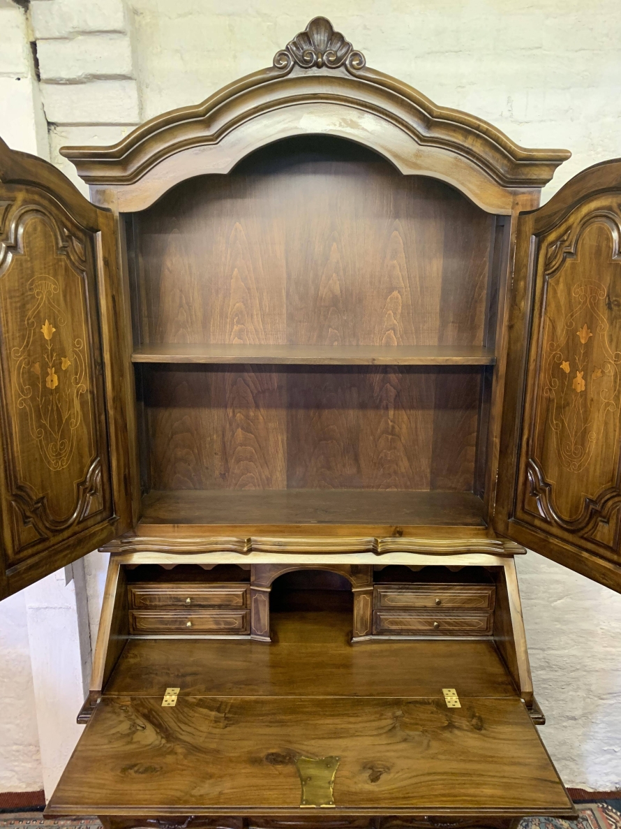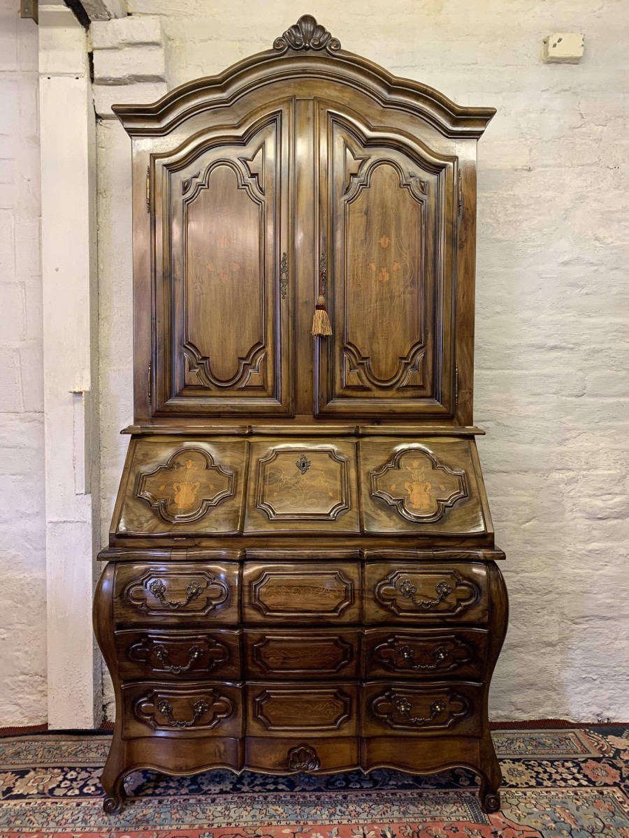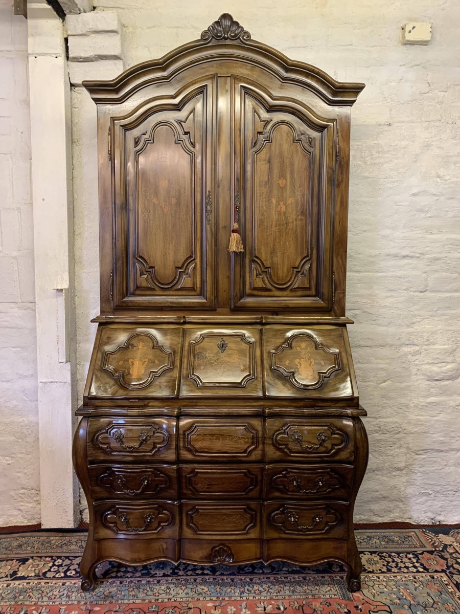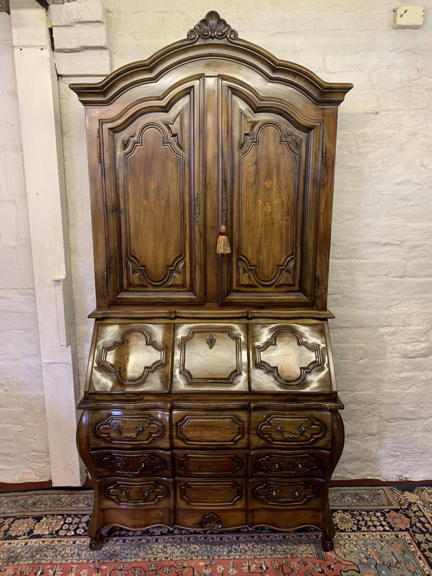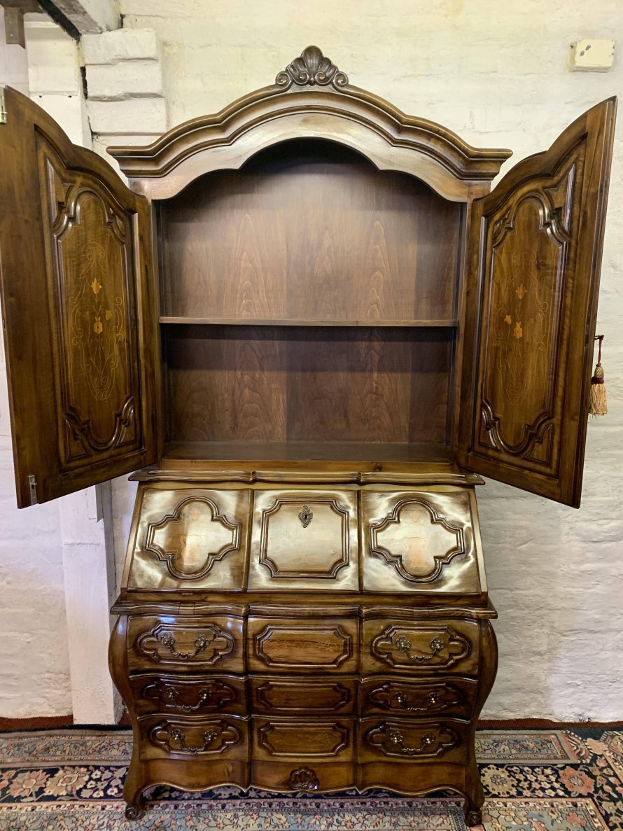 The removable top rises to a central carving. Below are a pair of lockable doors, each door having brass hinges and inlaid panels. The door opens to reveal a removable shelf. The Bombay bureau base has an organic inlaid lockable fall, the fall sits on retractable rests. The fall opens to reveal four inlaid drawers and three storage shelves. Below are three shaped inlaid drawers, each drawer having a pair of decorative brass handles. Shaped panelled sides, this stunning bureau cabinet stands proud on four carved shaped cabriole legs. Outstanding