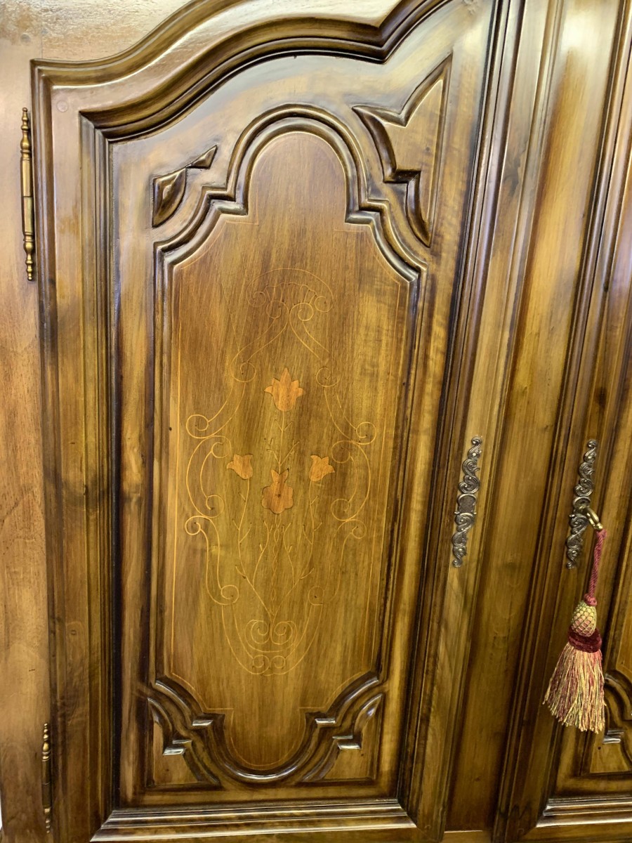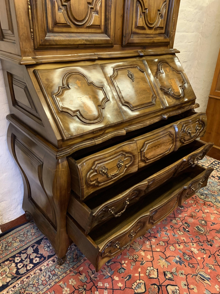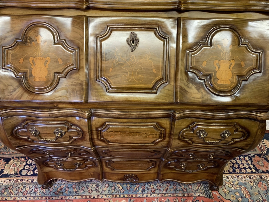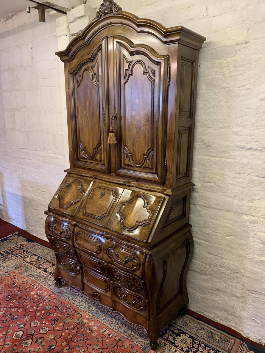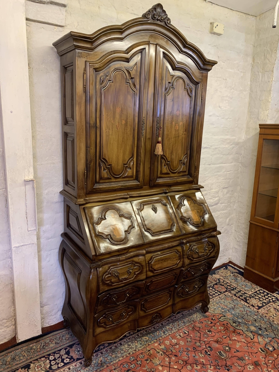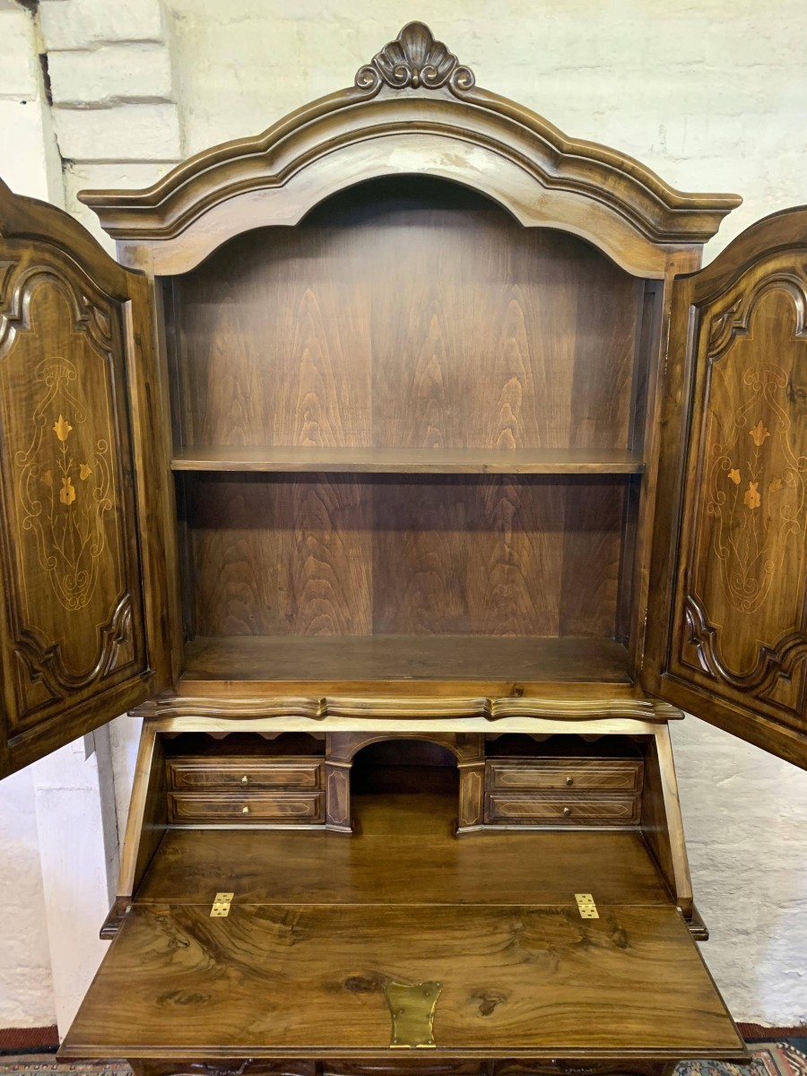 The removable top rises to a central carving. Below are a pair of lockable doors, each door having brass hinges and inlaid panels. The door opens to reveal a removable shelf. The Bombay bureau base has an organic inlaid lockable fall, the fall sits on retractable rests. The fall opens to reveal four inlaid drawers and three storage shelves. Below are three shaped inlaid drawers, each drawer having a pair of decorative brass handles. Shaped panelled sides, this stunning bureau cabinet stands proud on four carved shaped cabriole legs. Outstanding