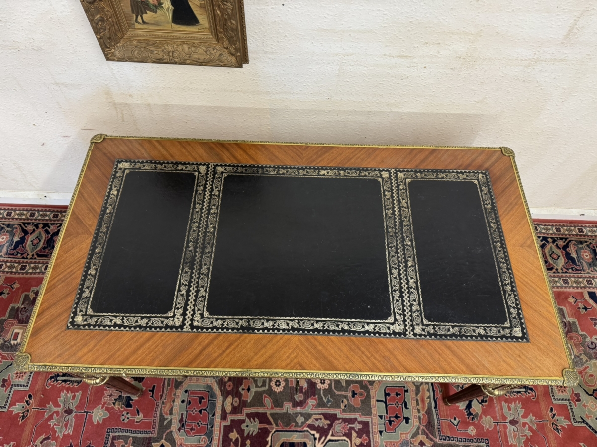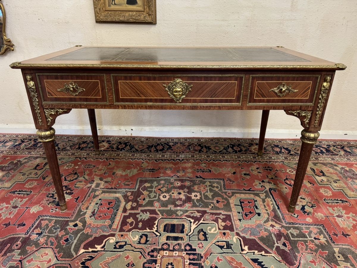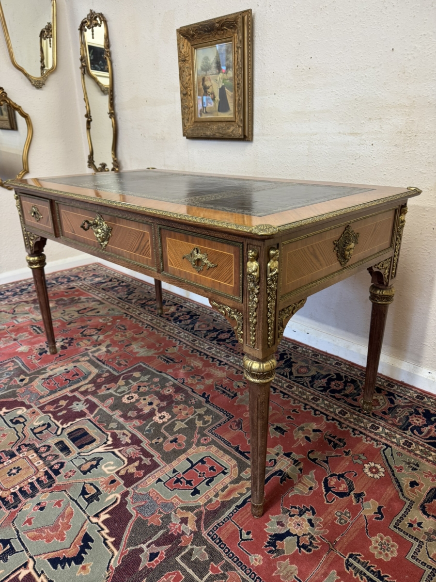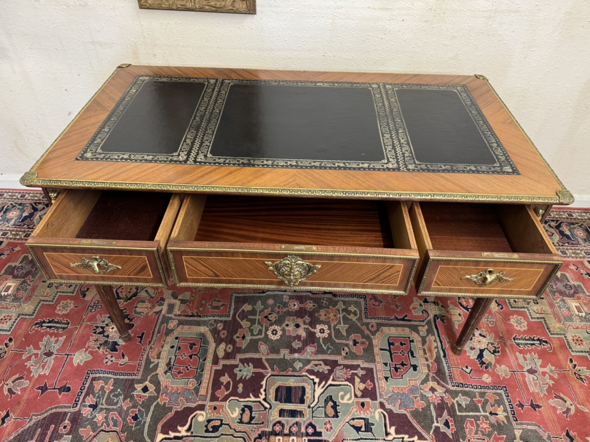 In fabulous condition. The top is inset with three tooled black leather writing panels bordered by a gilt embossed trim, framed within a beautiful kingwood parquetry surface. There is carved ormolu edging. The central drawer is flanked by two smaller drawers, ormolu decoration and gilt mounts through out and standing on four reeded and tapered legs with ormolu caps.