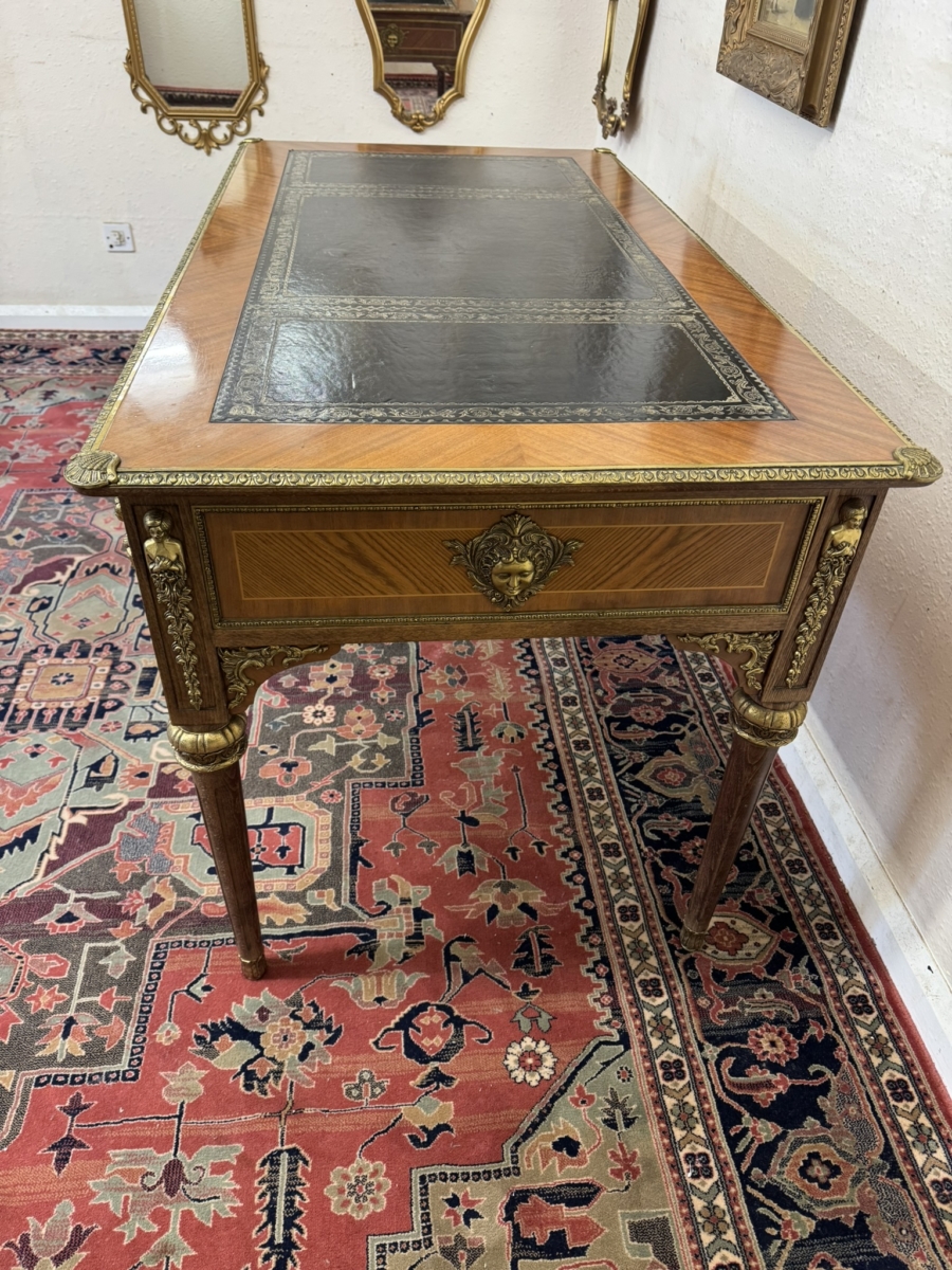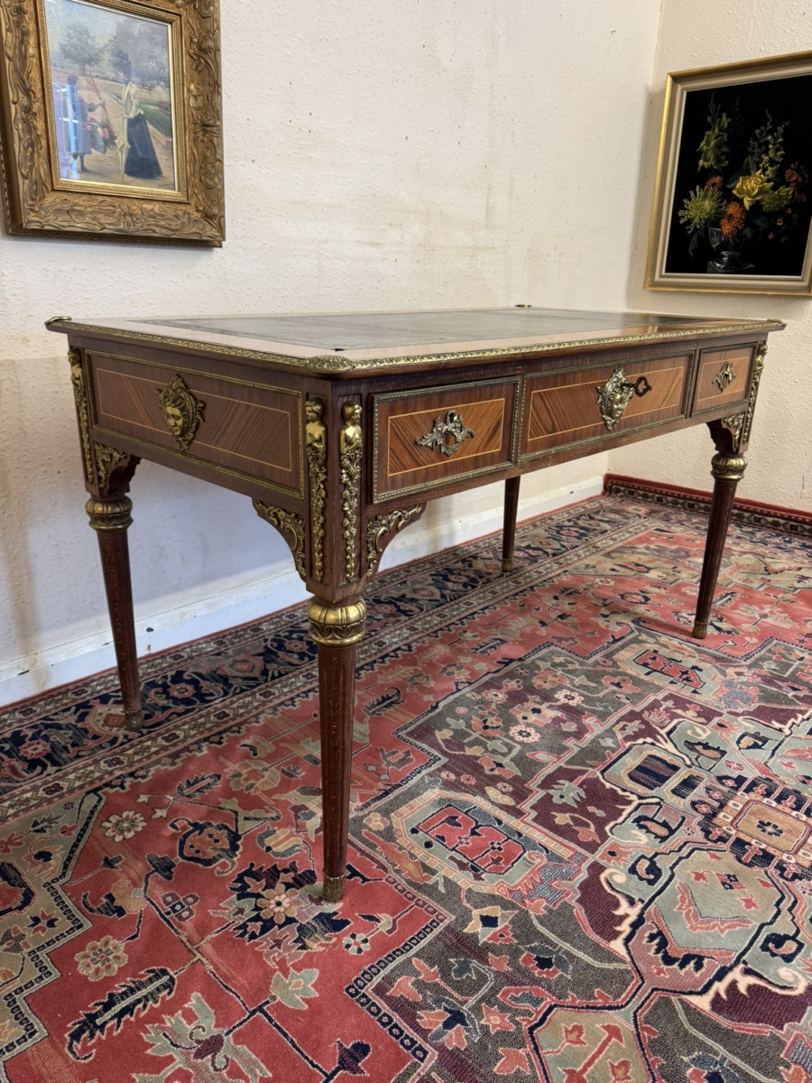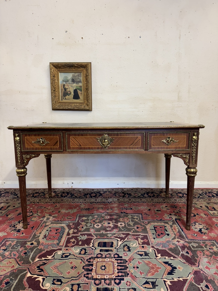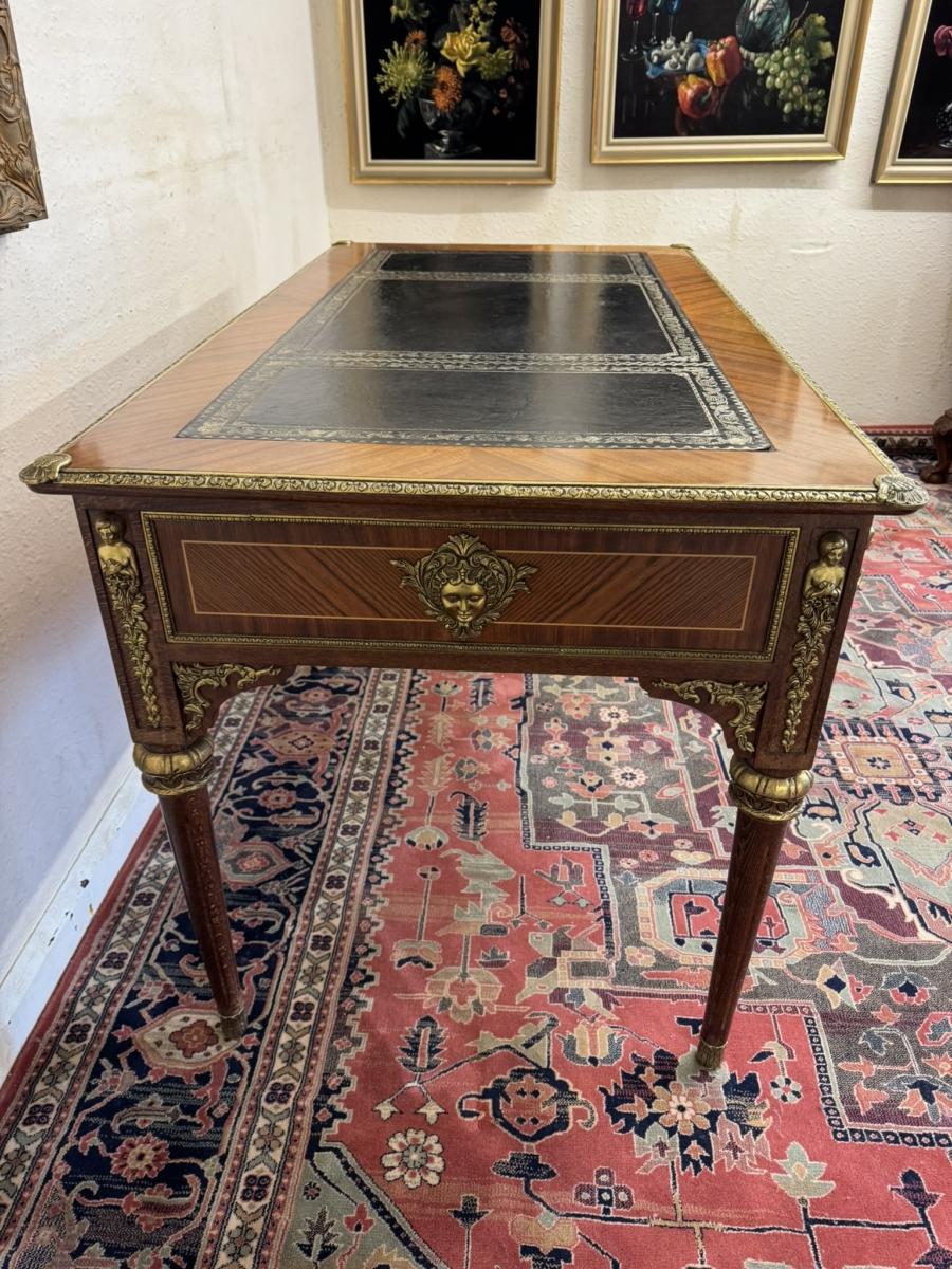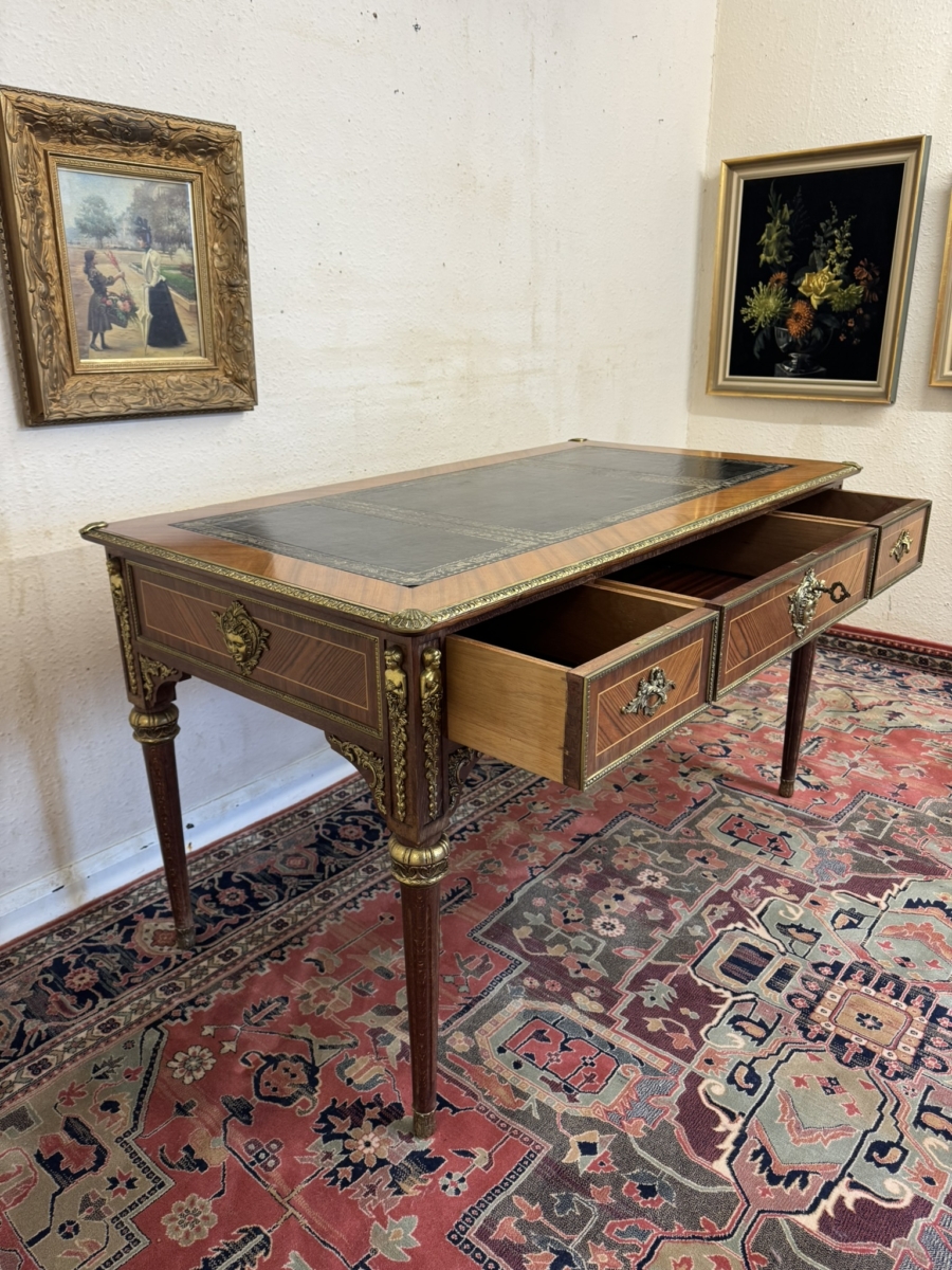 In fabulous condition. The top is inset with three tooled black leather writing panels bordered by a gilt embossed trim, framed within a beautiful kingwood parquetry surface. There is carved ormolu edging. The central drawer is flanked by two smaller drawers, ormolu decoration and gilt mounts through out and standing on four reeded and tapered legs with ormolu caps.
