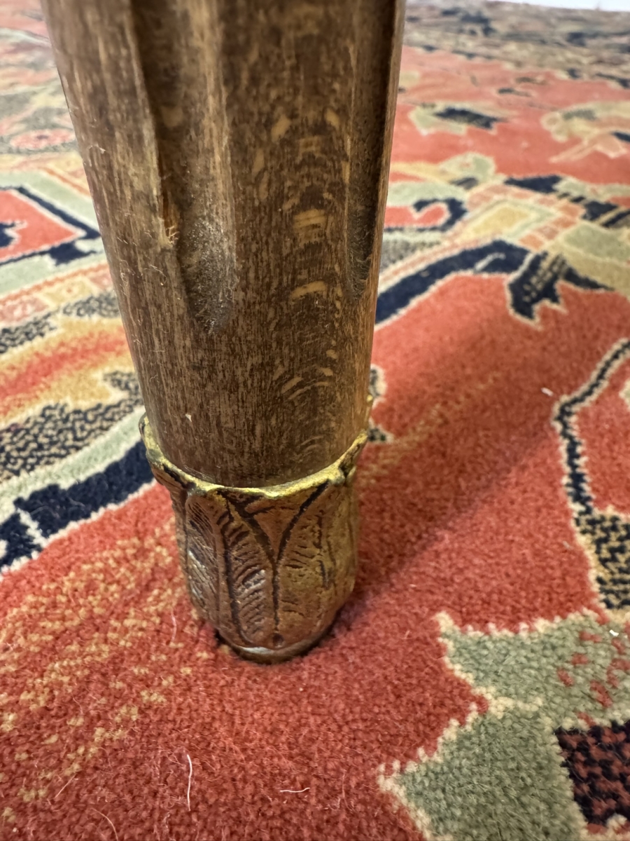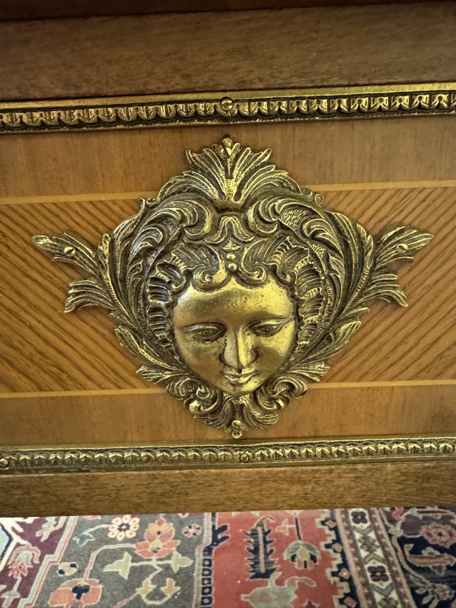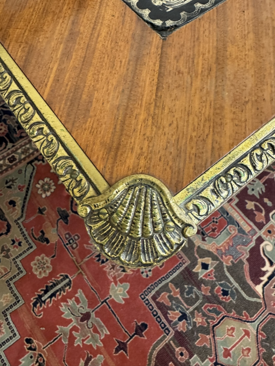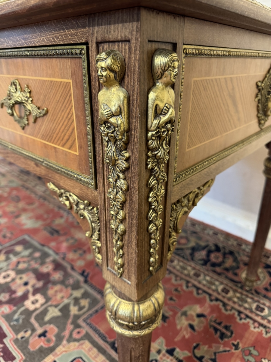 In fabulous condition. The top is inset with three tooled black leather writing panels bordered by a gilt embossed trim, framed within a beautiful kingwood parquetry surface. There is carved ormolu edging. The central drawer is flanked by two smaller drawers, ormolu decoration and gilt mounts through out and standing on four reeded and tapered legs with ormolu caps.