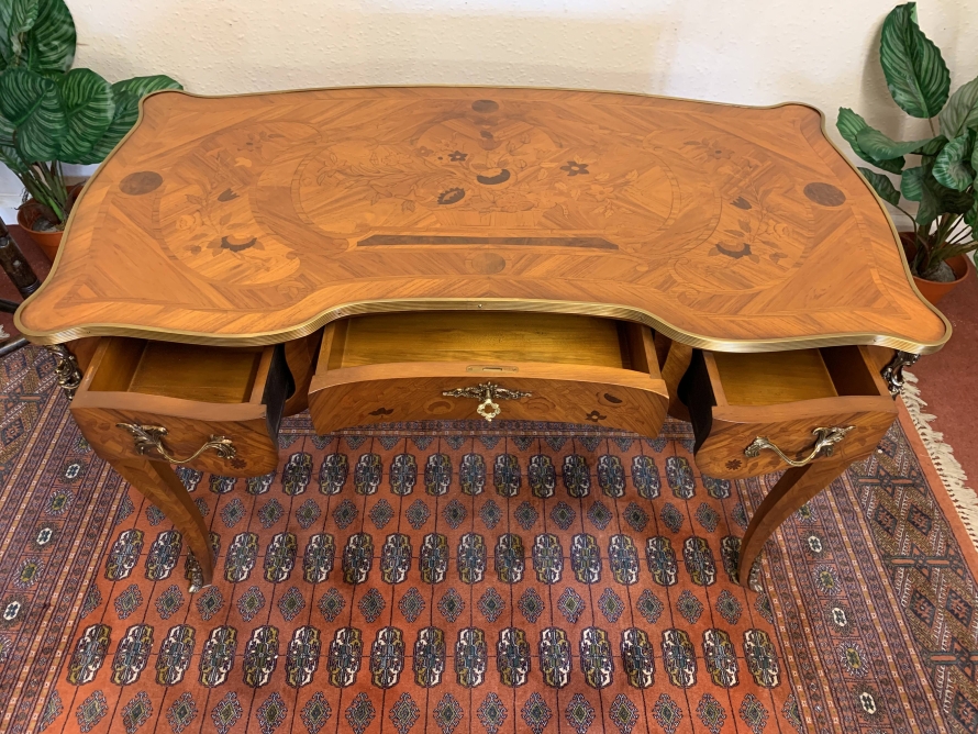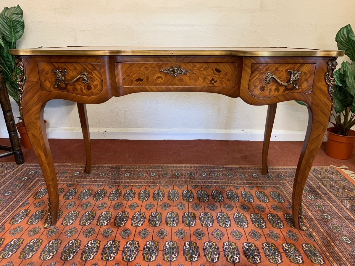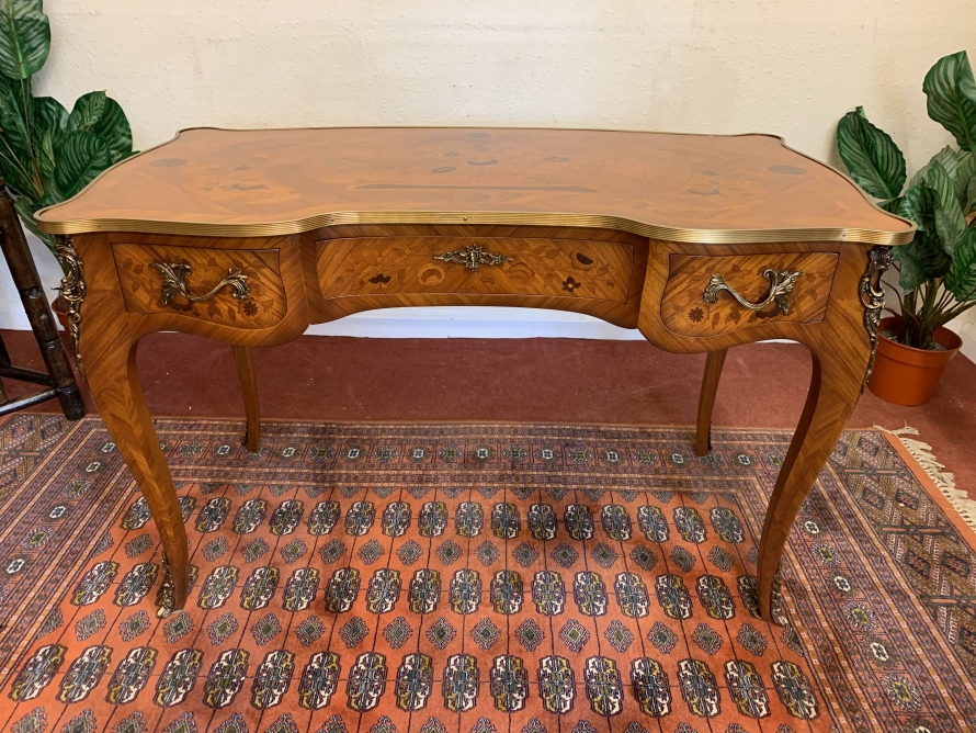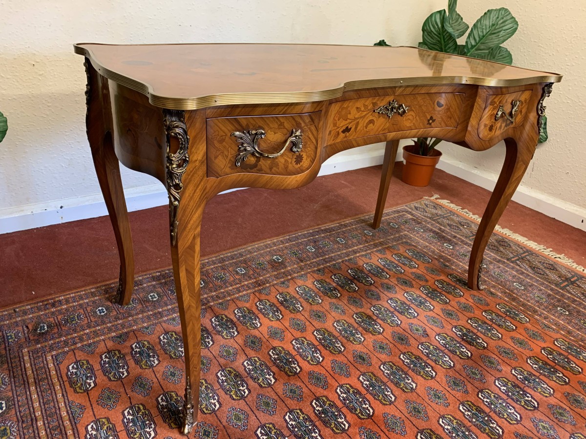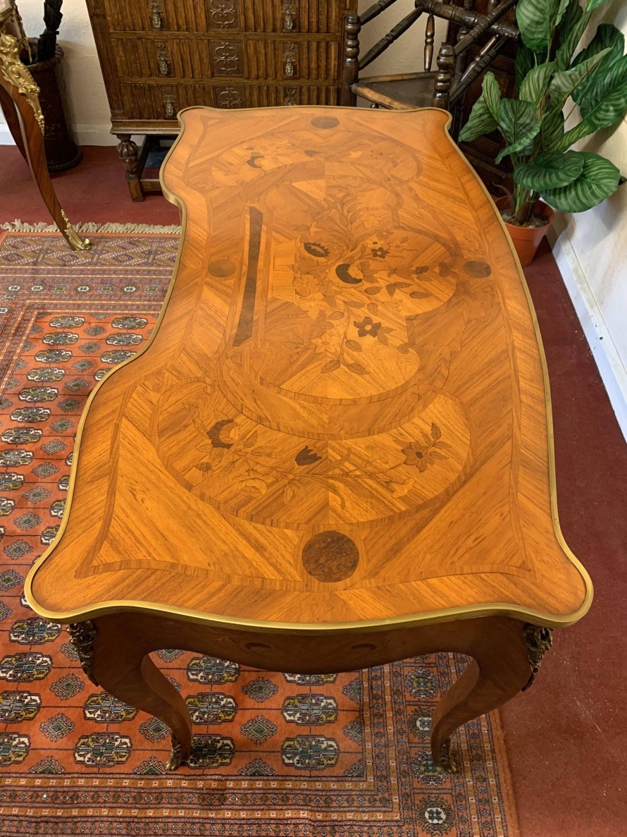 This exceptional shaped desk is in excellent condition. Shaped and decorated throughout with marquetry inlay this desk can be admired from every angle. Made from numerous exotic woods including olive wood, tulip wood and rosewood. The shaped top has a brass edging. Below is a shaped lockable drawer, the drawer having ormolu decoration and key. The central drawer is flanked by a pair of smaller shaped drawers, each drawer having an ornate ormolu handle. Each of the four shaped legs have ormolu mounts to the top and feet. A beautiful item of French furniture.