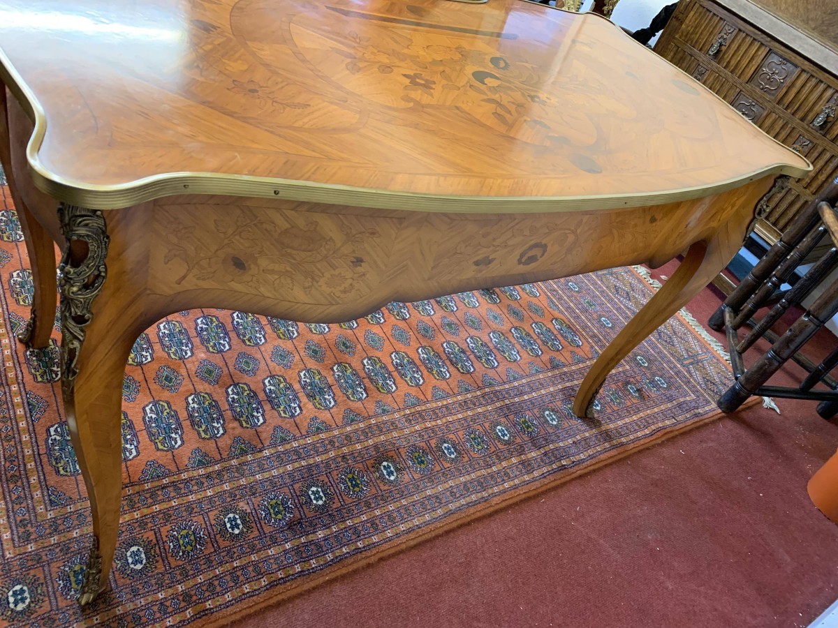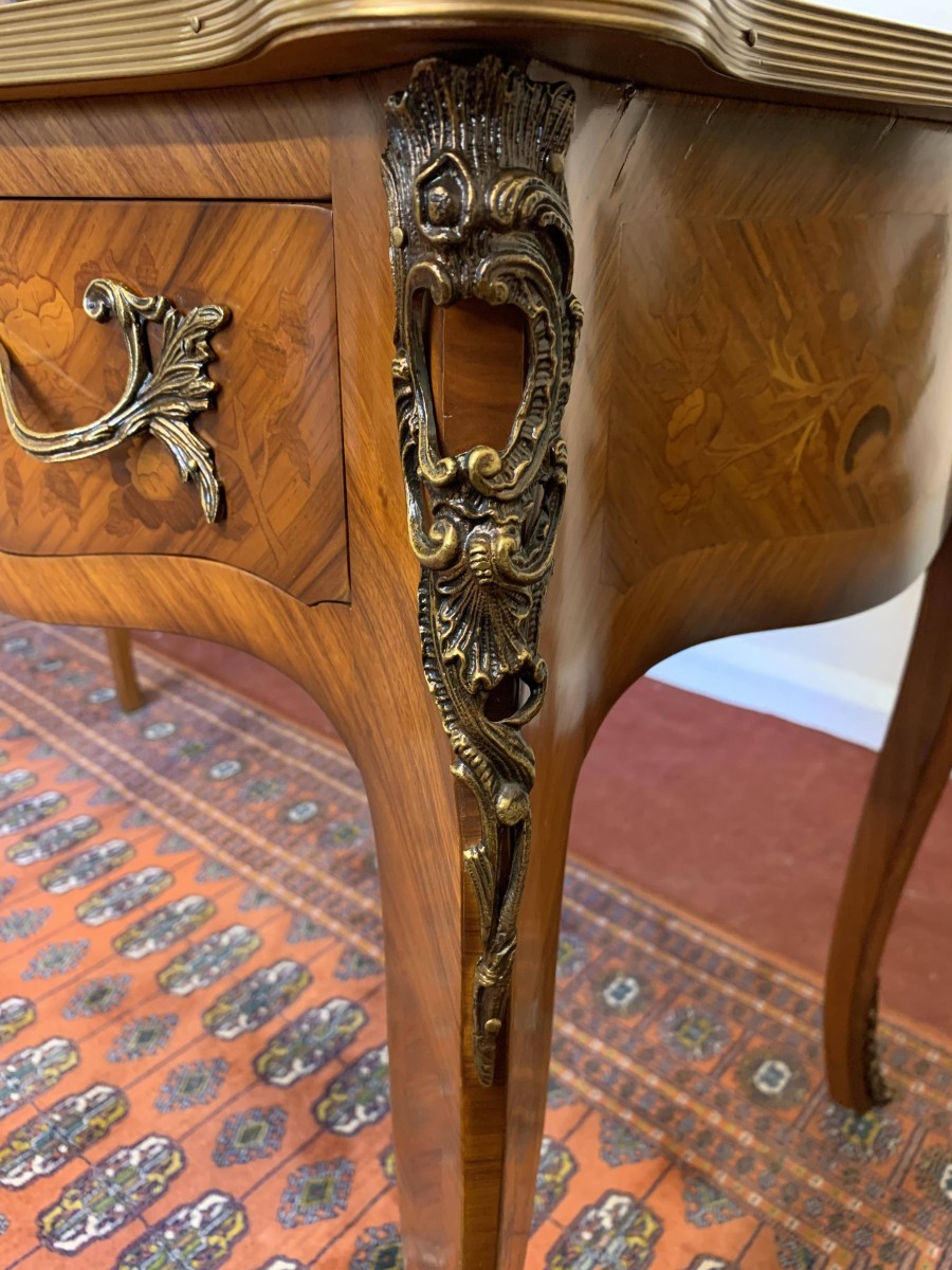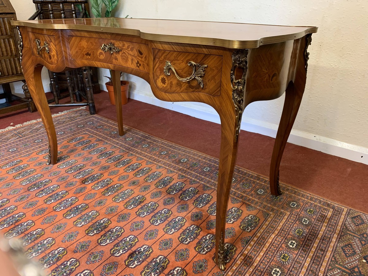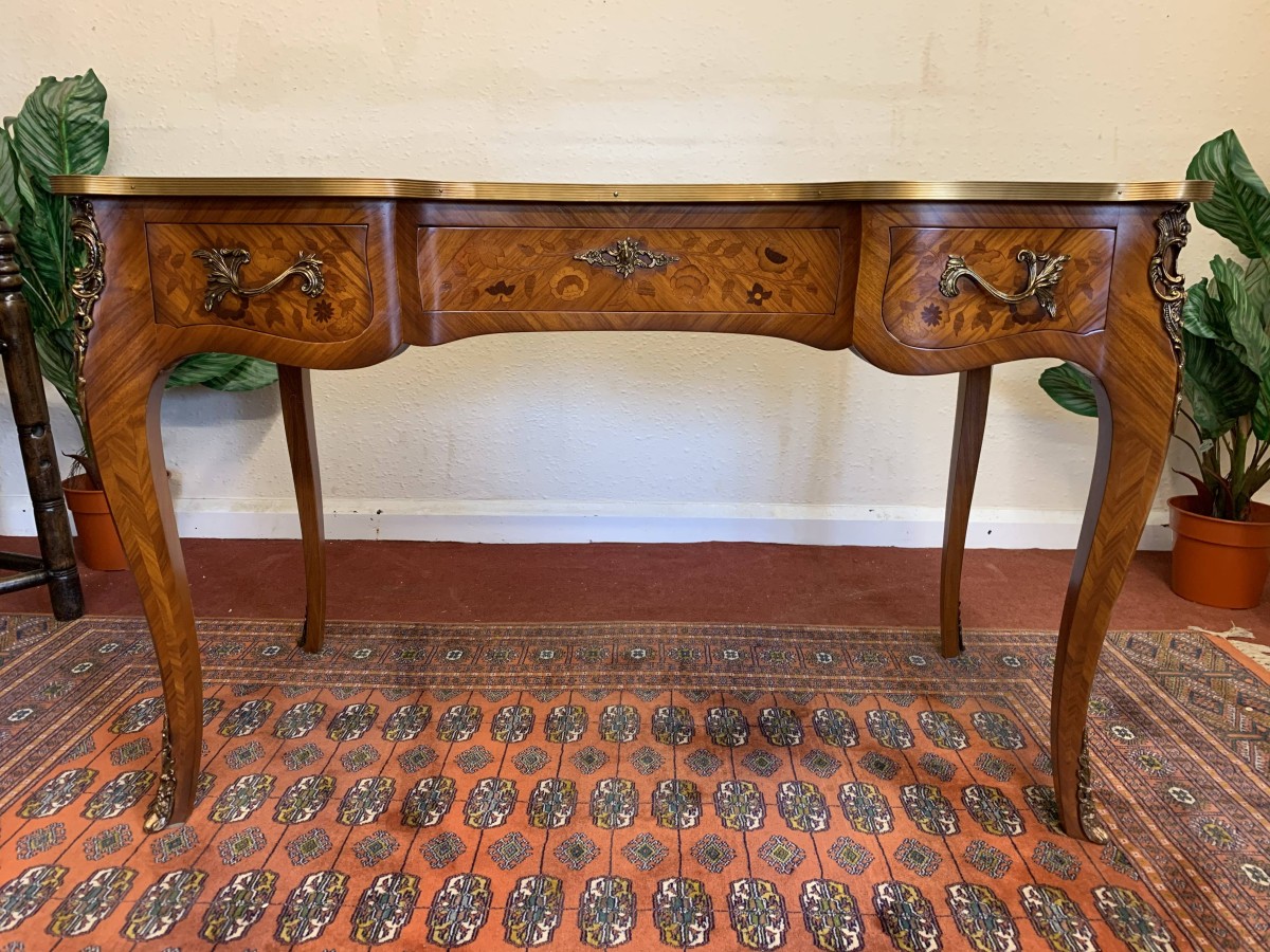This exceptional shaped desk is in excellent condition. Shaped and decorated throughout with marquetry inlay this desk can be admired from every angle. Made from numerous exotic woods including olive wood, tulip wood and rosewood. The shaped top has a brass edging. Below is a shaped lockable drawer, the drawer having ormolu decoration and key. The central drawer is flanked by a pair of smaller shaped drawers, each drawer having an ornate ormolu handle. Each of the four shaped legs have ormolu mounts to the top and feet. A beautiful item of French furniture.