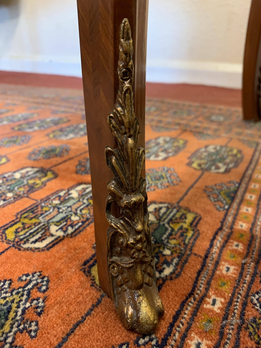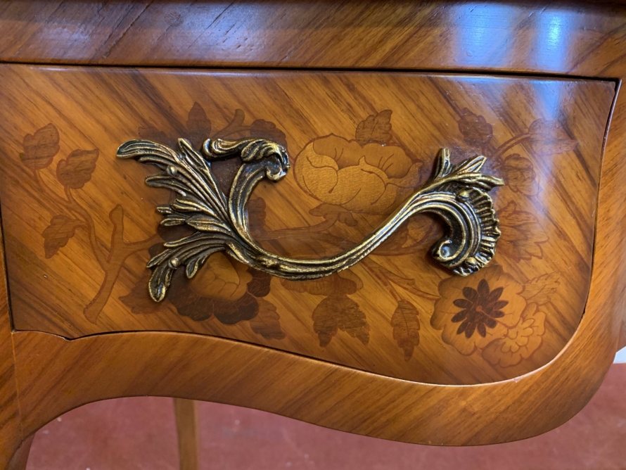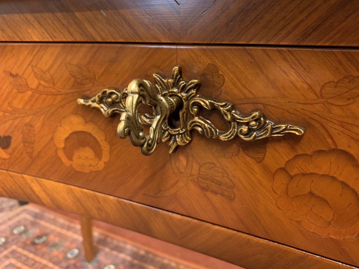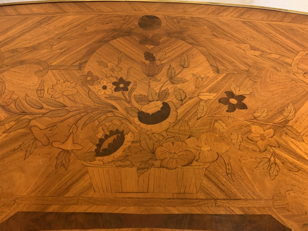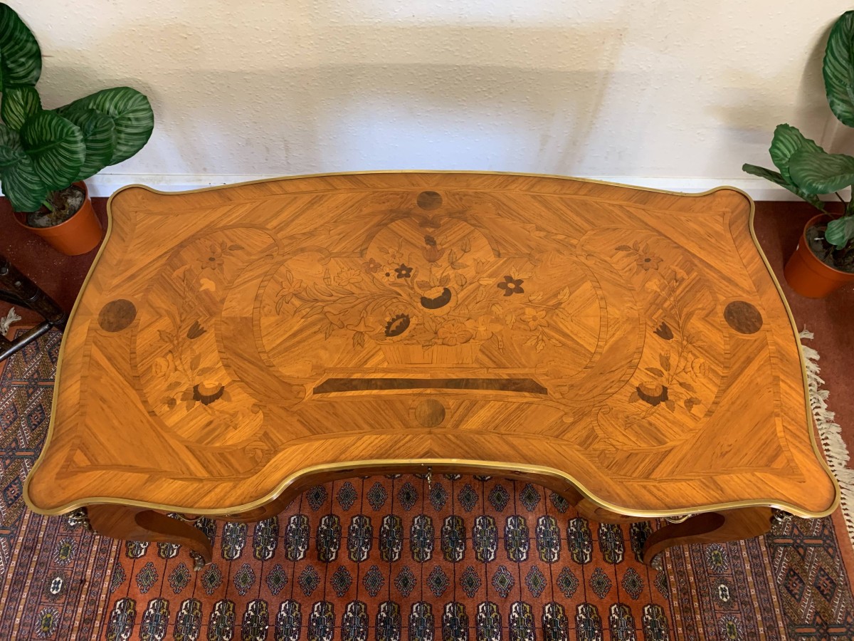 This exceptional shaped desk is in excellent condition. Shaped and decorated throughout with marquetry inlay this desk can be admired from every angle. Made from numerous exotic woods including olive wood, tulip wood and rosewood. The shaped top has a brass edging. Below is a shaped lockable drawer, the drawer having ormolu decoration and key. The central drawer is flanked by a pair of smaller shaped drawers, each drawer having an ornate ormolu handle. Each of the four shaped legs have ormolu mounts to the top and feet. A beautiful item of French furniture.