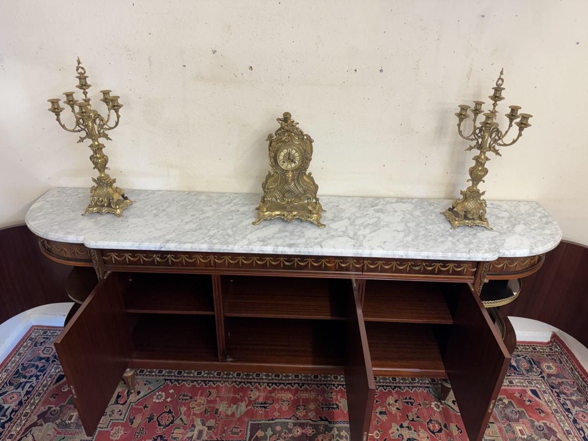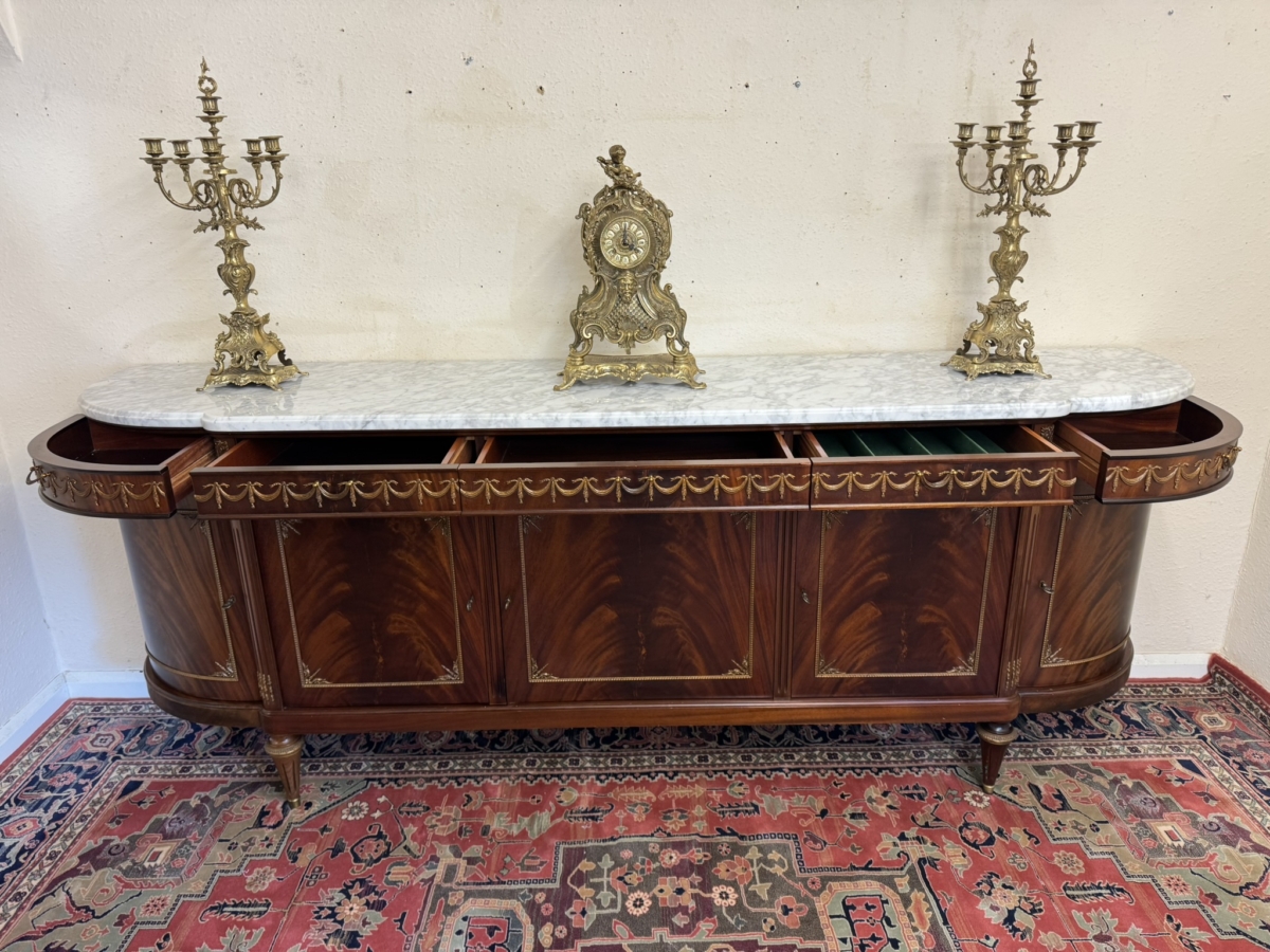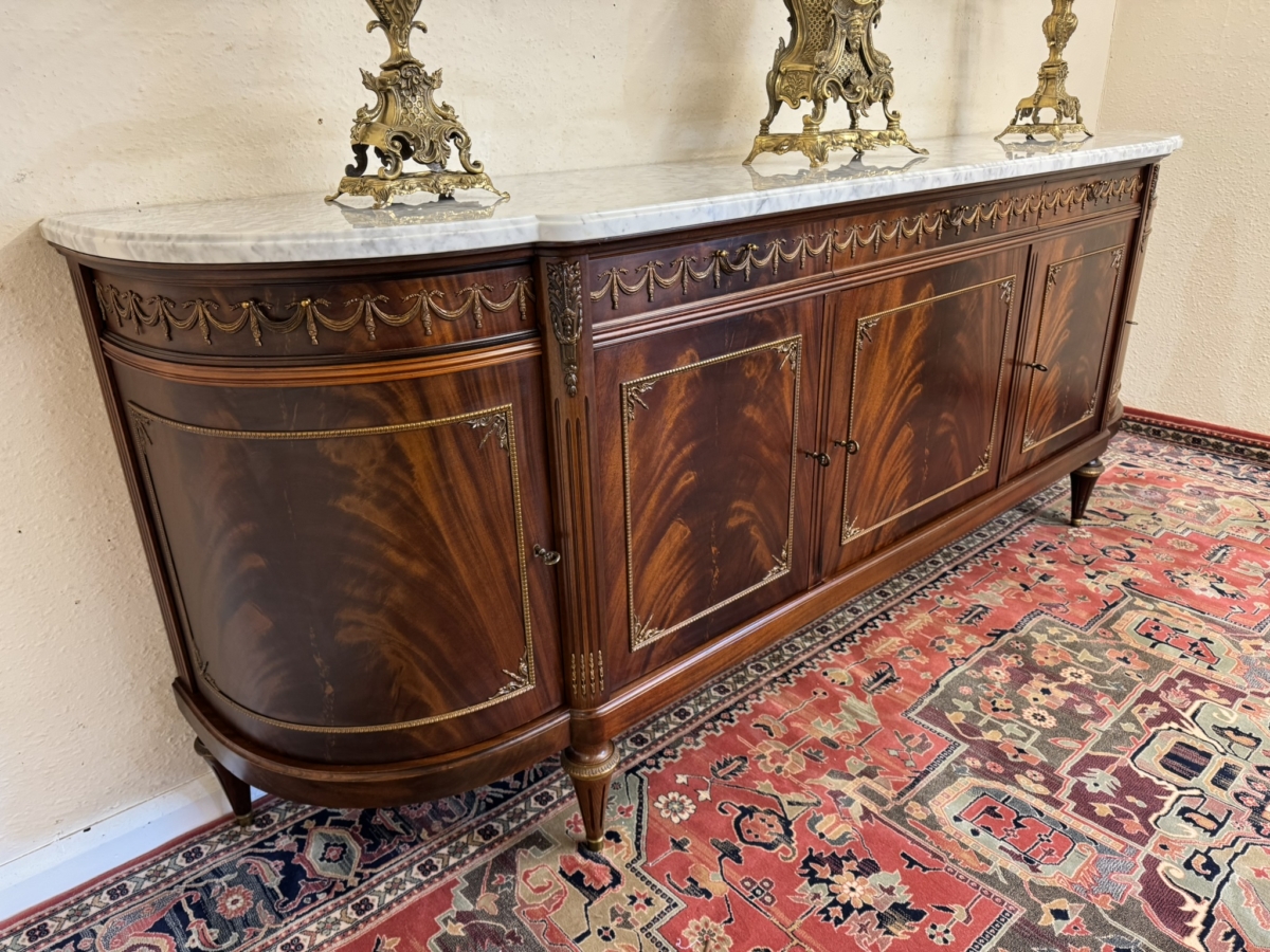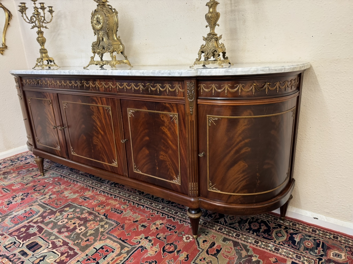 This fabulous French marble top credenza is in excellent condition. The credenza has a carrera white marble top. The left-hand curved door has a curved drawer above, the door opens to reveal a curved removable shelf. The three central lockable doors have drawers above and open to reveal a shelf. The right-hand curved door has a curved drawer above, the cupboard door opens to reveal two glass mirrored shelves with brass decoration. This outstanding quality French credenza sits on six turned reeded legs with ormolu decoration and sitting on brass capped feet.