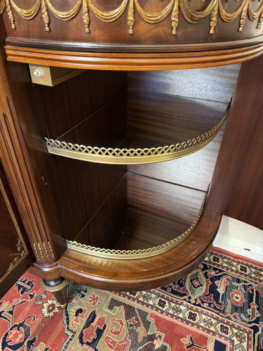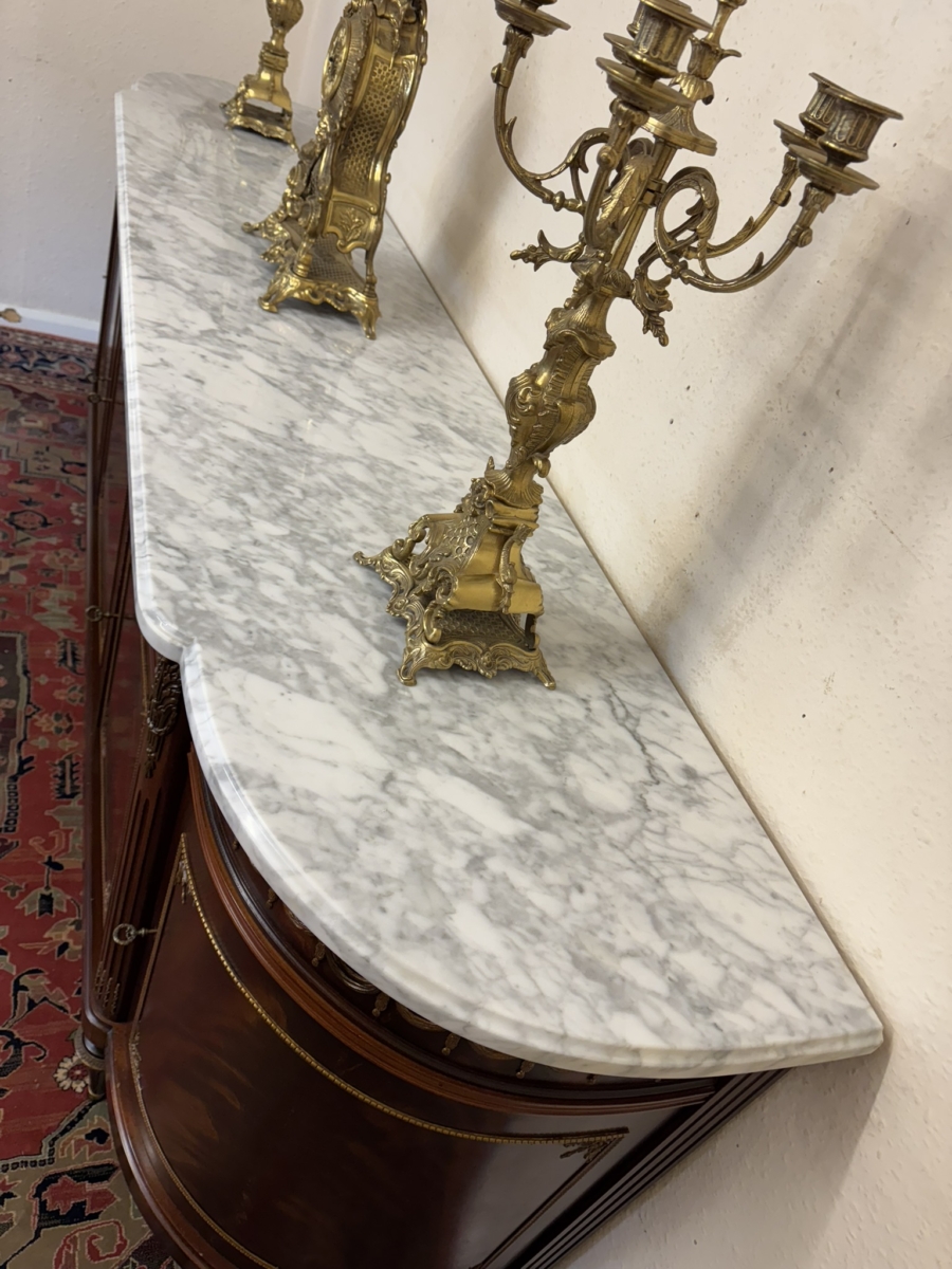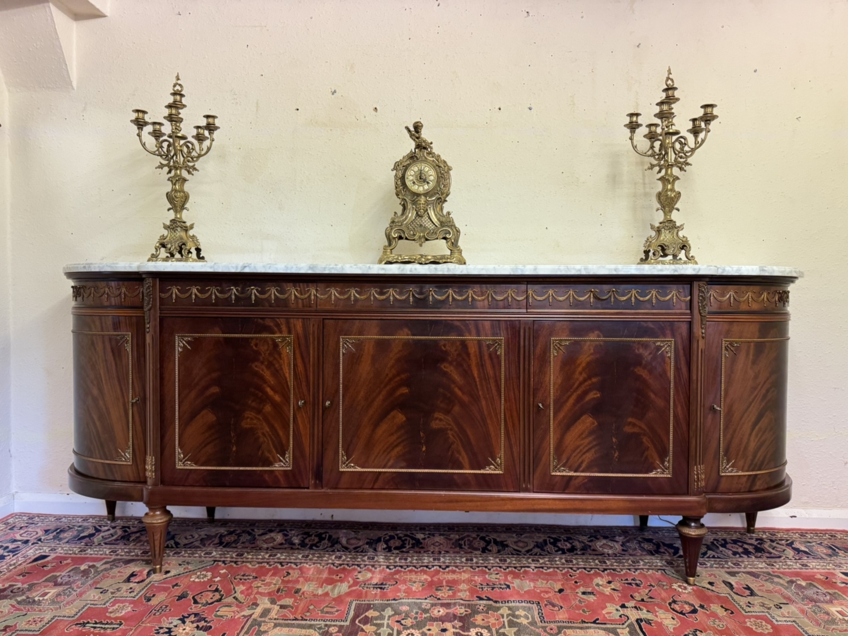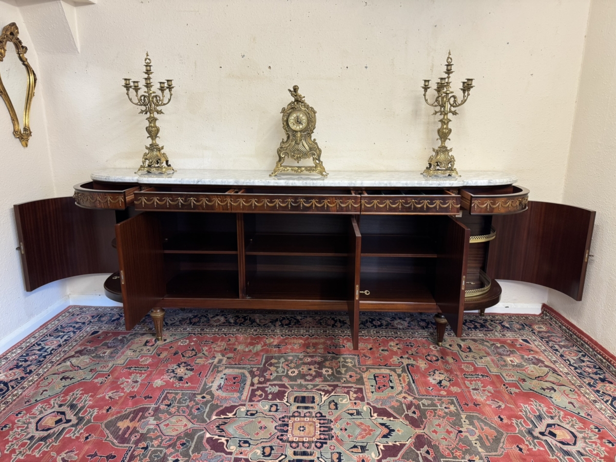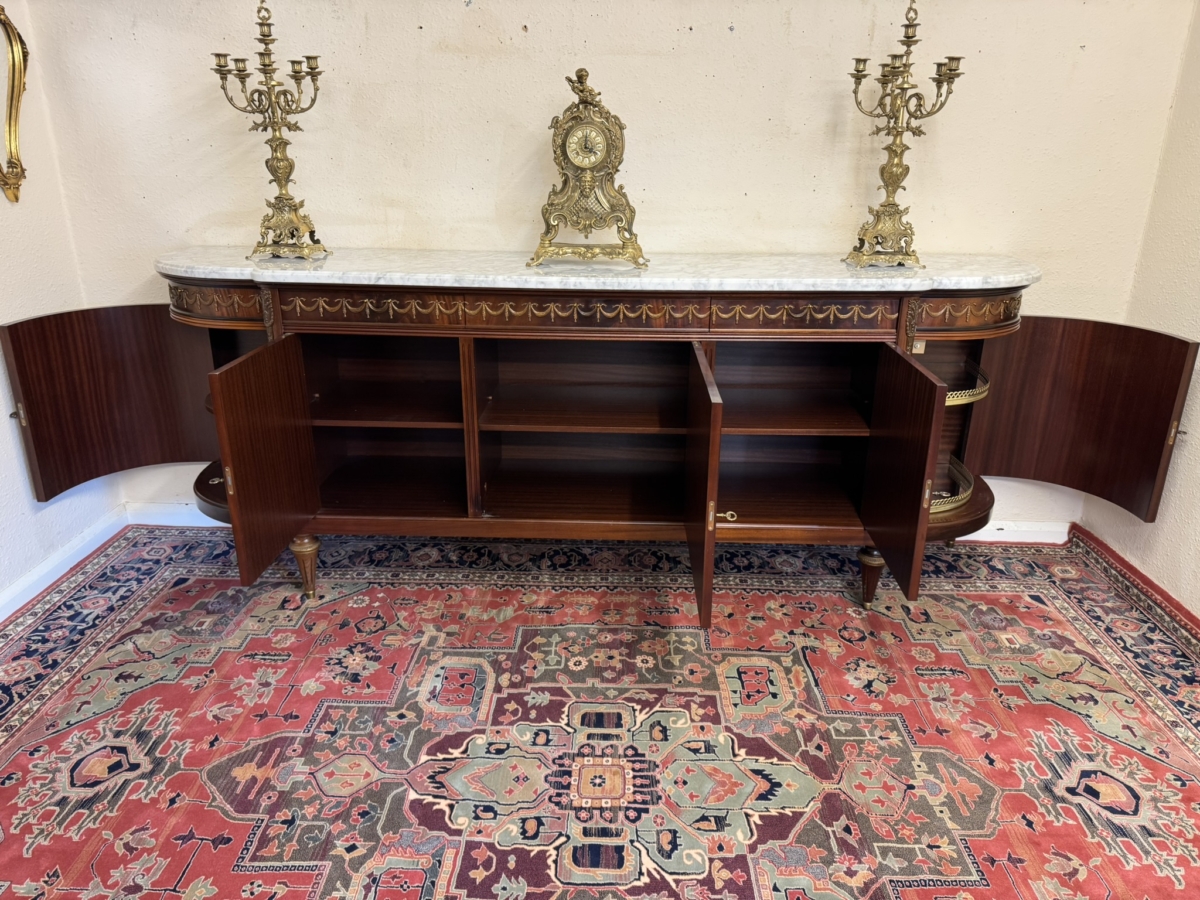 This fabulous French marble top credenza is in excellent condition. The credenza has a carrera white marble top. The left-hand curved door has a curved drawer above, the door opens to reveal a curved removable shelf. The three central lockable doors have drawers above and open to reveal a shelf. The right-hand curved door has a curved drawer above, the cupboard door opens to reveal two glass mirrored shelves with brass decoration. This outstanding quality French credenza sits on six turned reeded legs with ormolu decoration and sitting on brass capped feet.