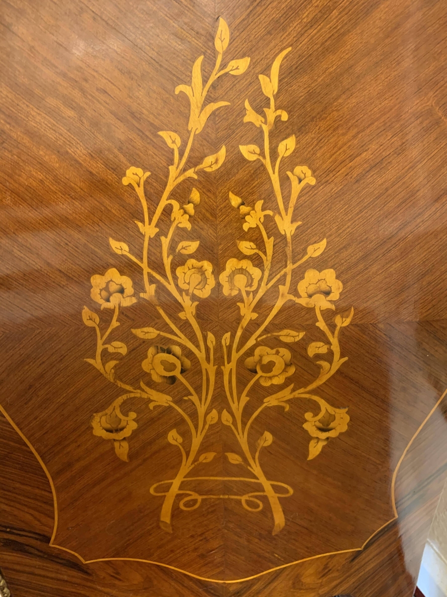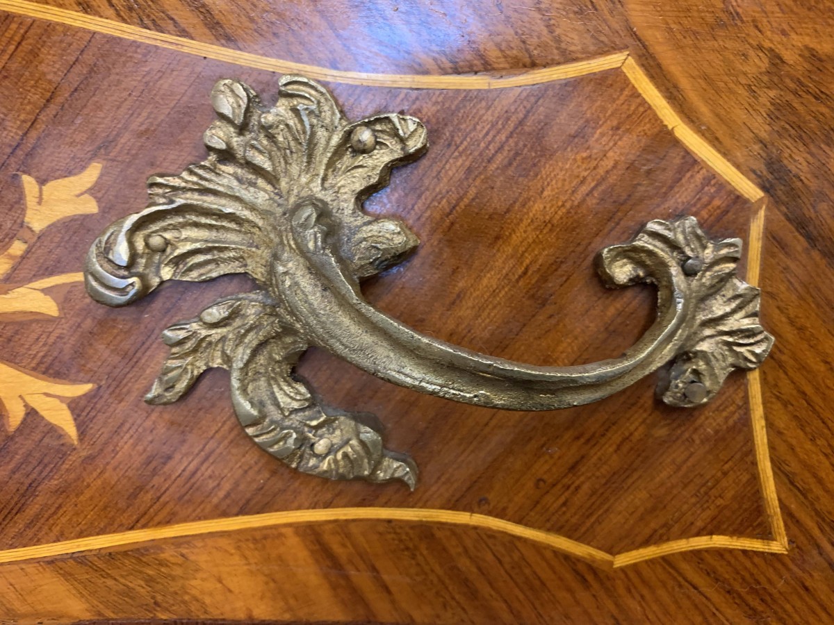 Stunning French Marquetry Inlaid Bombay Shaped Marble Top Commode – Now Sold