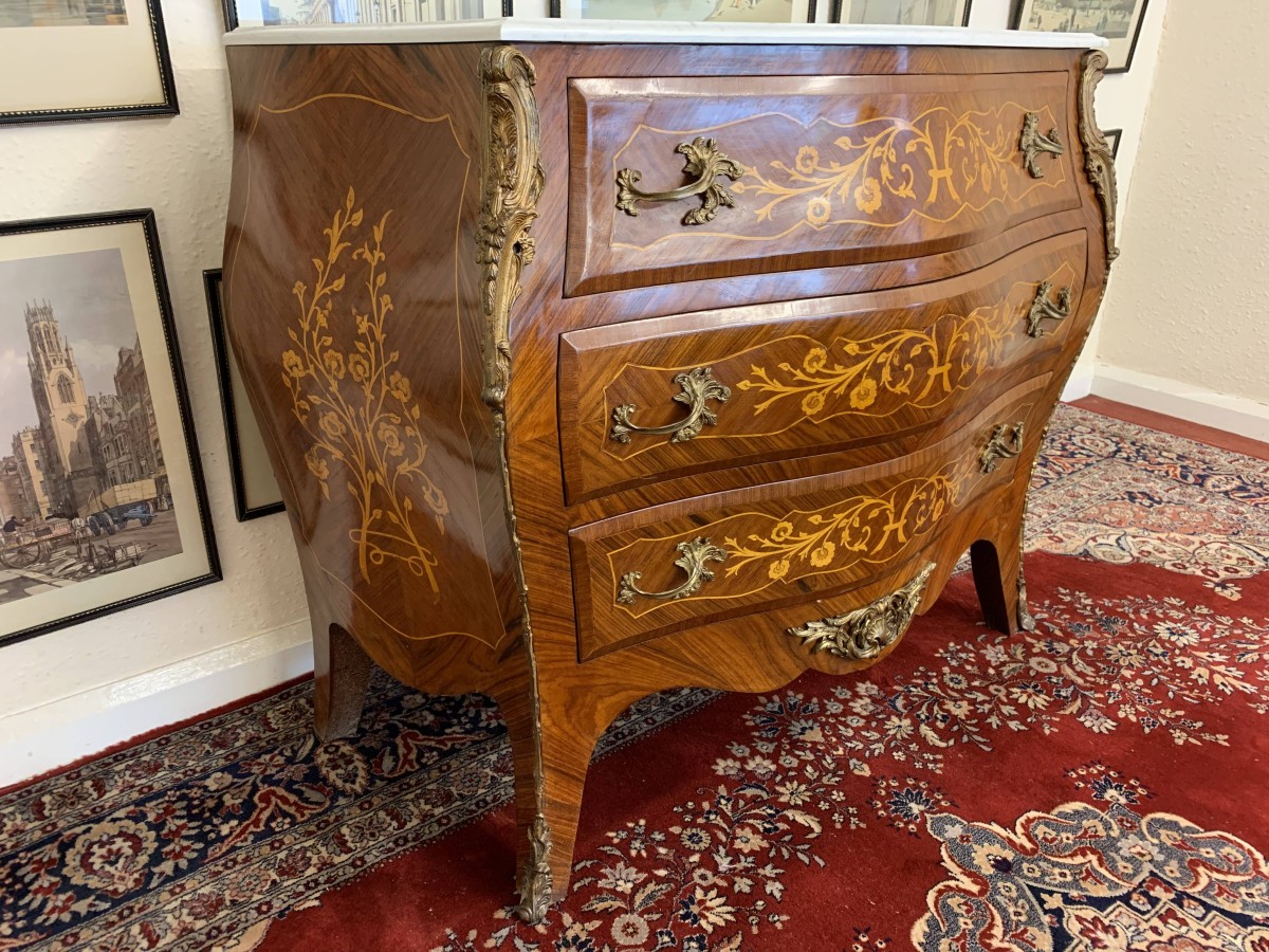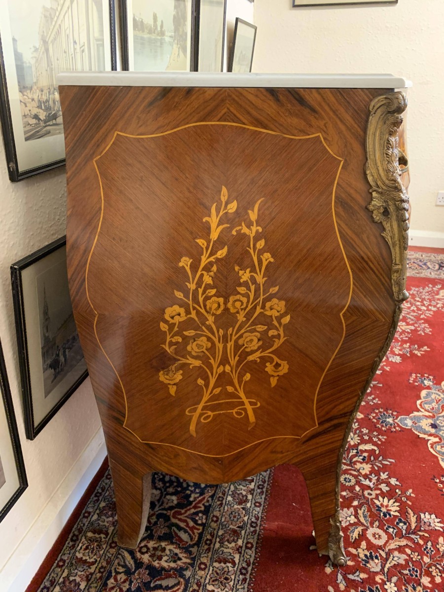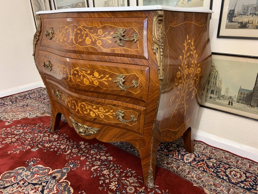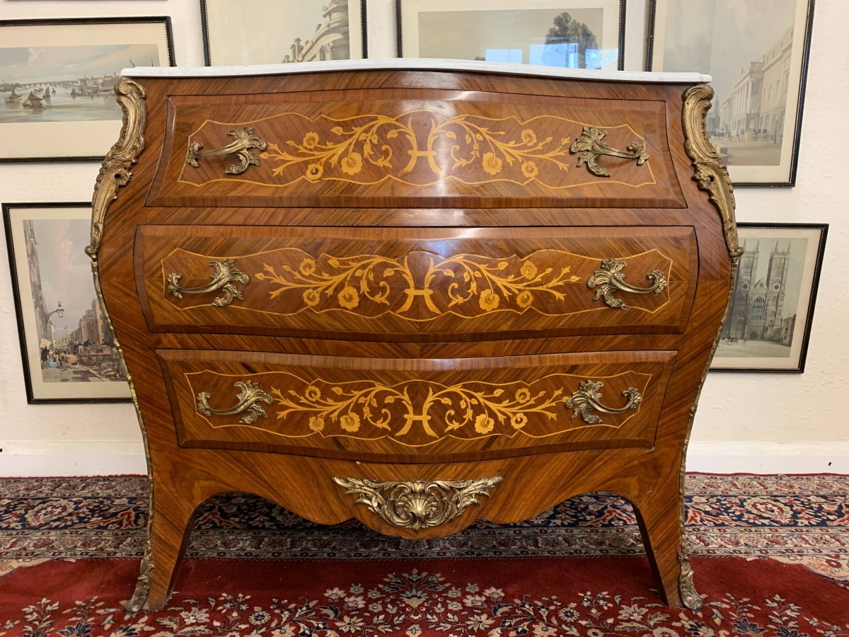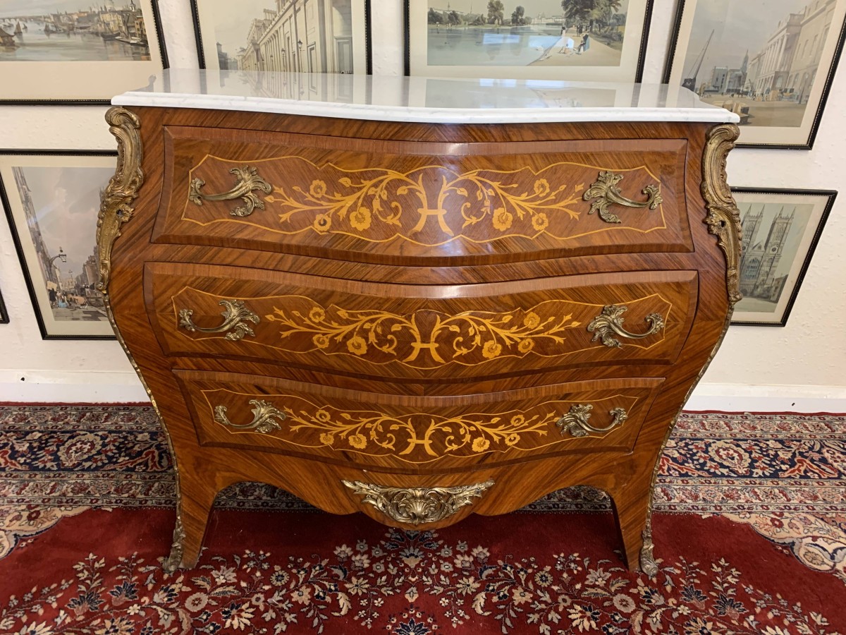 - Stunning French Marquetry Inlaid Bombay Shaped Marble Top Commode – Now Sold