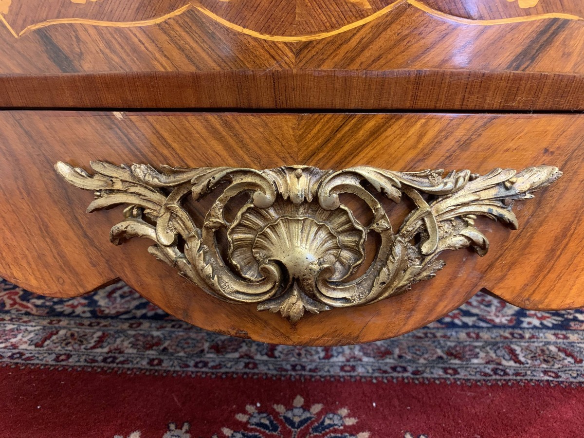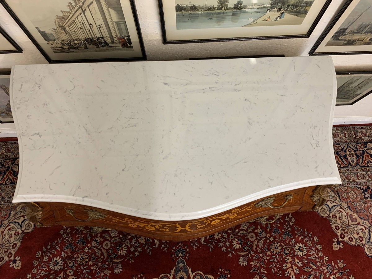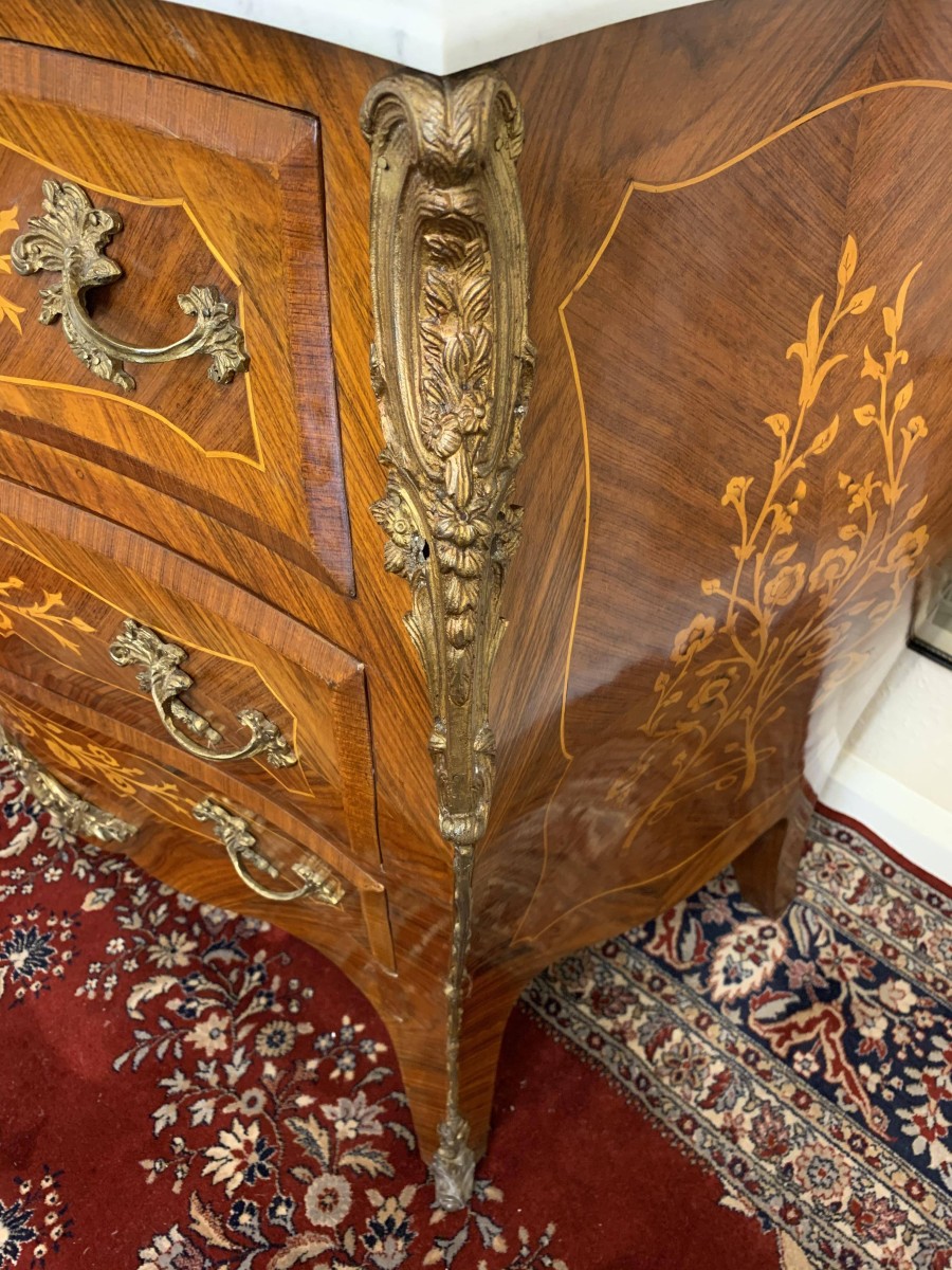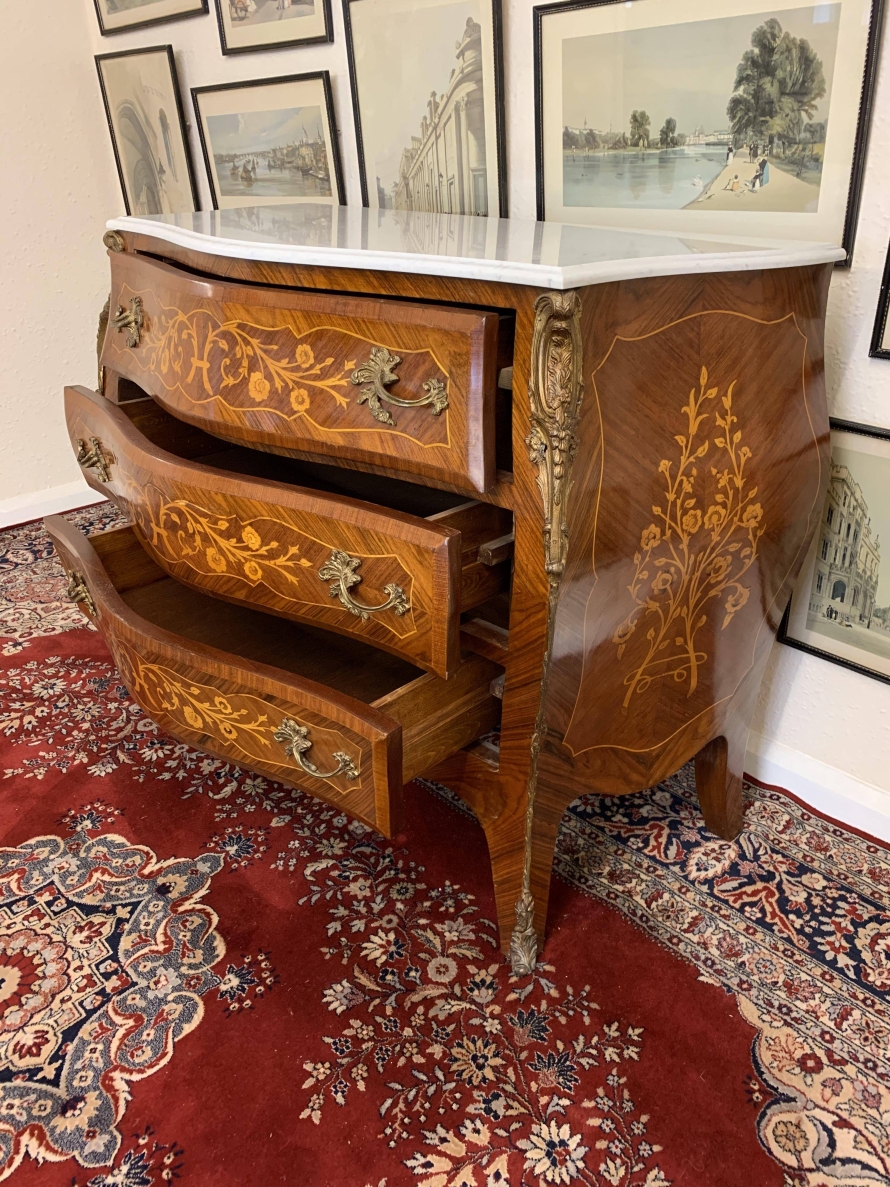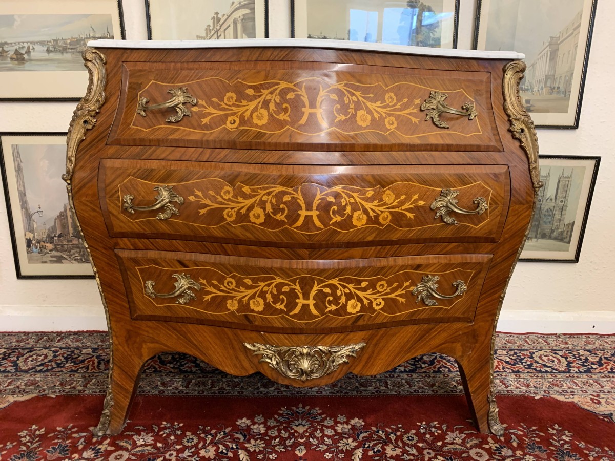 - Stunning French Marquetry Inlaid Bombay Shaped Marble Top Commode – Now Sold