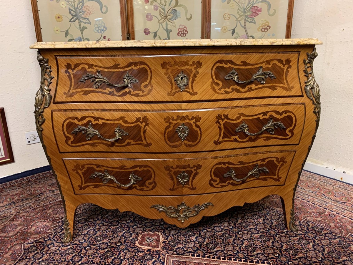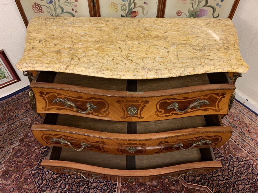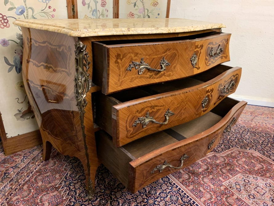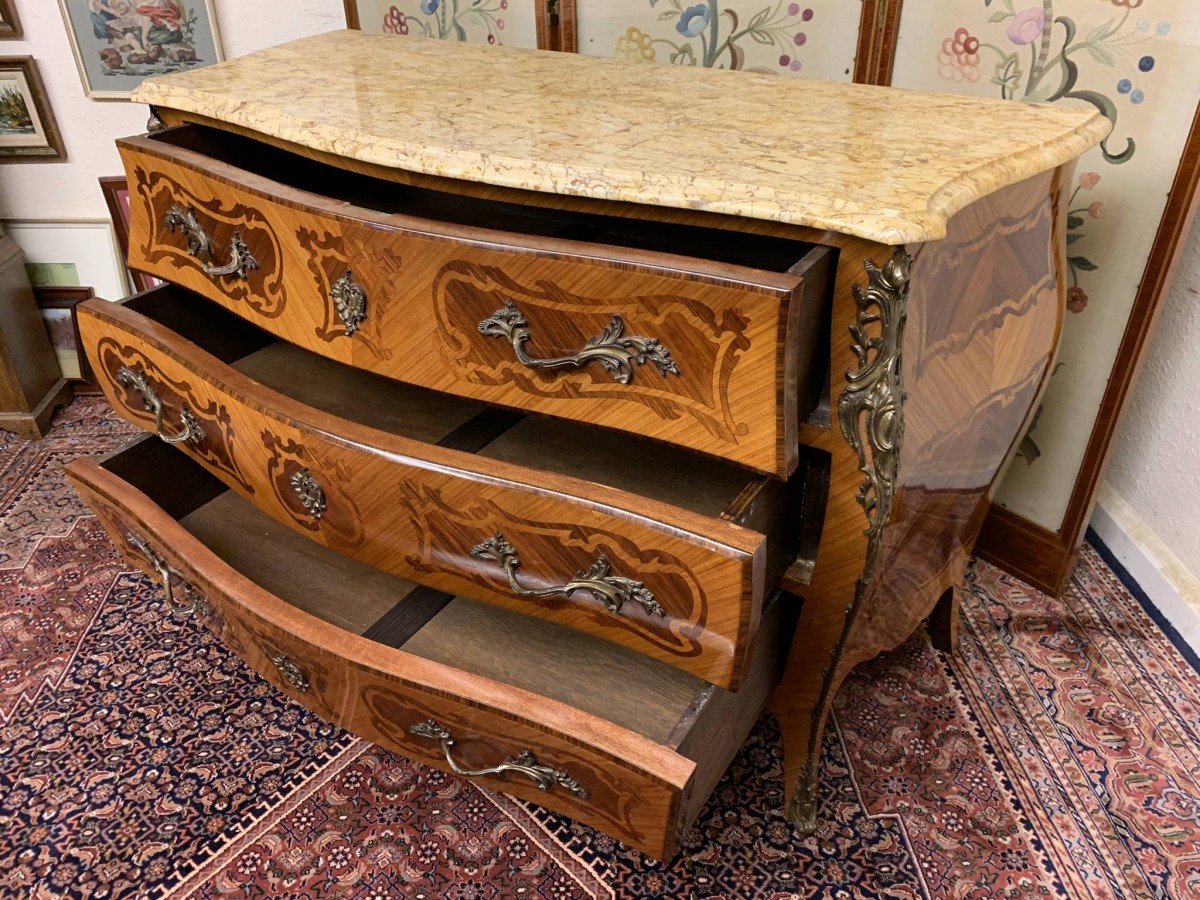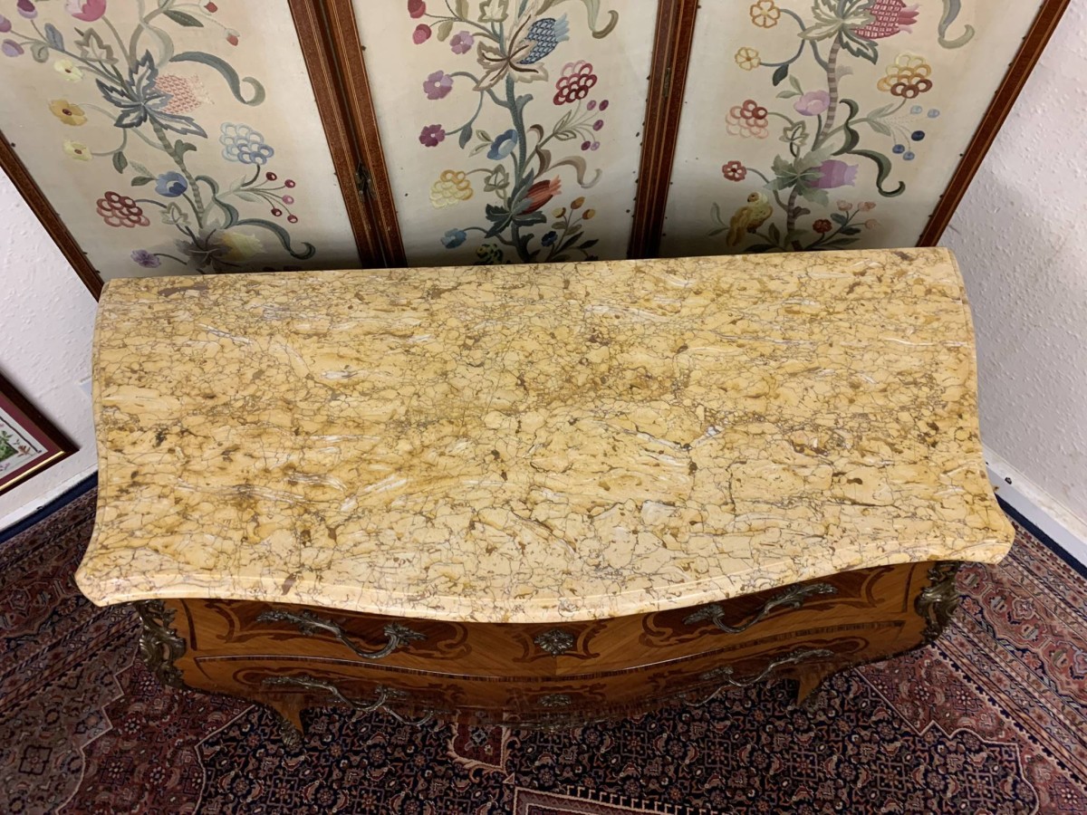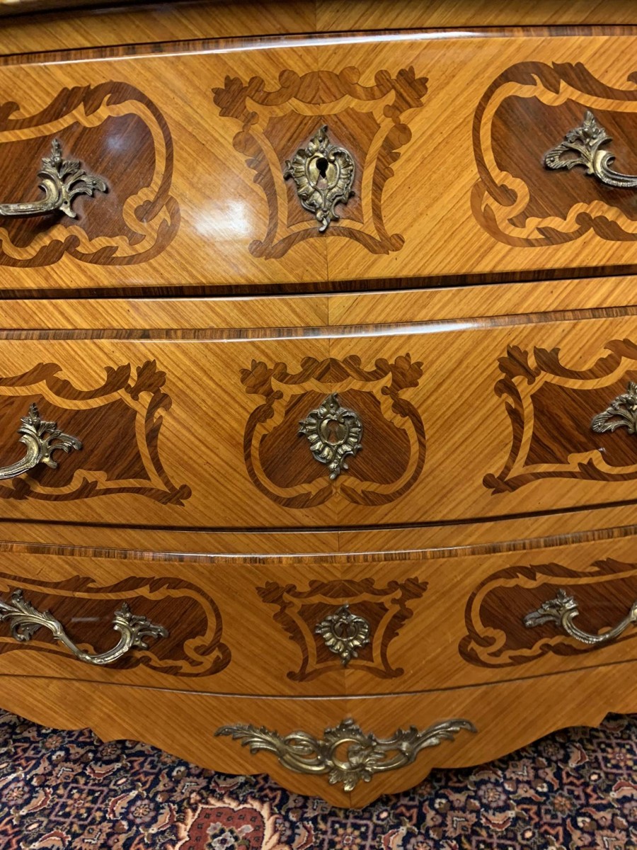 - Stunning French Marquetry Inlaid Marble Topped Bombe Commode/chest
