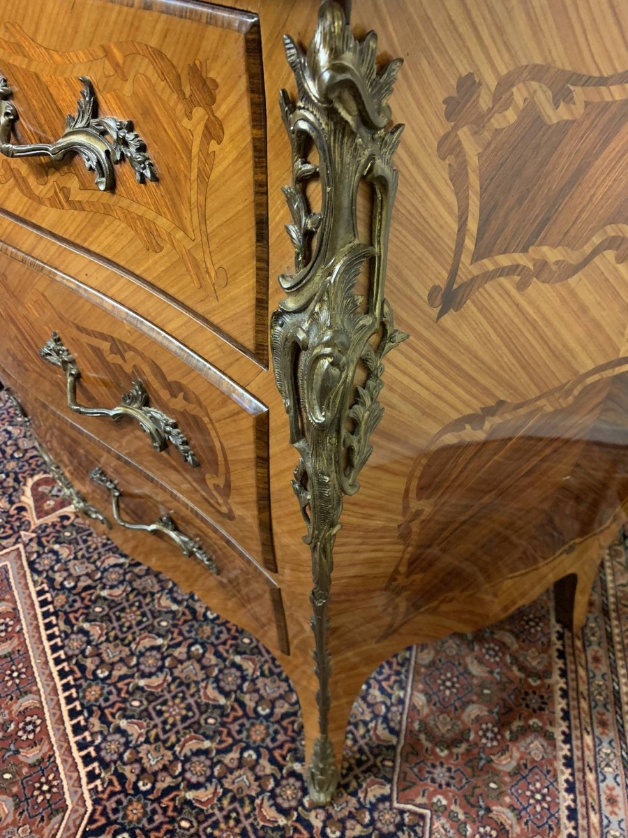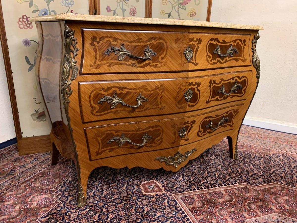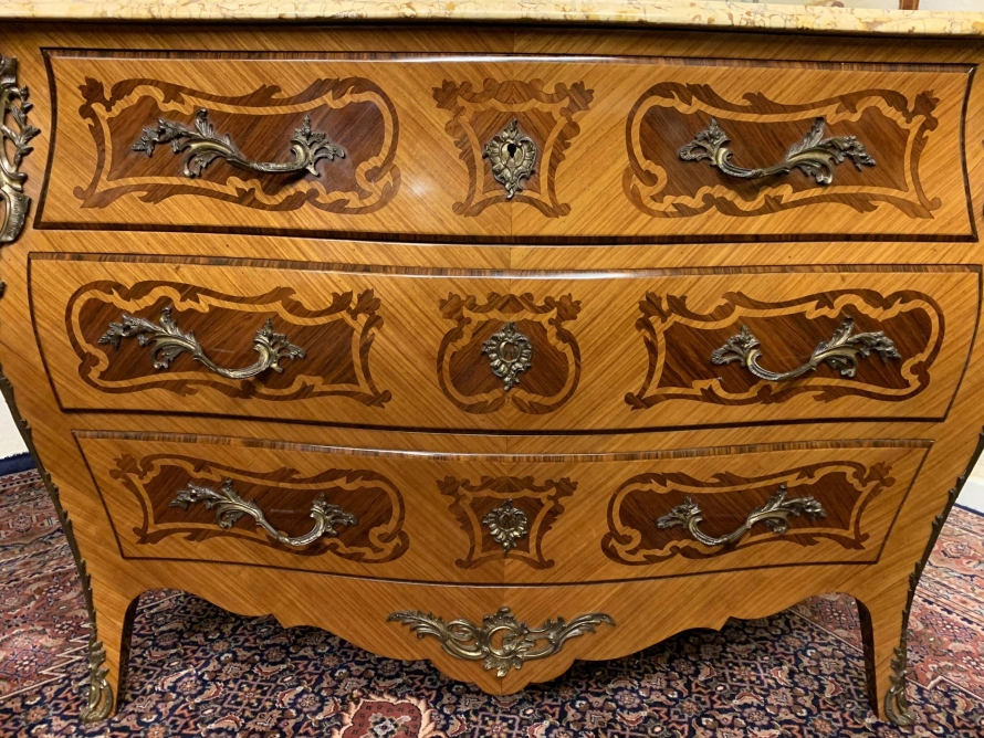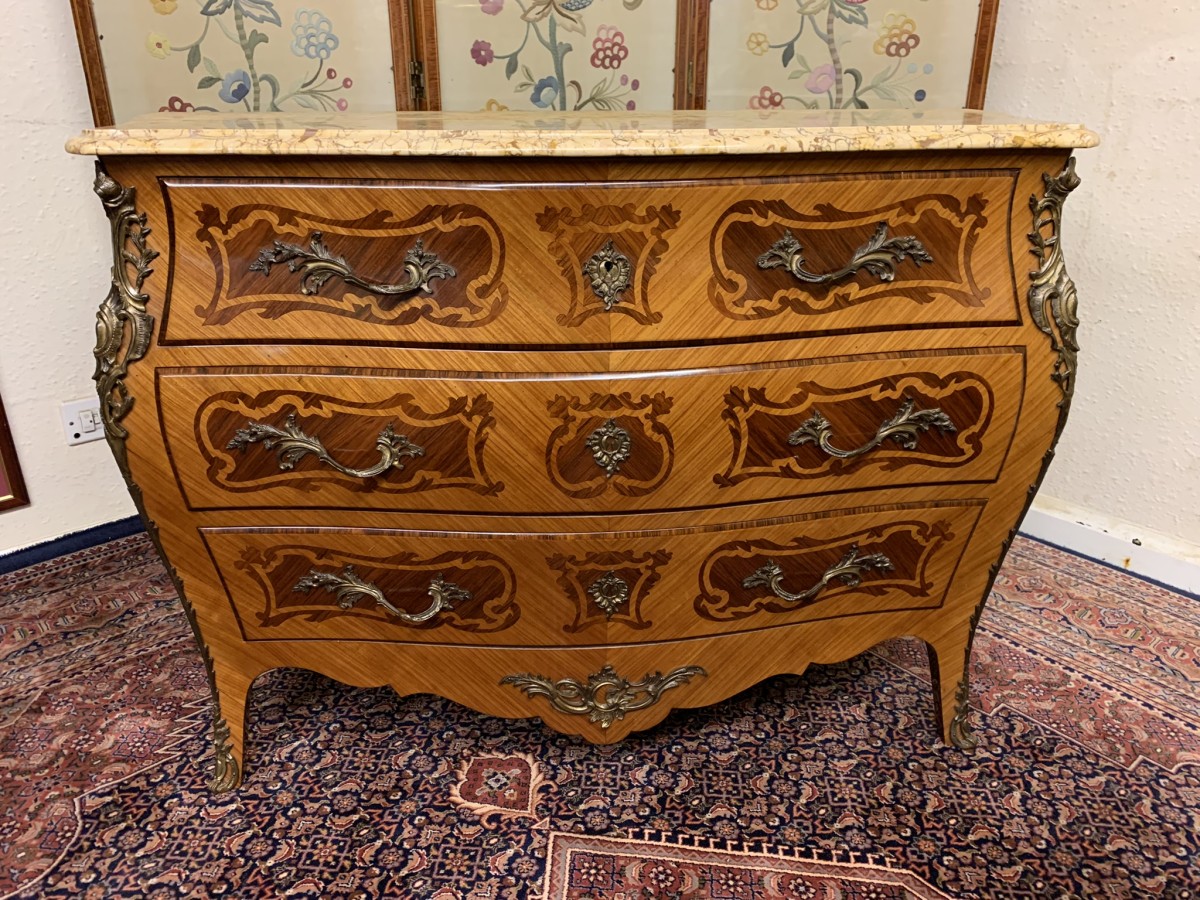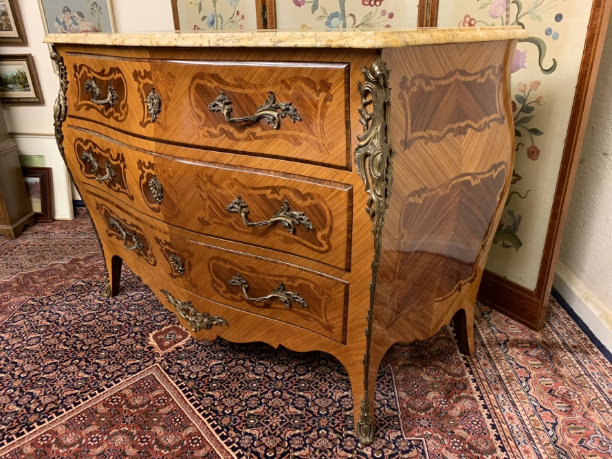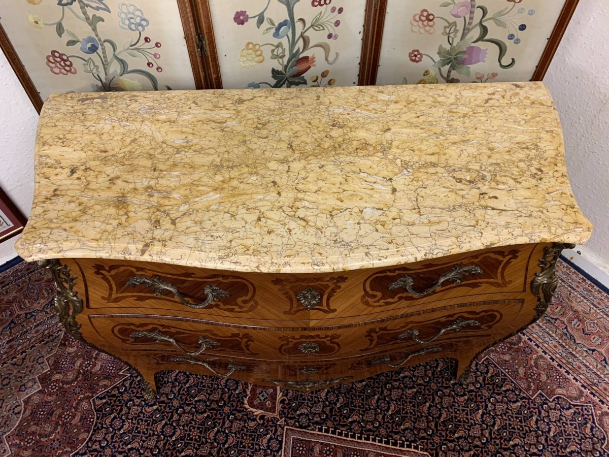 - Stunning French Marquetry Inlaid Marble Topped Bombe Commode/chest