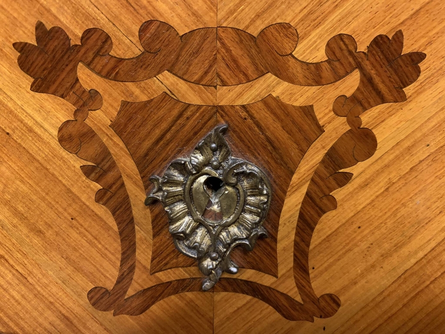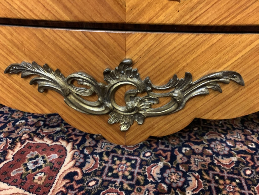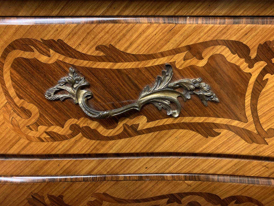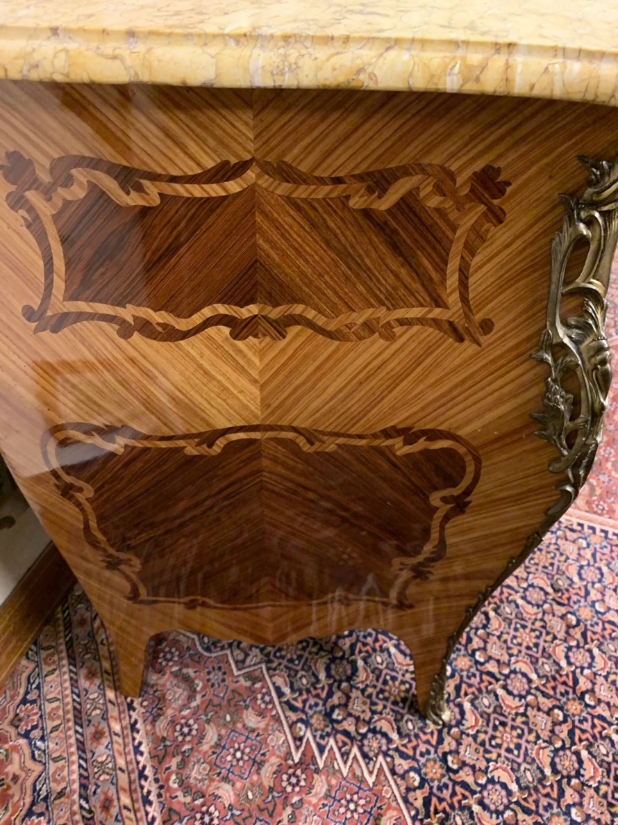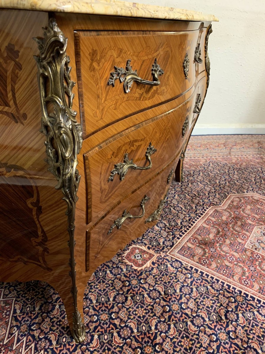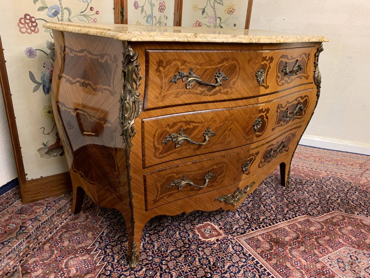 - Stunning French Marquetry Inlaid Marble Topped Bombe Commode/chest