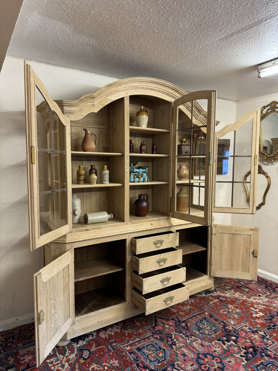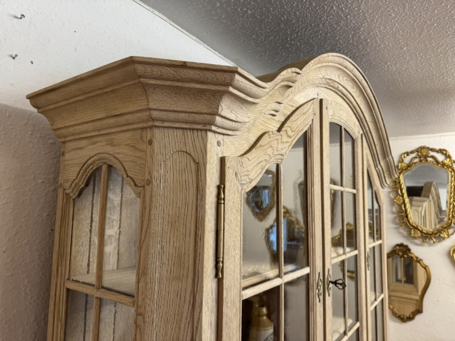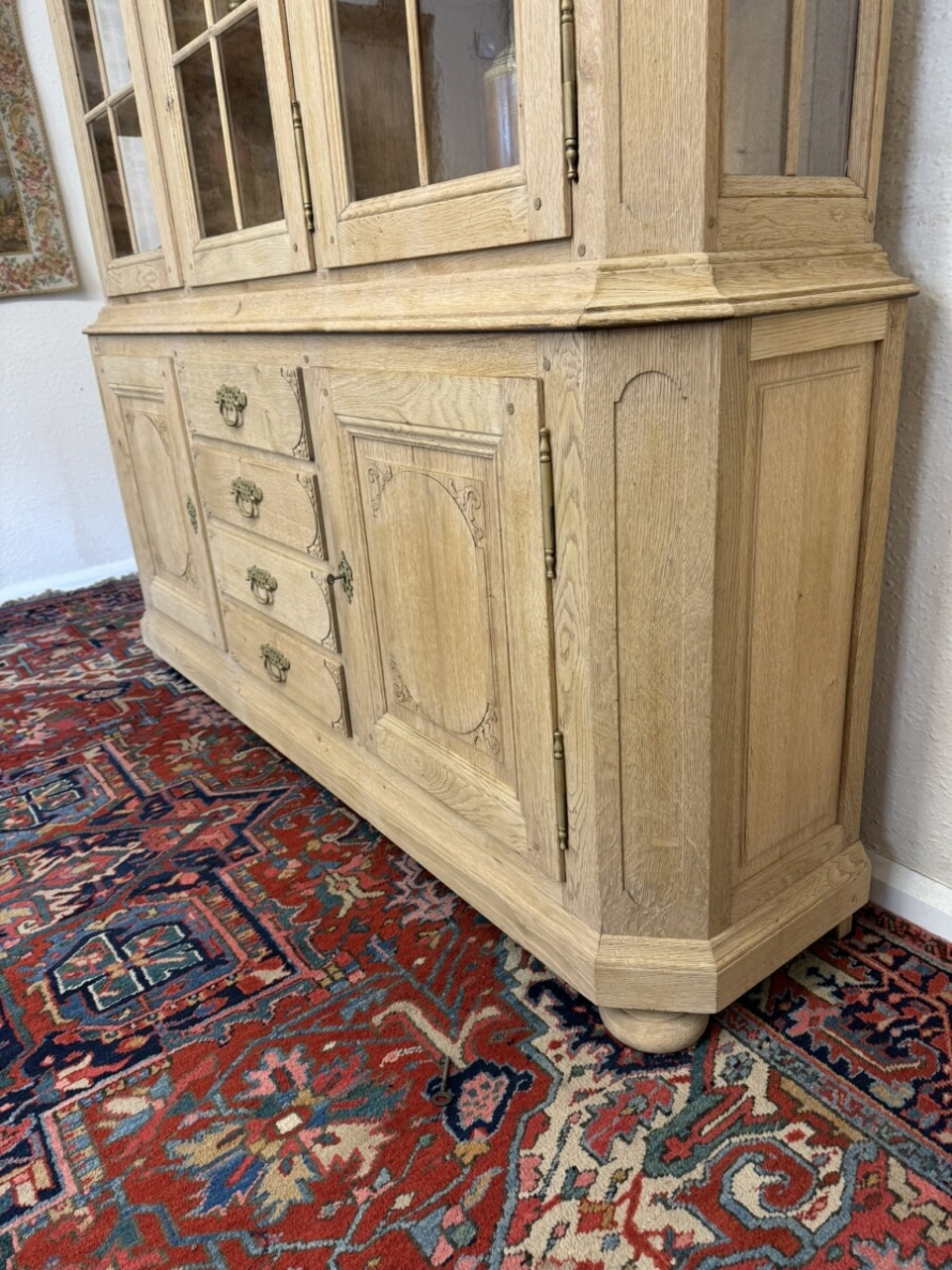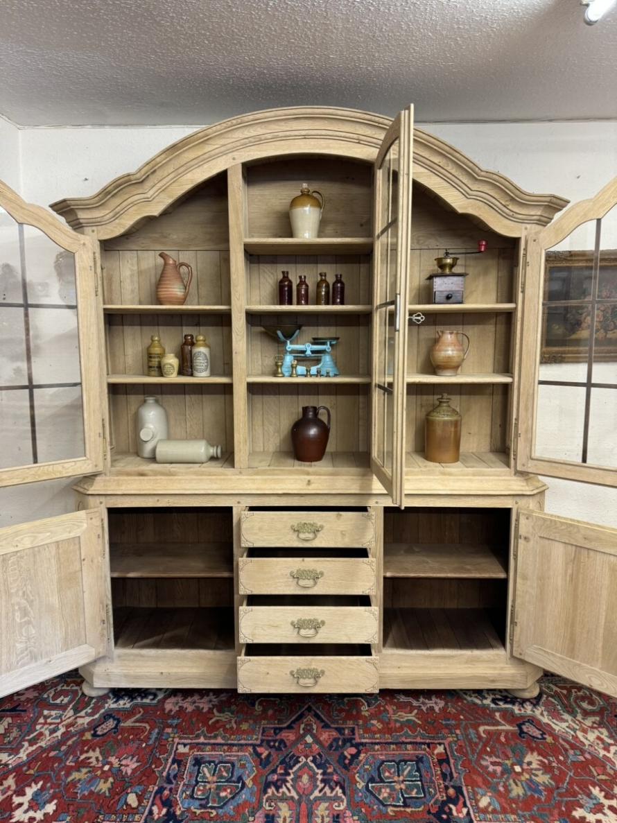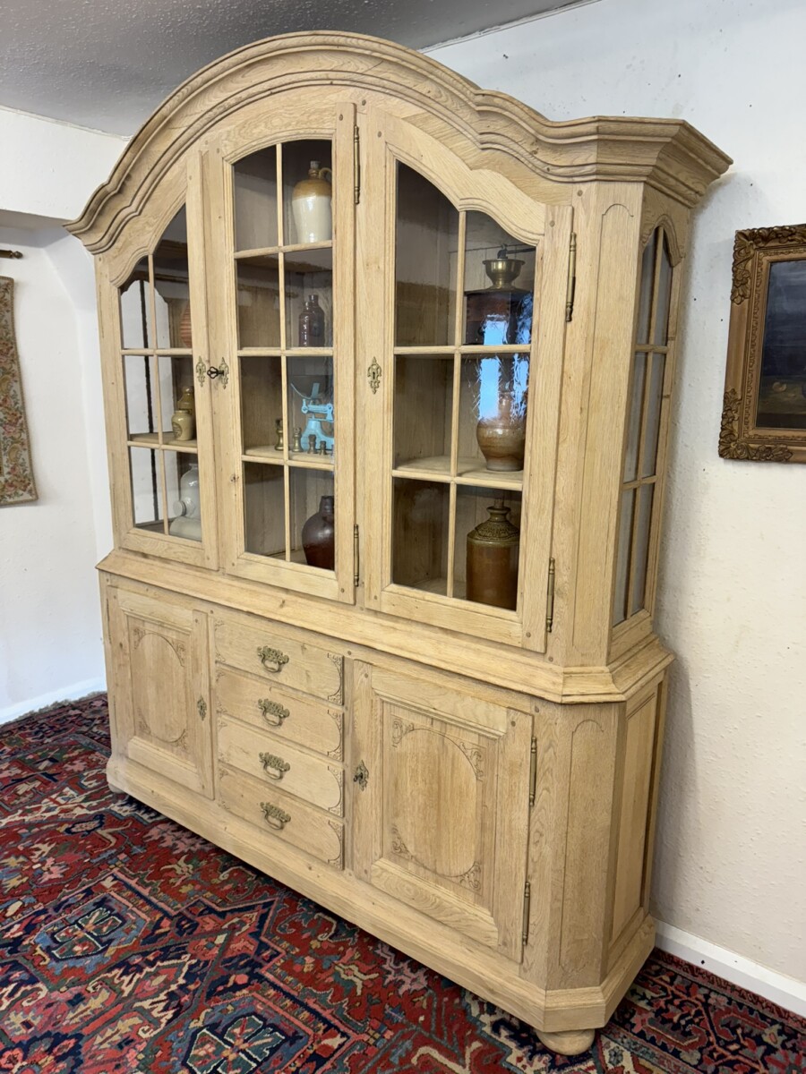 A stunning item of furniture in excellent condition made entirely in solid oak. The arch shaped top sits above three lockable glazed doors, the central door opens to reveal a boarded back and base and has three removable shelves. The outer doors open to reveal a panelled base and back with two removable shelves. Below is a central bank of four drawers, each drawer having a pull handle and carved decoration to the edge. The central bank of drawers is flanked by a pair of lockable fielded panelled carved doors, the doors open to reveal a boarded base and back with a removable shelf. Panelled glazed upper sides this superb French cabinet stands on two large bun feet to the front.