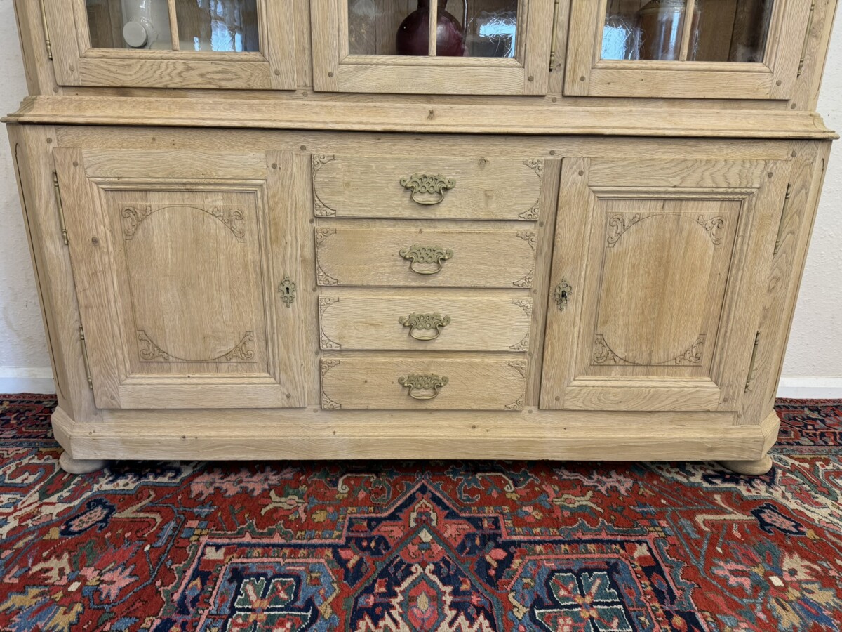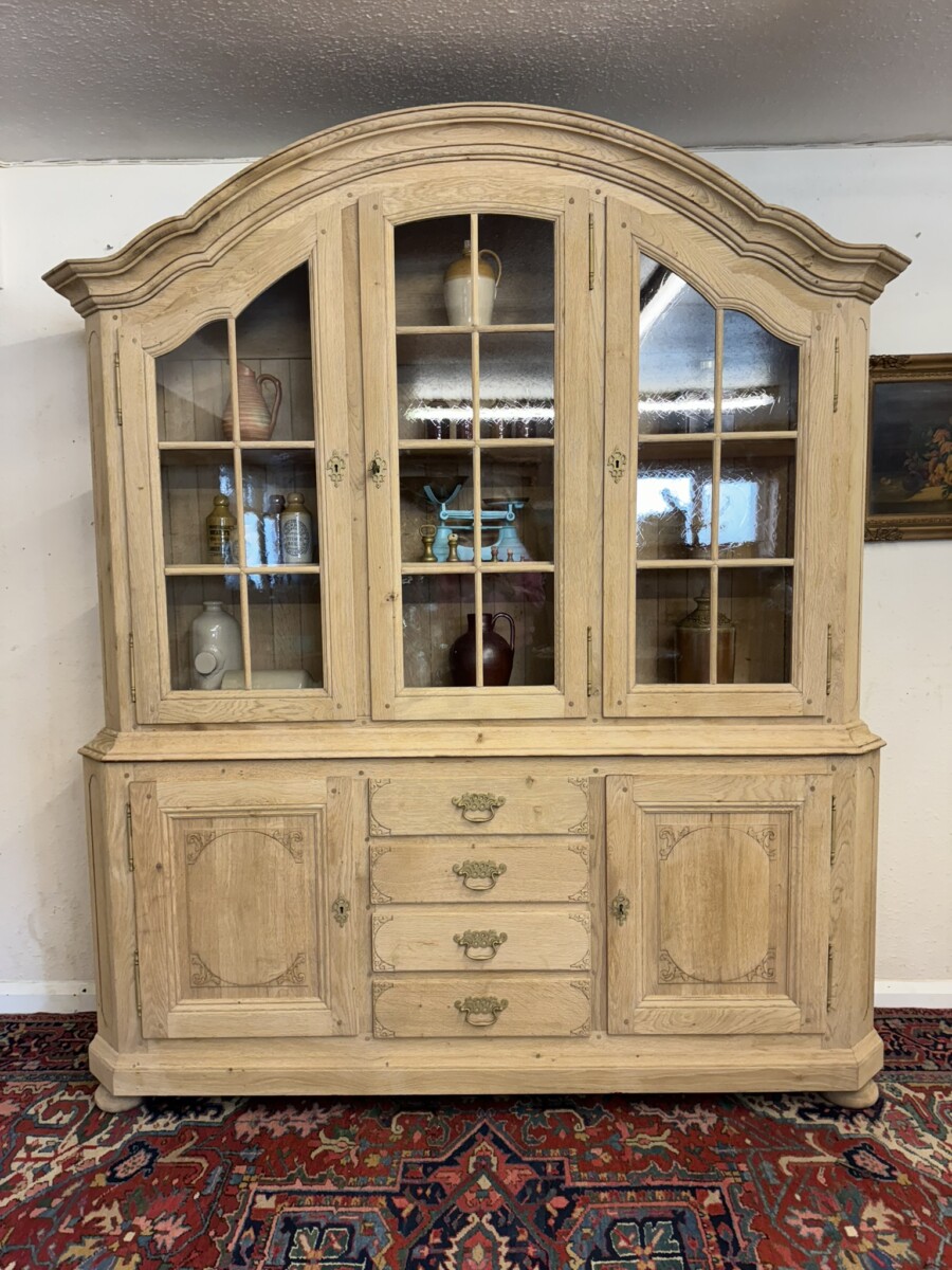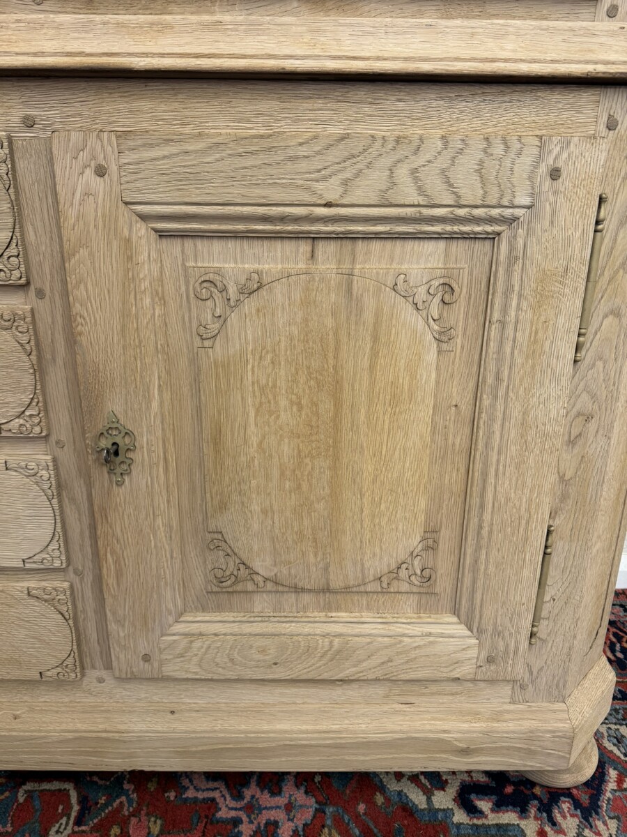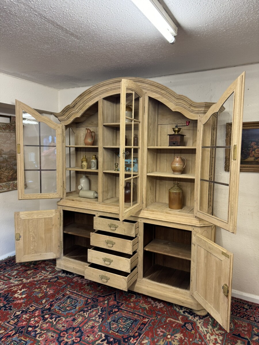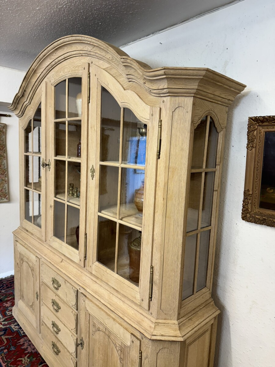 A stunning item of furniture in excellent condition made entirely in solid oak. The arch shaped top sits above three lockable glazed doors, the central door opens to reveal a boarded back and base and has three removable shelves. The outer doors open to reveal a panelled base and back with two removable shelves. Below is a central bank of four drawers, each drawer having a pull handle and carved decoration to the edge. The central bank of drawers is flanked by a pair of lockable fielded panelled carved doors, the doors open to reveal a boarded base and back with a removable shelf. Panelled glazed upper sides this superb French cabinet stands on two large bun feet to the front.