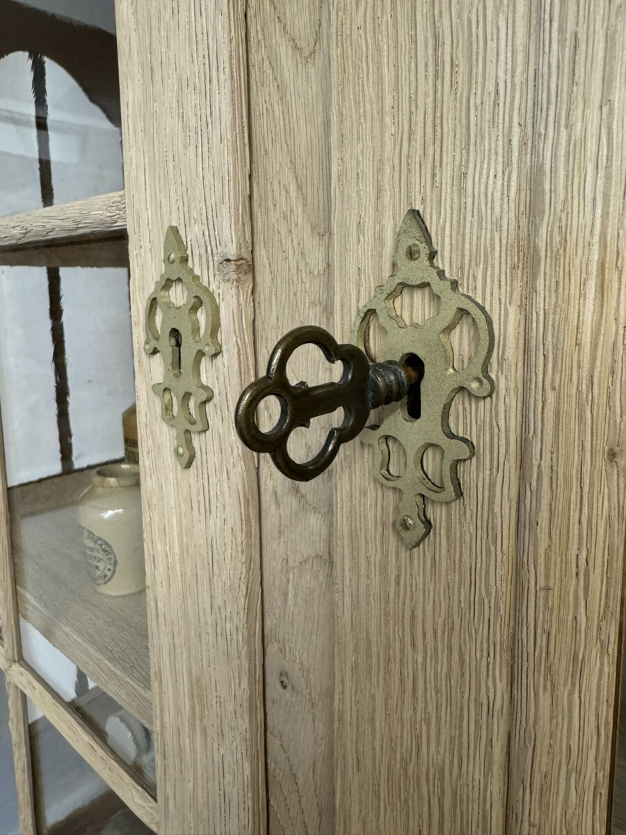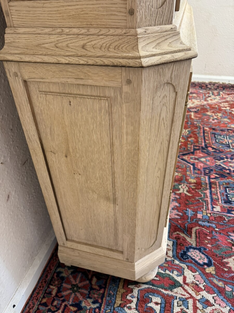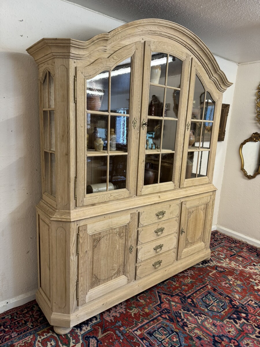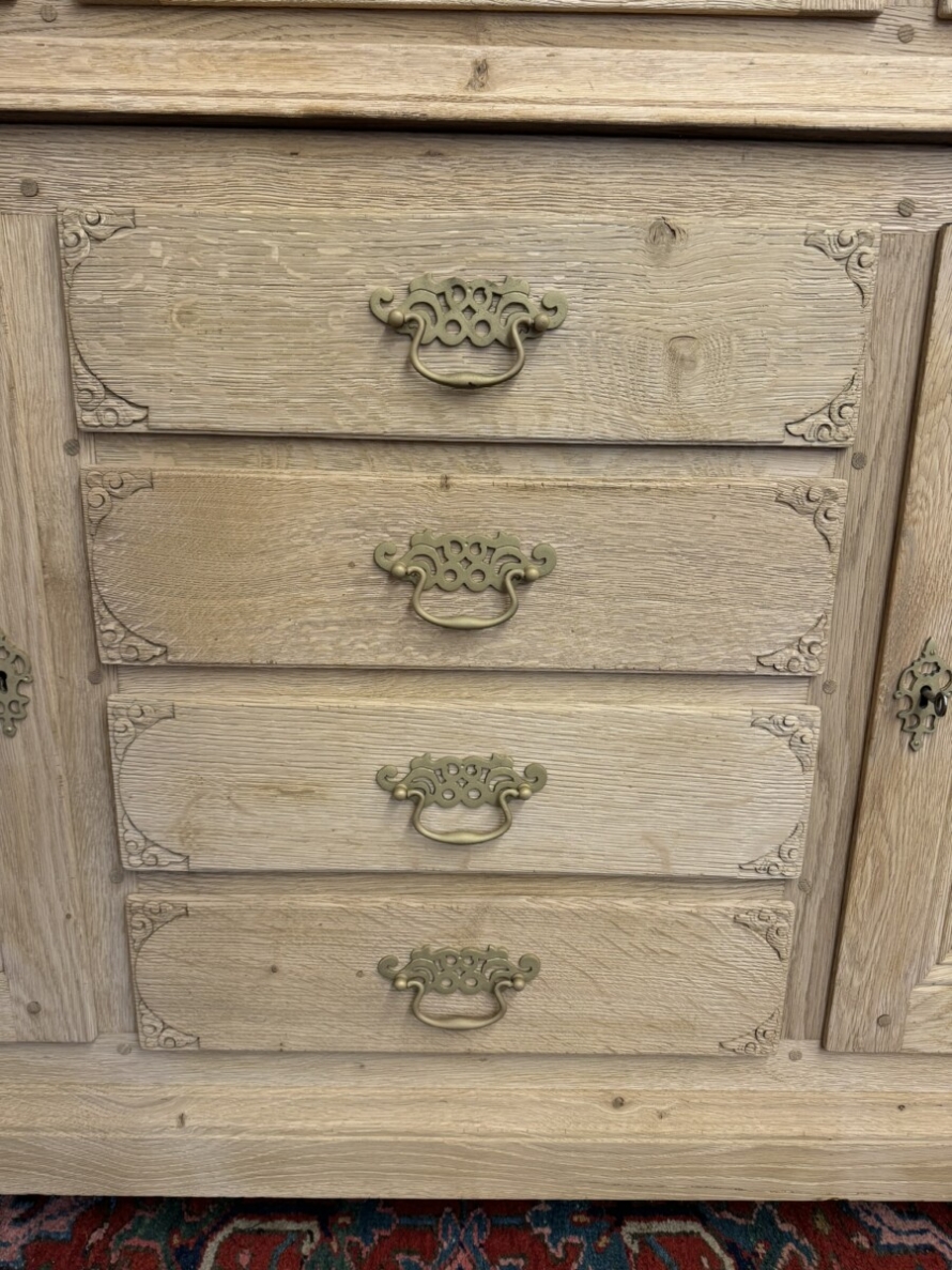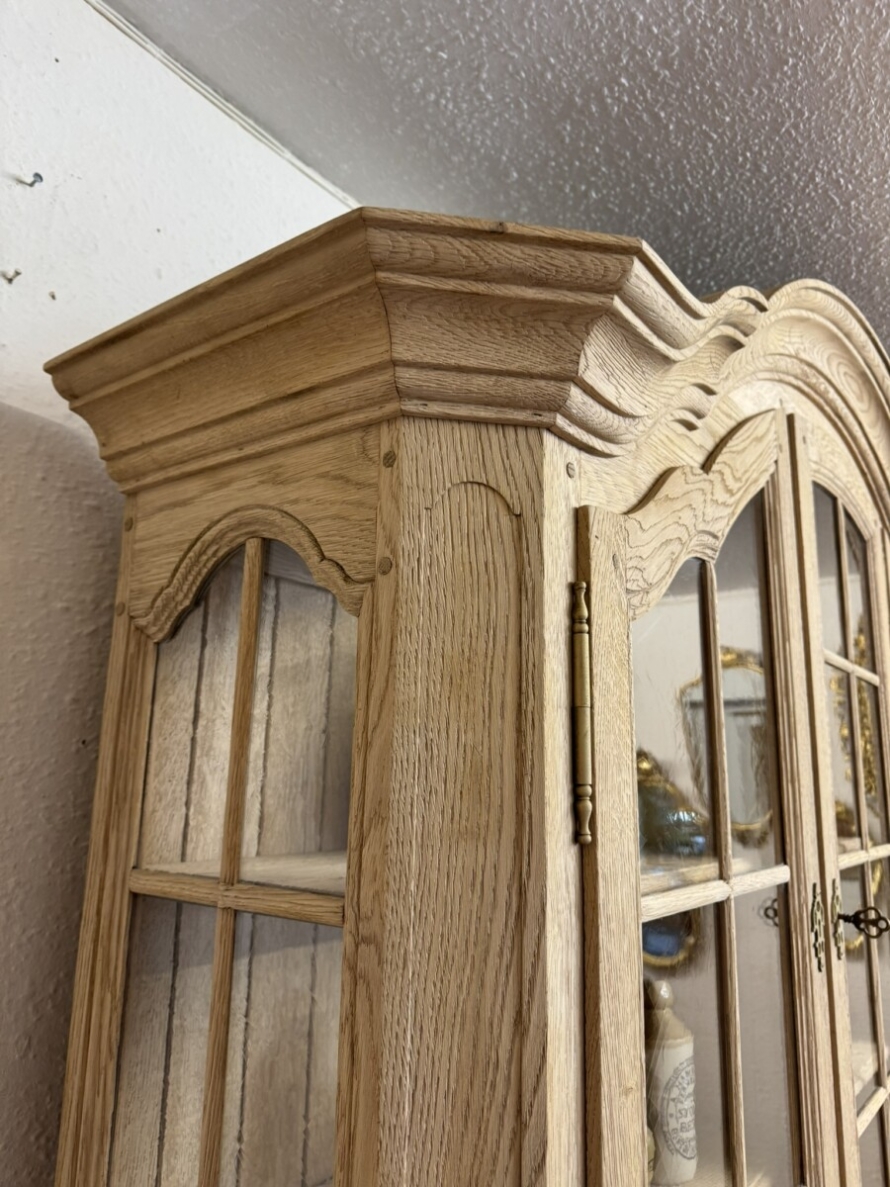 A stunning item of furniture in excellent condition made entirely in solid oak. The arch shaped top sits above three lockable glazed doors, the central door opens to reveal a boarded back and base and has three removable shelves. The outer doors open to reveal a panelled base and back with two removable shelves. Below is a central bank of four drawers, each drawer having a pull handle and carved decoration to the edge. The central bank of drawers is flanked by a pair of lockable fielded panelled carved doors, the doors open to reveal a boarded base and back with a removable shelf. Panelled glazed upper sides this superb French cabinet stands on two large bun feet to the front.