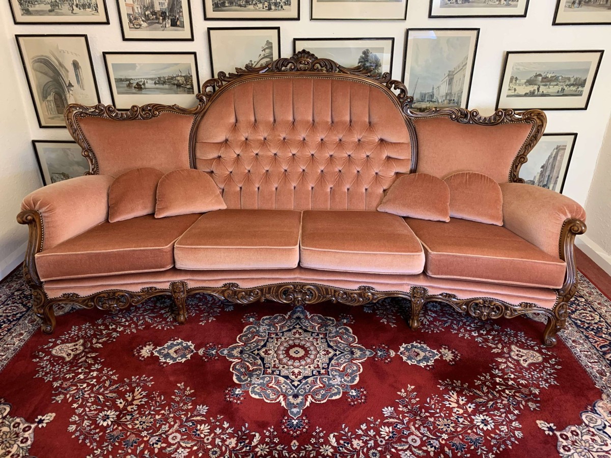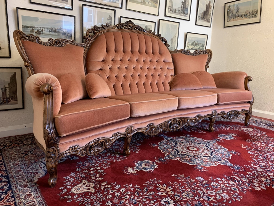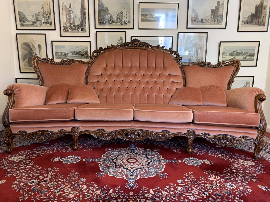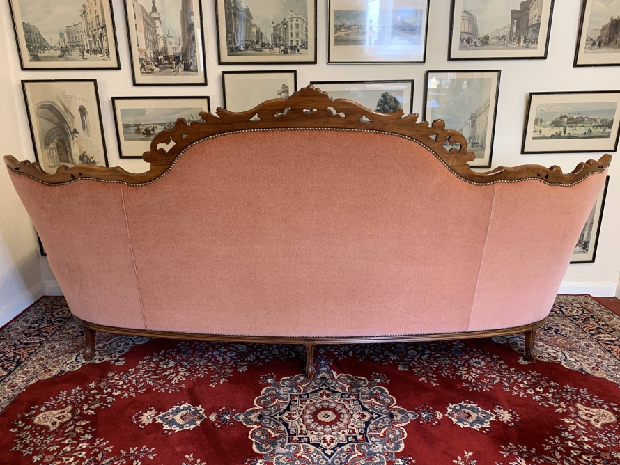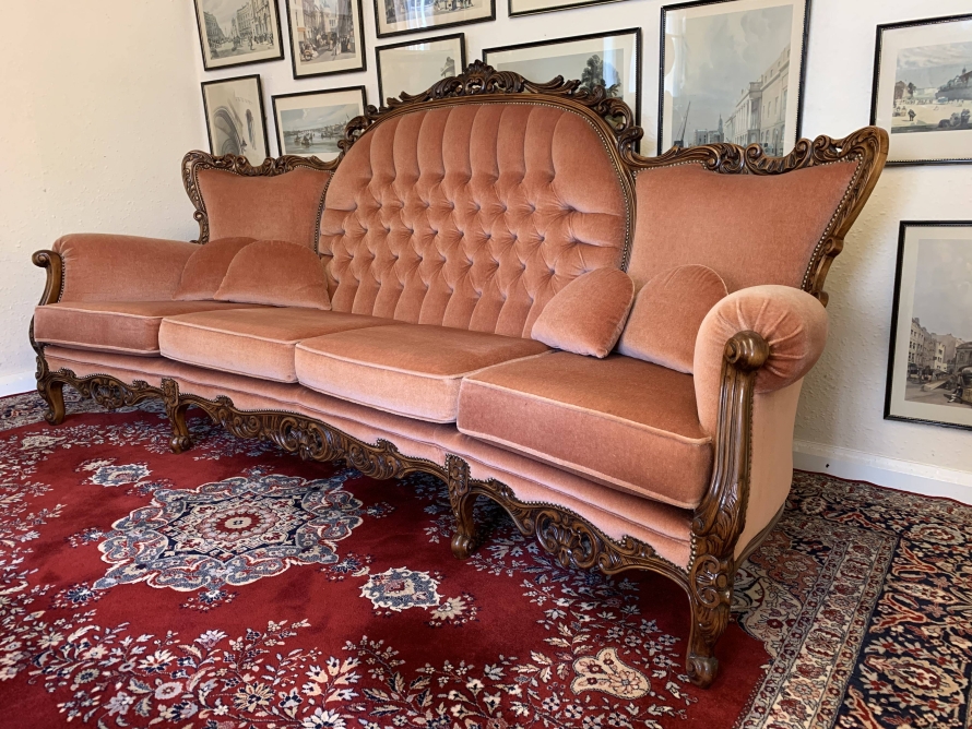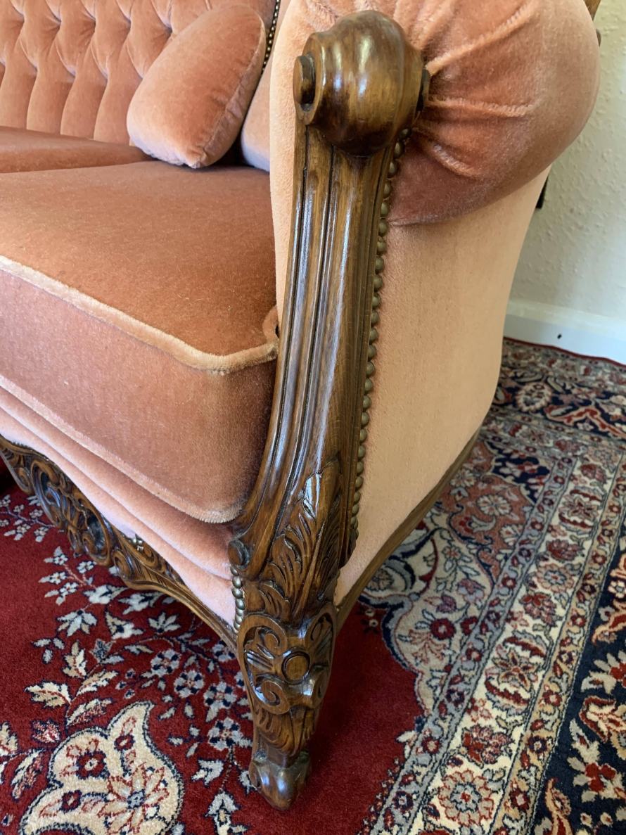 A beautiful carved French couch which is in fabulous condition. The shaped arms and back are wonderfully carved as are the front of the arms skirt and four shaped cabriole legs. The settee is upholstered in a blush pink fabric. The deep buttoned and cushioned cameo back is flanked by two back rests. Cushioned arms, four removable seat cushions and four additional loose cushions. A fantastic quality couch. Please note we are also listing a matching pair of carved upholstered armchairs.
