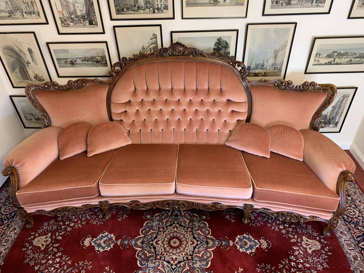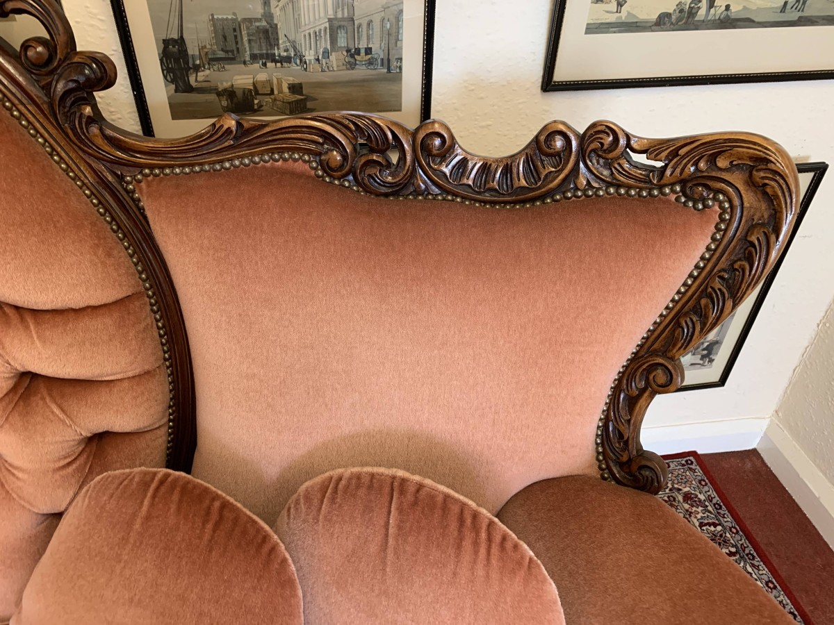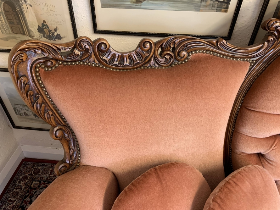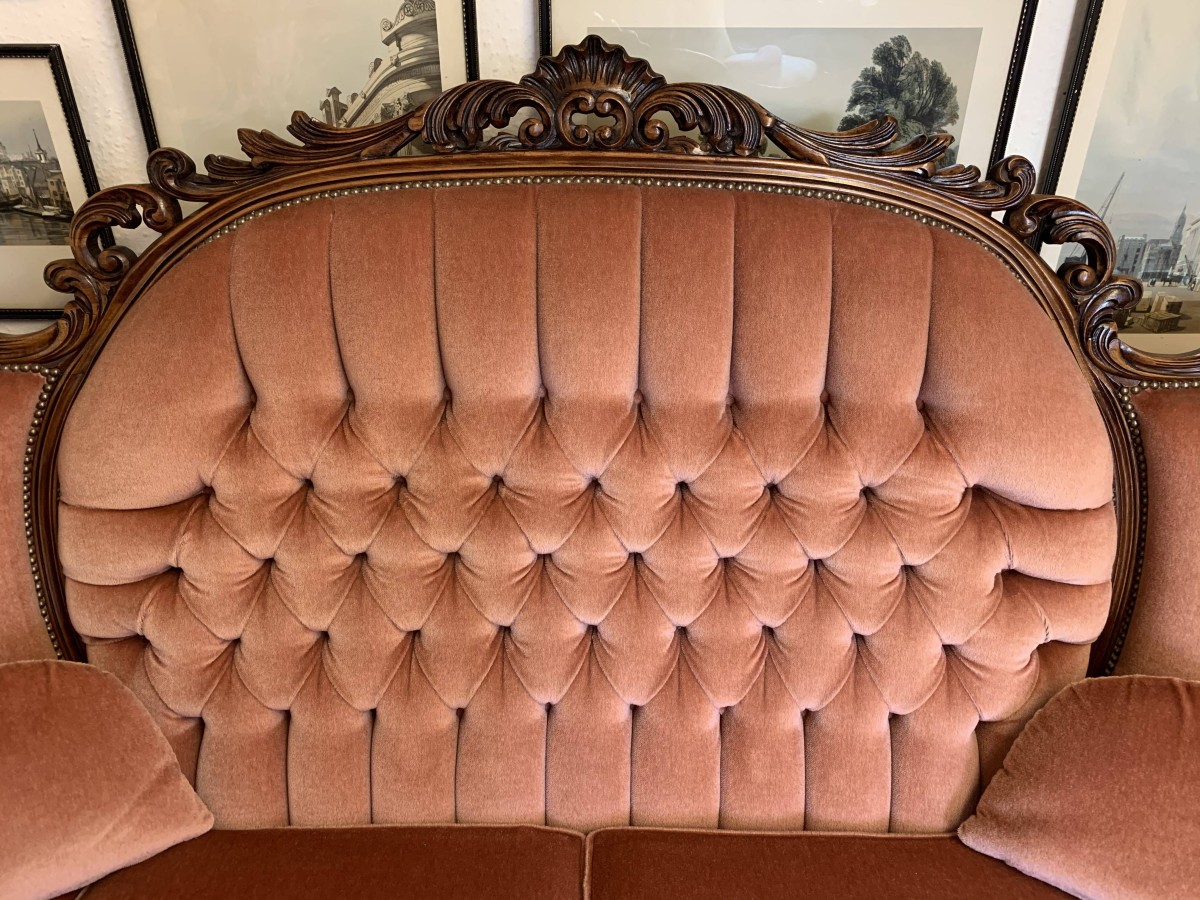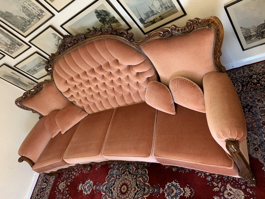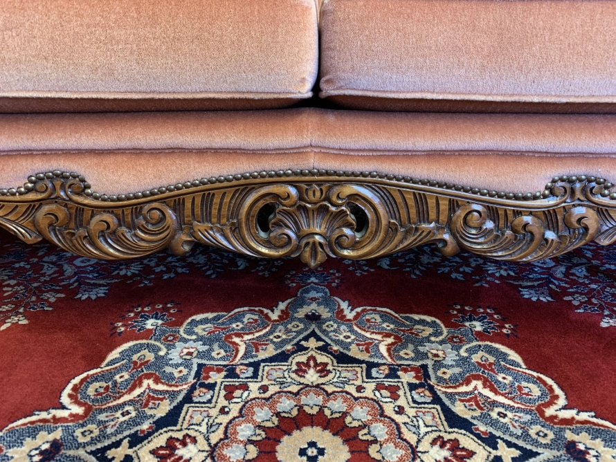 A beautiful carved French couch which is in fabulous condition. The shaped arms and back are wonderfully carved as are the front of the arms skirt and four shaped cabriole legs. The settee is upholstered in a blush pink fabric. The deep buttoned and cushioned cameo back is flanked by two back rests. Cushioned arms, four removable seat cushions and four additional loose cushions. A fantastic quality couch. Please note we are also listing a matching pair of carved upholstered armchairs.