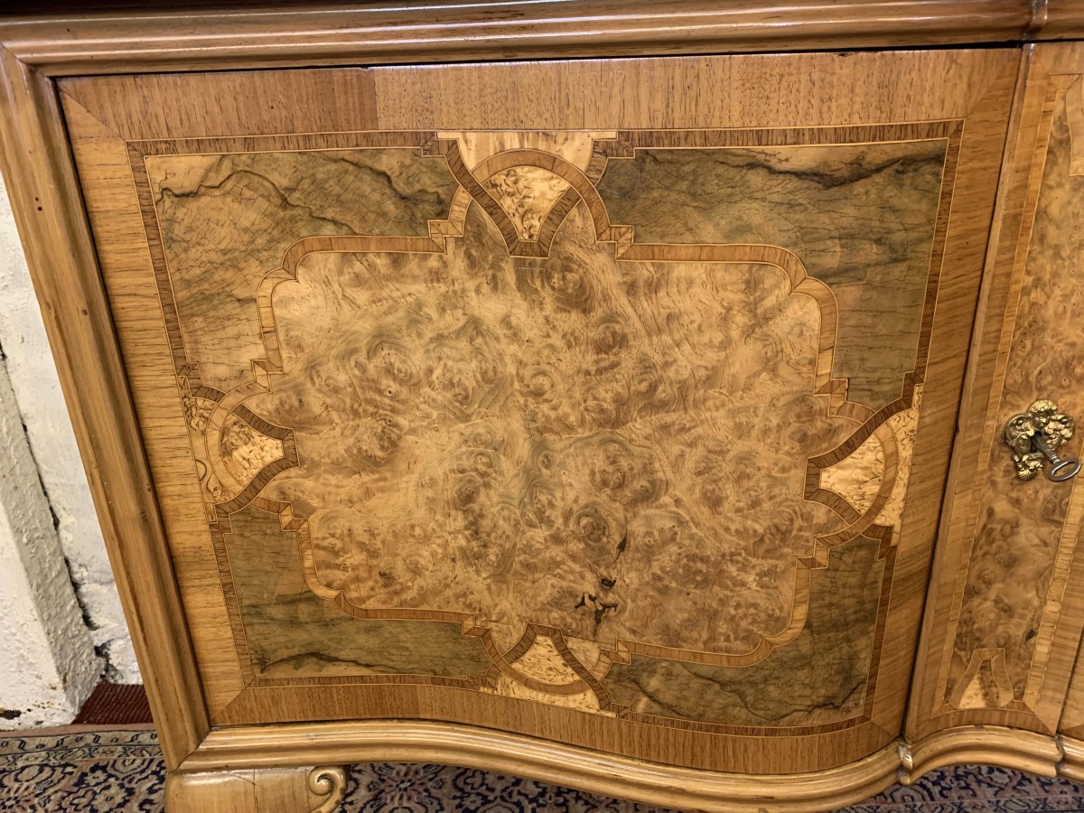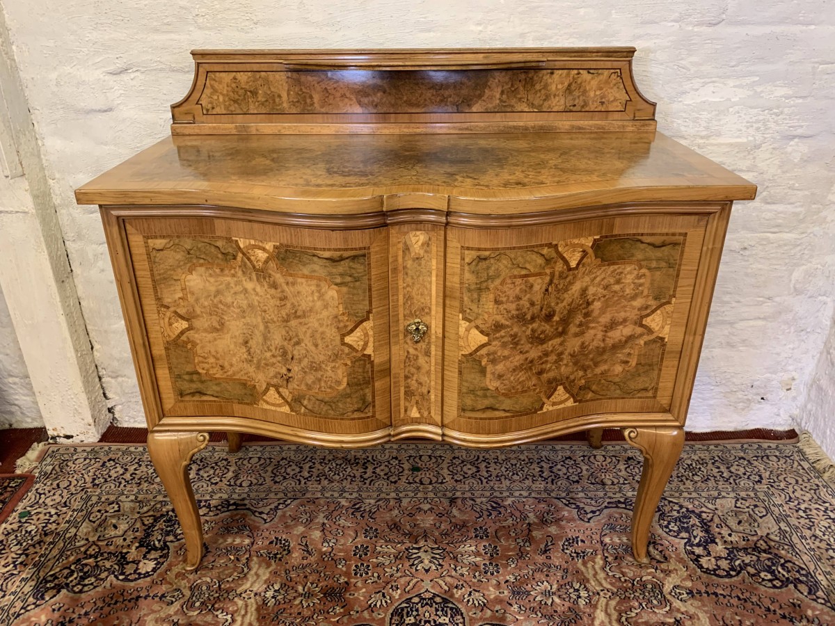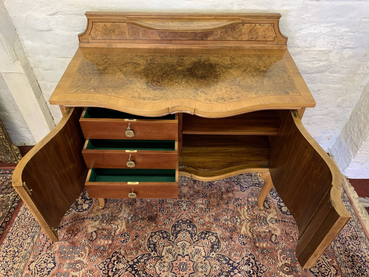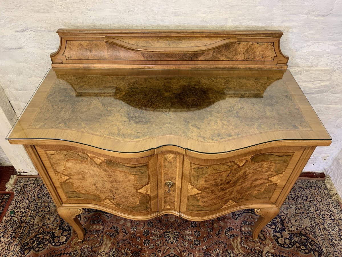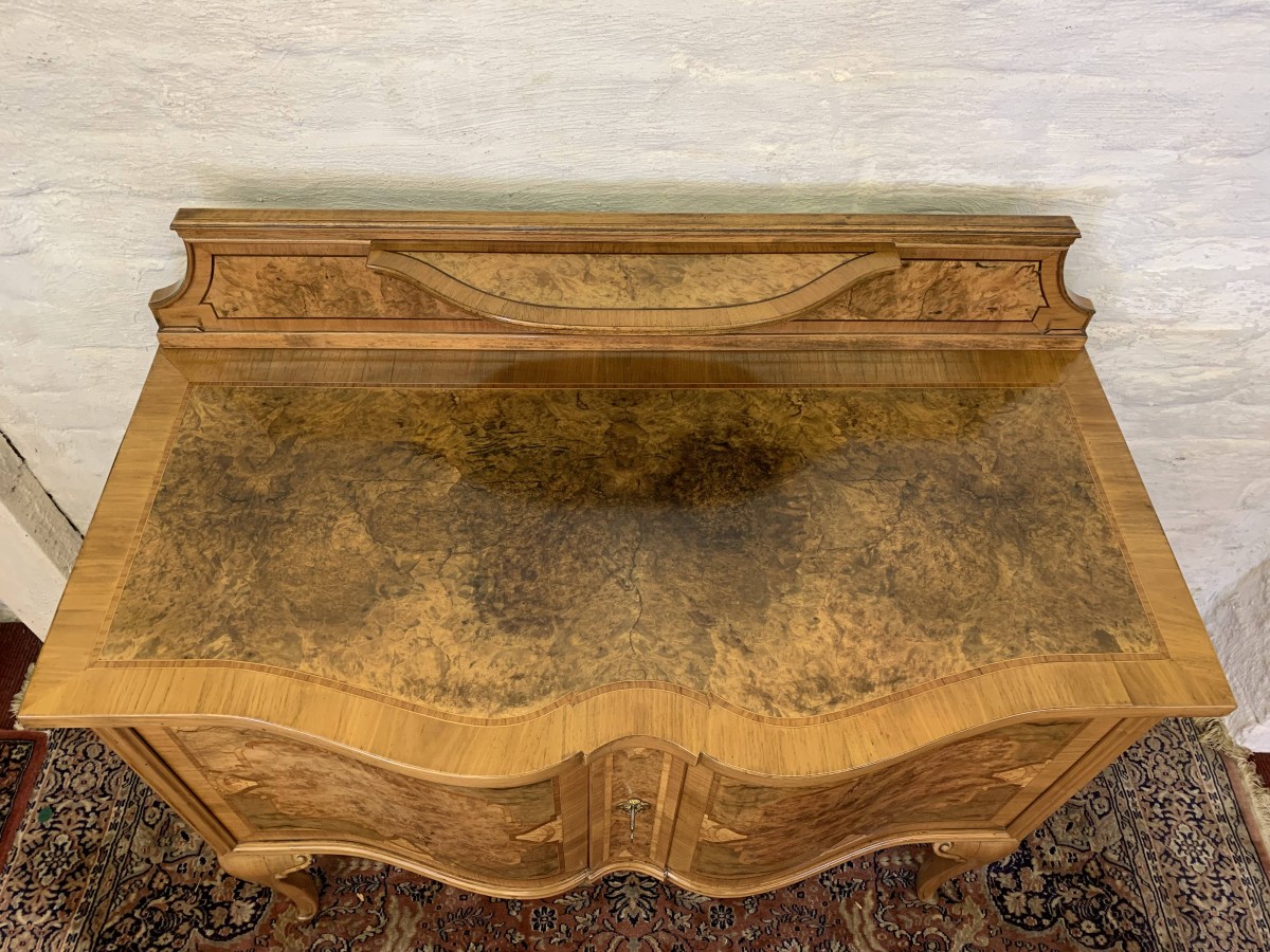 Made in striking burr walnut and in excellent condition. The raised back rail has a central shaped shelf. The crossbanded shaped top has herring bone inlaid decoration. Below are a pair of shaped lockable doors the doors having fabulous inlaid decoration. The doors open to reveal three drawers and an adjustable and removable shelf. Decorated sides, this stunning French cabinet stands on four cabriole shaped legs. There is a shaped glass removable protector for the top.