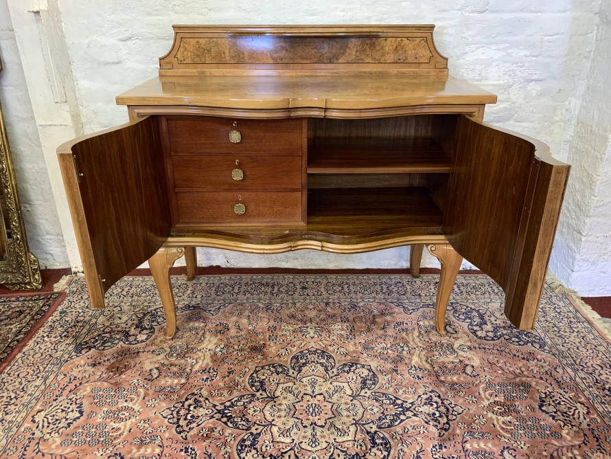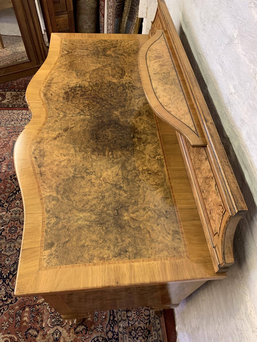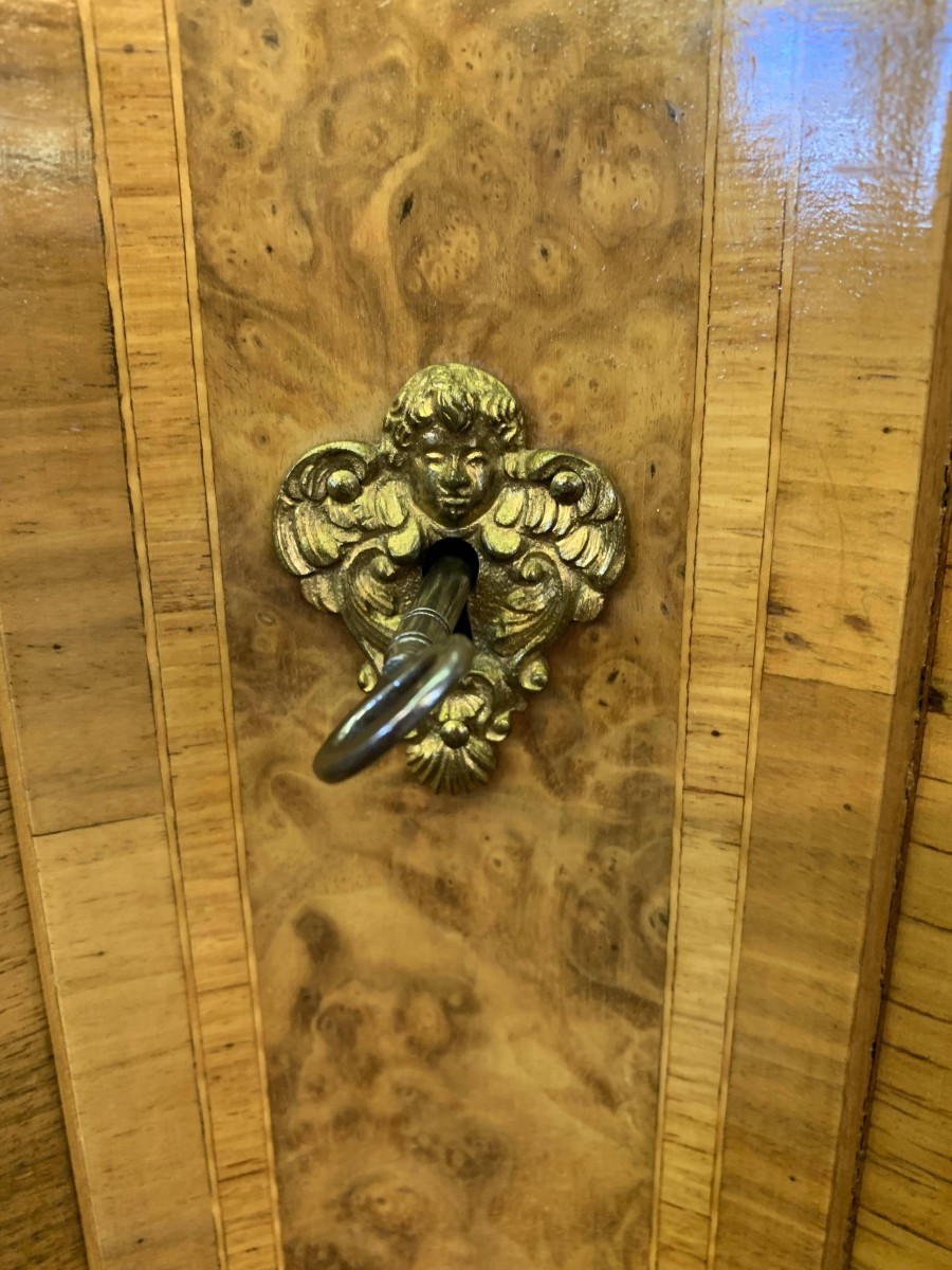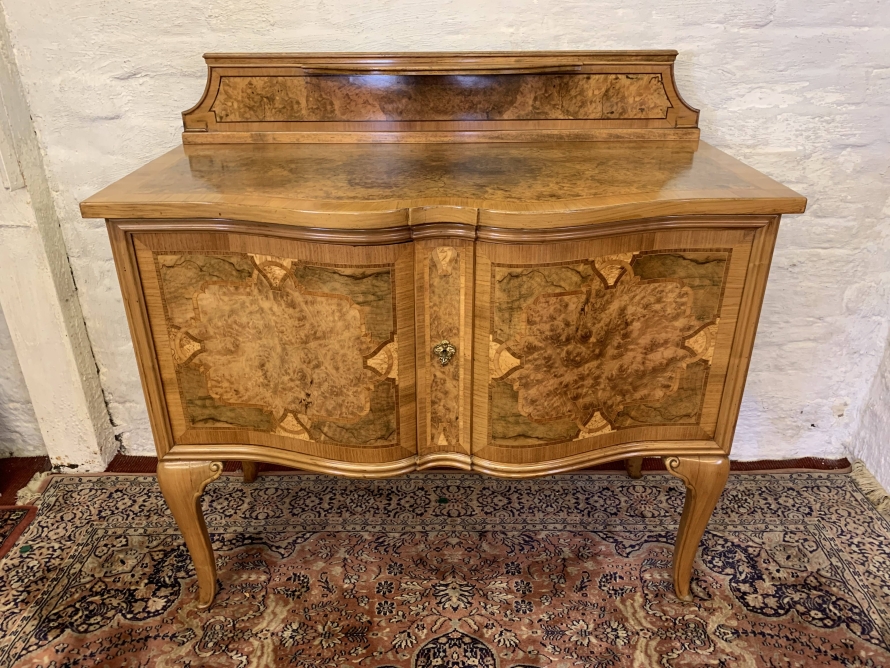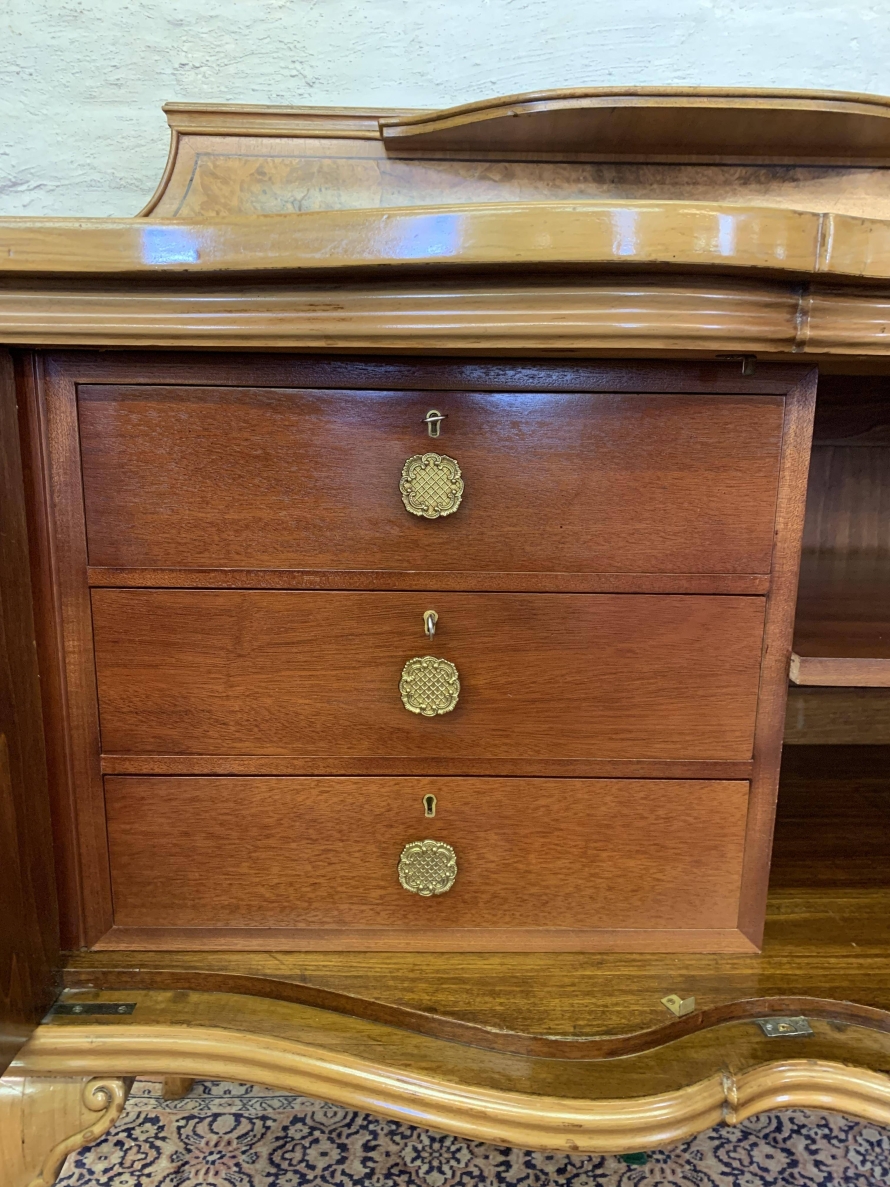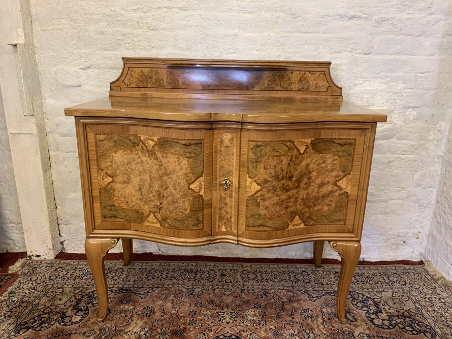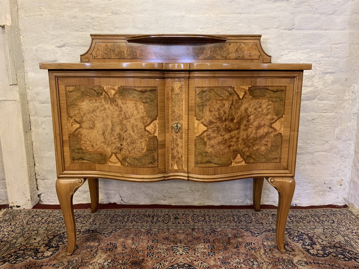 Made in striking burr walnut and in excellent condition. The raised back rail has a central shaped shelf. The crossbanded shaped top has herring bone inlaid decoration. Below are a pair of shaped lockable doors the doors having fabulous inlaid decoration. The doors open to reveal three drawers and an adjustable and removable shelf. Decorated sides, this stunning French cabinet stands on four cabriole shaped legs. There is a shaped glass removable protector for the top.