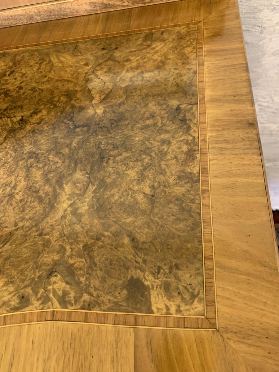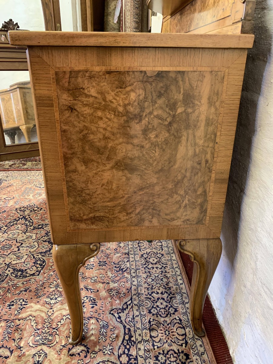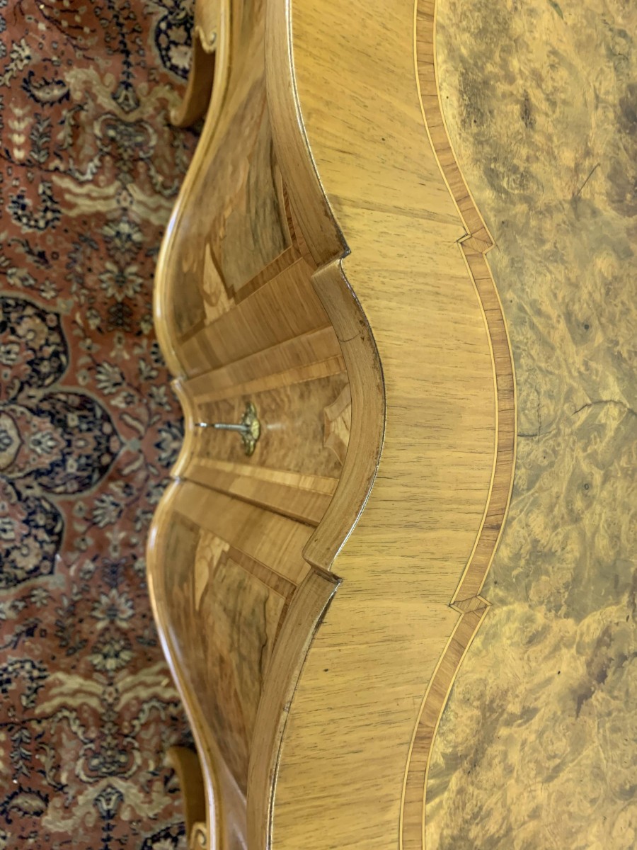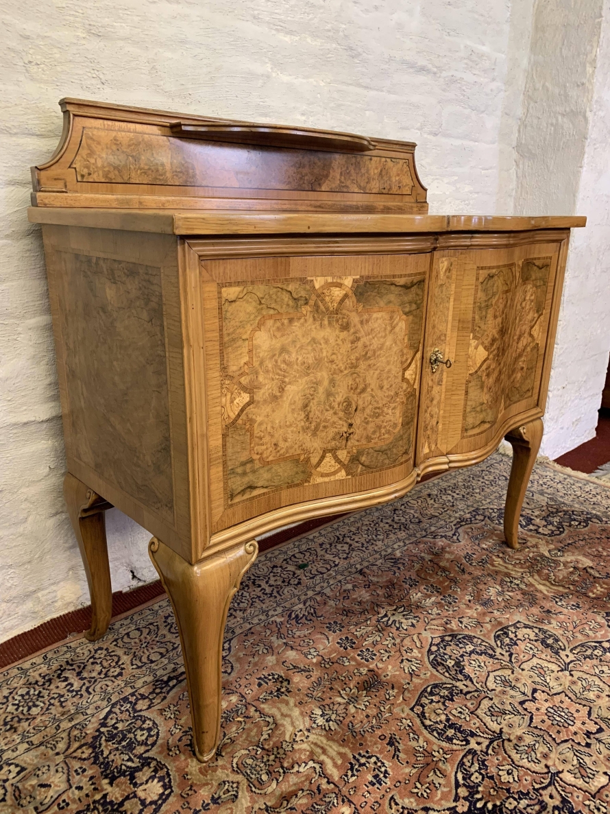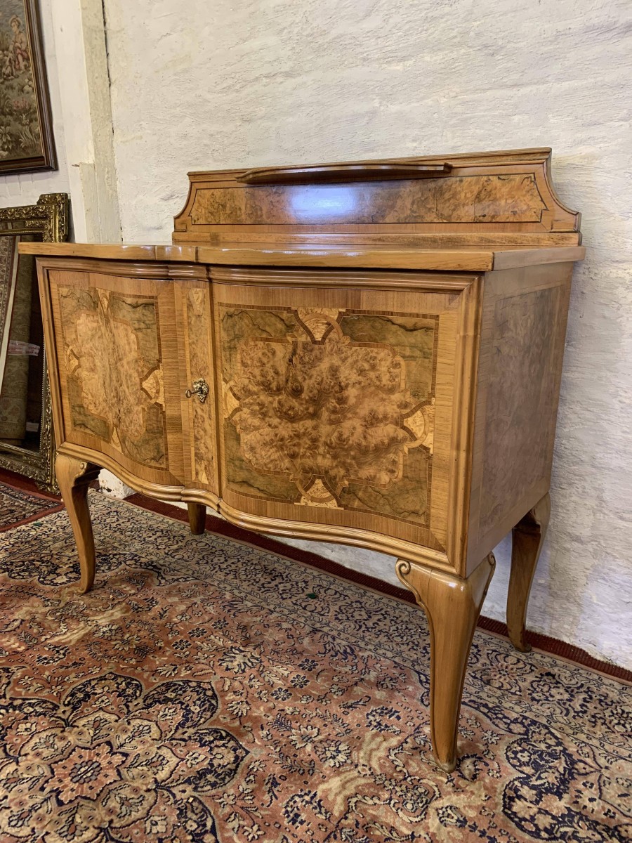 Made in striking burr walnut and in excellent condition. The raised back rail has a central shaped shelf. The crossbanded shaped top has herring bone inlaid decoration. Below are a pair of shaped lockable doors the doors having fabulous inlaid decoration. The doors open to reveal three drawers and an adjustable and removable shelf. Decorated sides, this stunning French cabinet stands on four cabriole shaped legs. There is a shaped glass removable protector for the top.
