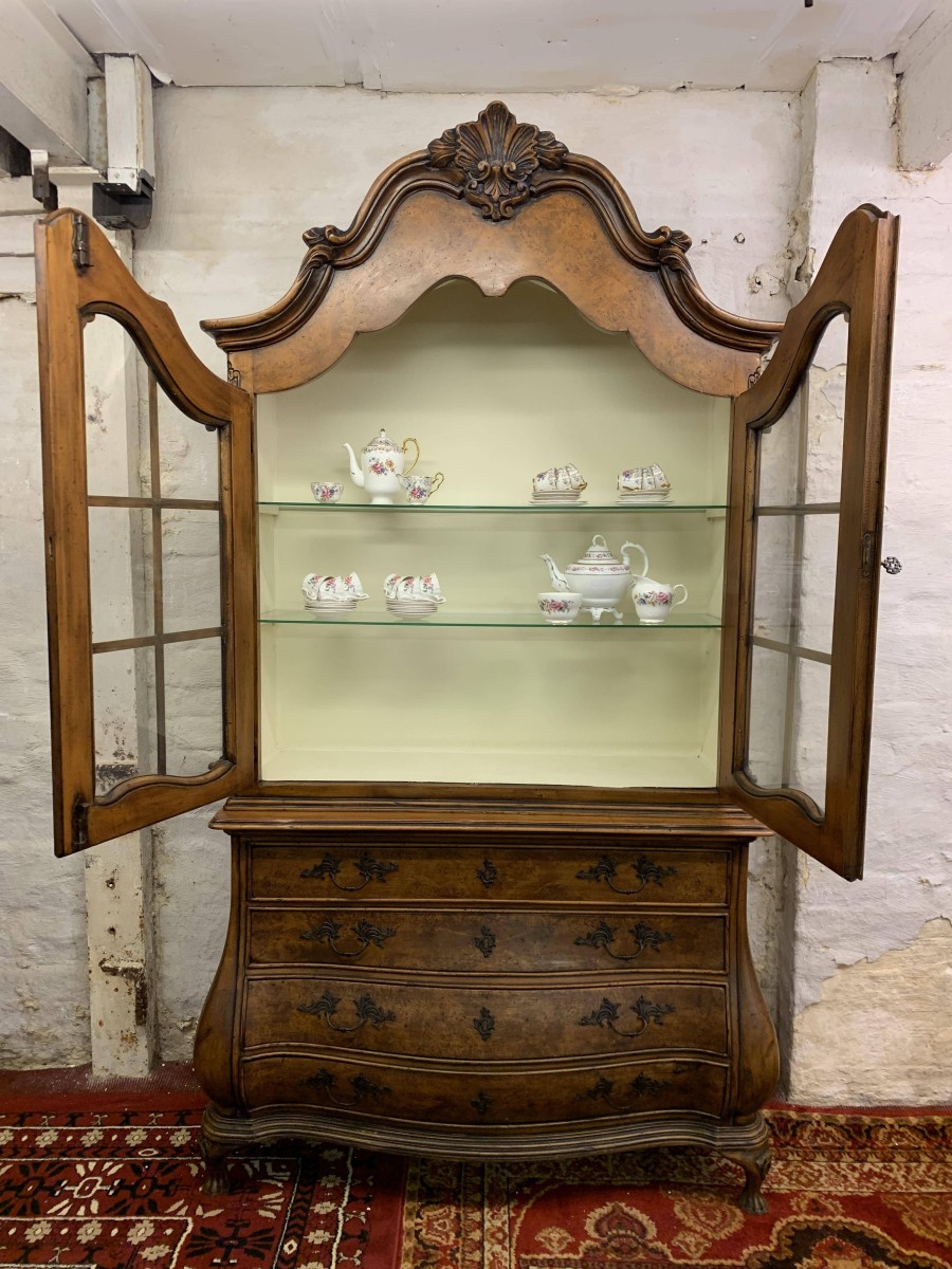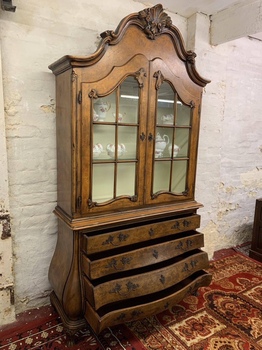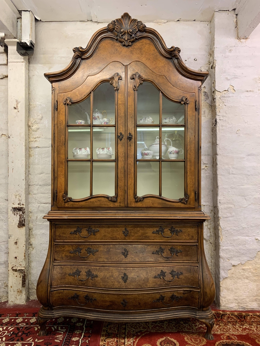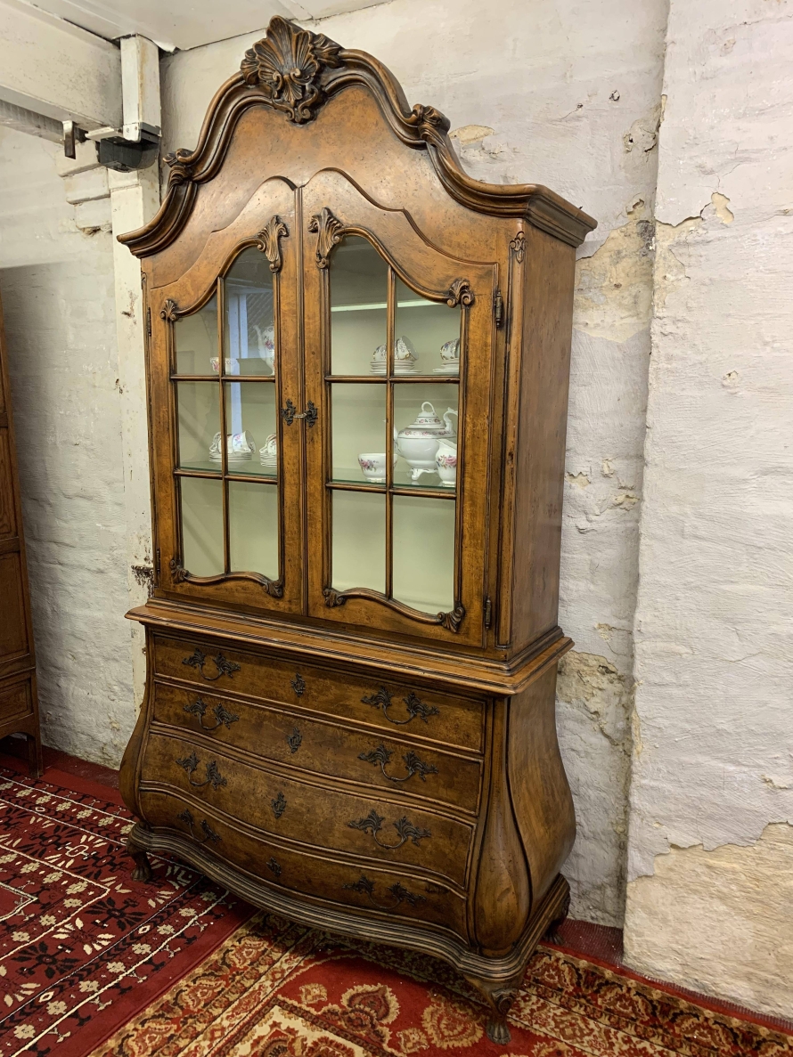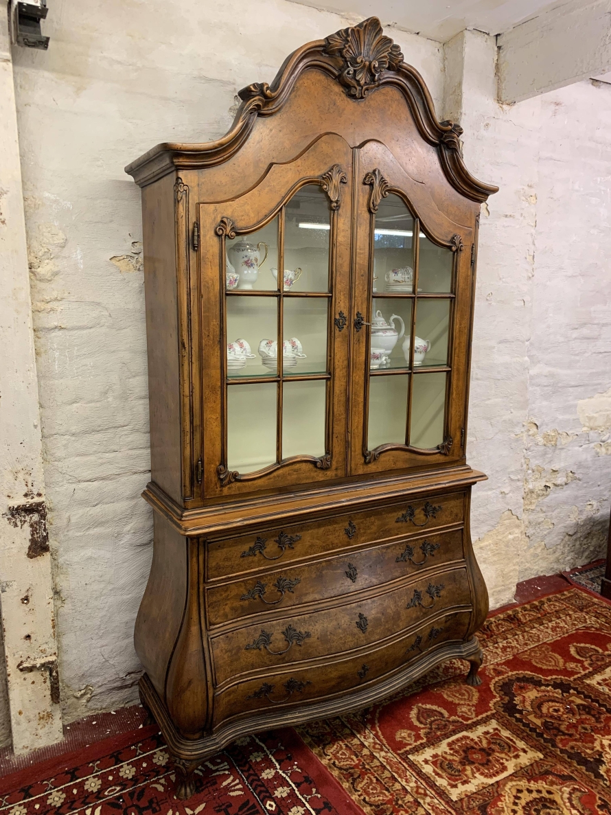 This fabulous bombe cabinet is in excellent condition. The shaped oversailing top rises to a central decorative carving. Below are a pair of lockable glazed display doors, the doors open to reveal two adjustable removable shelf. The bombe commode has four generously sized drawers, each drawer having a pair of ornate handles. This stunning bombe display cabinet stands on four carved cabriole legs with paw feet.
