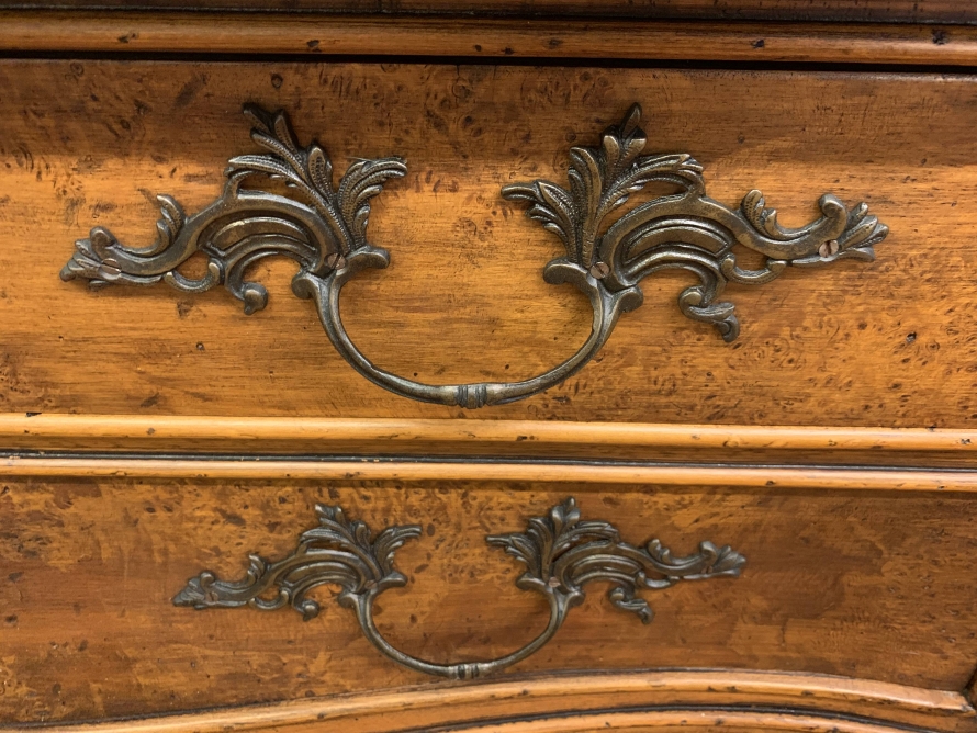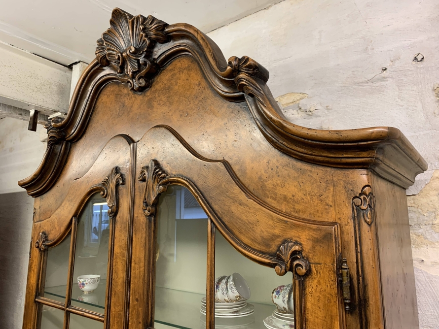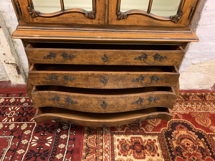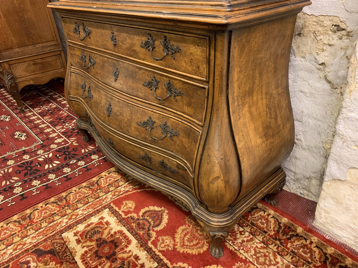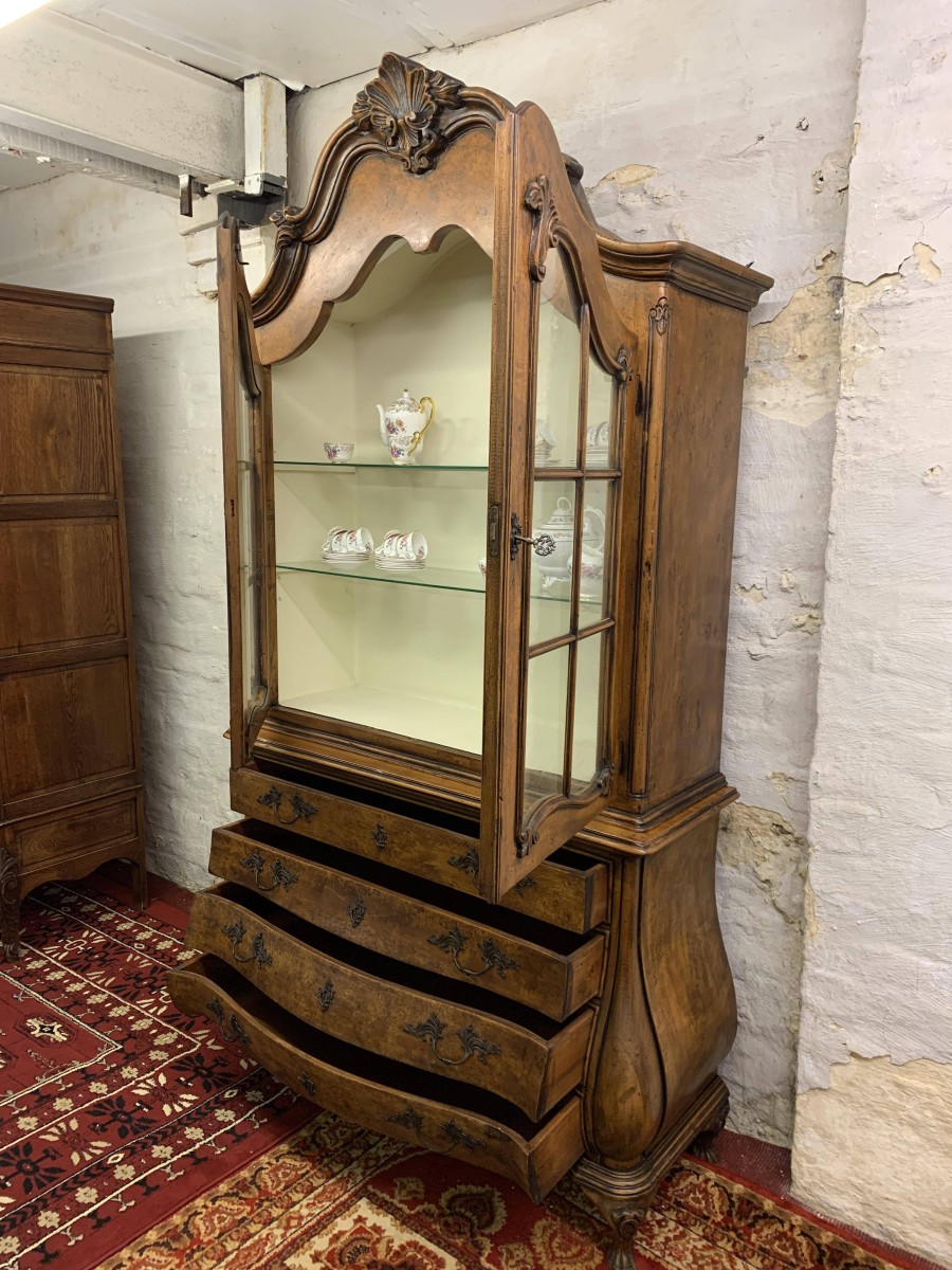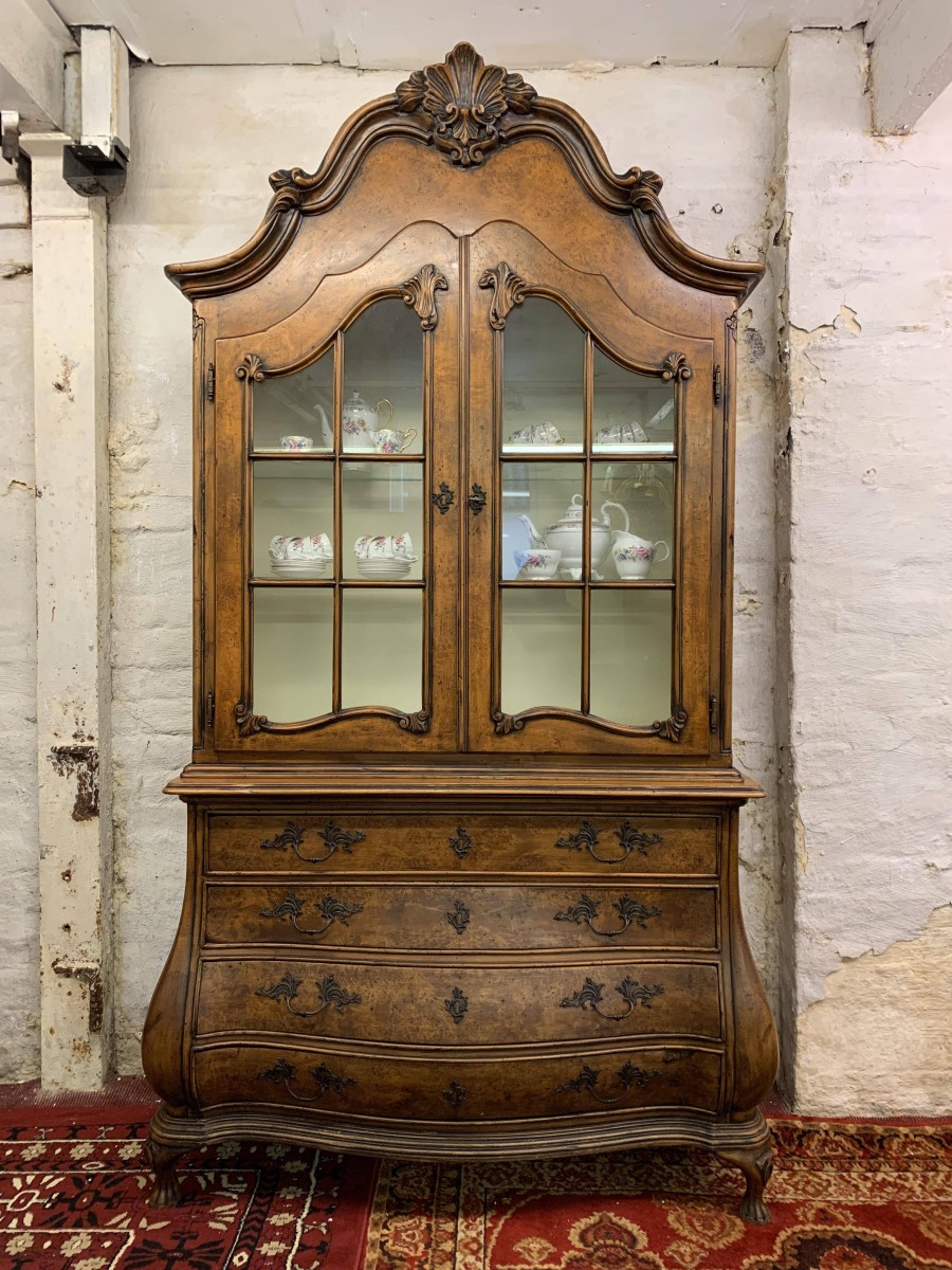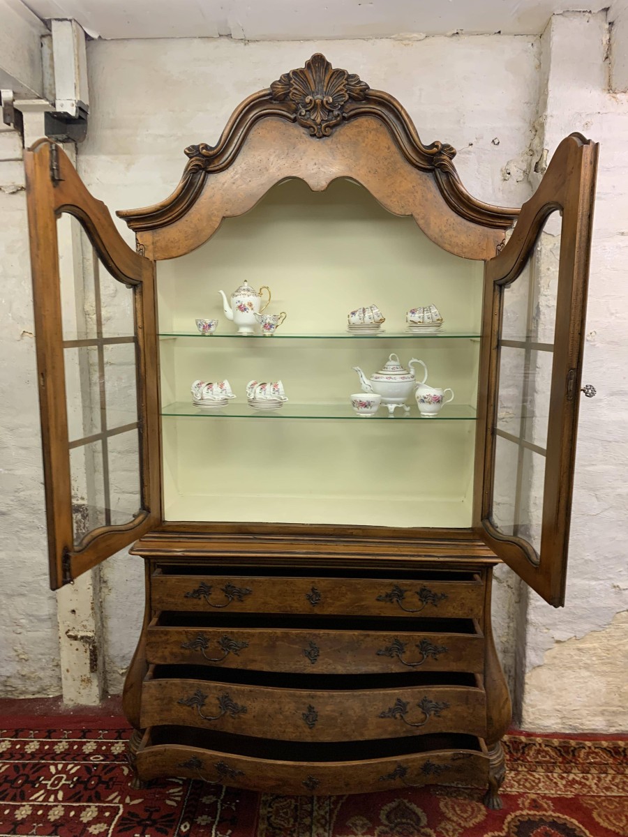 This fabulous bombe cabinet is in excellent condition. The shaped oversailing top rises to a central decorative carving. Below are a pair of lockable glazed display doors, the doors open to reveal two adjustable removable shelf. The bombe commode has four generously sized drawers, each drawer having a pair of ornate handles. This stunning bombe display cabinet stands on four carved cabriole legs with paw feet.